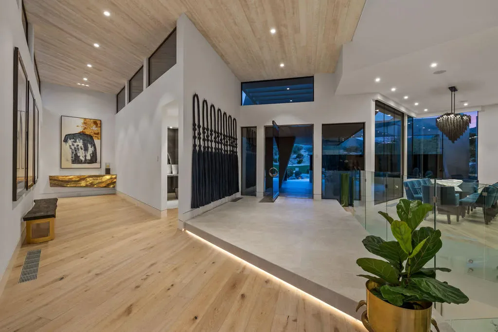 Located on a premier end lot overlooking the 14th green, this sculptural residence was fully reconstructed and reimagined by renowned architectural designer Guy Dreier. Offering unobstructed mountain and fairway views on three sides, walls of glass celebrate the setting from nearly every room. Arrival is dramatic, crossing a suspended bridge through a custom metal gate to a glass pivot entry door revealing expansive sightlines through the living room and beyond. The great room features soaring brushed white oak tongue-and-groove ceilings, pocketing glass walls with clerestory windows, large-format Italian tile floors, wet bar with waterfall-edge stone, a stunning see-through fireplace, Tambour wood detailing, and curated custom furnishings. The glass-wrapped dining room appears to float and showcases a striking multi-zone wine display with separate temperature controls. Open to both living and dining areas, the chef’s kitchen offers natural stone slab waterfall countertops, professional appliances, custom cabinetry, hidden appliance garage, generous island seating, and a morning room overlooking the fireplace, with seamless access to outdoor living via pocketing glass doors. The primary retreat captures Santa Rosa Mountain views and includes high ceilings, curved walls, contemporary lighting, fireplace, and walls of glass opening to a private patio, pool, spa, and lounge. The spa-inspired bath features dual Carrara slab vanities with backlit mirrors, freestanding tub, dual private lavs, separate washer/dryer, and two boutique-style walk-in closets with custom cabinetry. Three guest suites are located on the main level, each with private slab-finished baths and walk-in closets; two offer steam showers. A fourth suite is privately situated on the entertainment level. The lower-level lounge includes custom game tables, bar with refrigeration and ice maker, putting green in a sunlit atrium, guest powder room, second laundry, Full Swing professional golf simulator, and a 4K laser theater with 145” screen and premium surround sound. Outdoor living features desert landscaping, architectural pool and spa with fire features, sunken conversation pit, ceiling heaters, built-in BBQ center, and sweeping mountain and golf course views. Additional features include Control4/Lutron automation, specialty imported stone throughout, paid solar, three-car plus two-cart garage, and rare end-lot privacy.