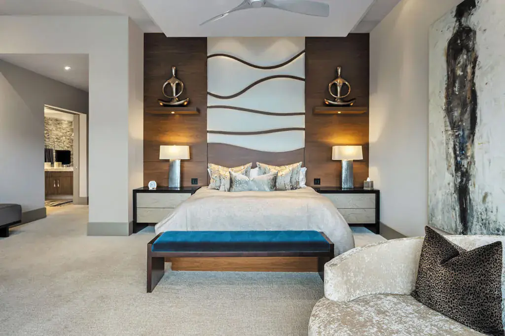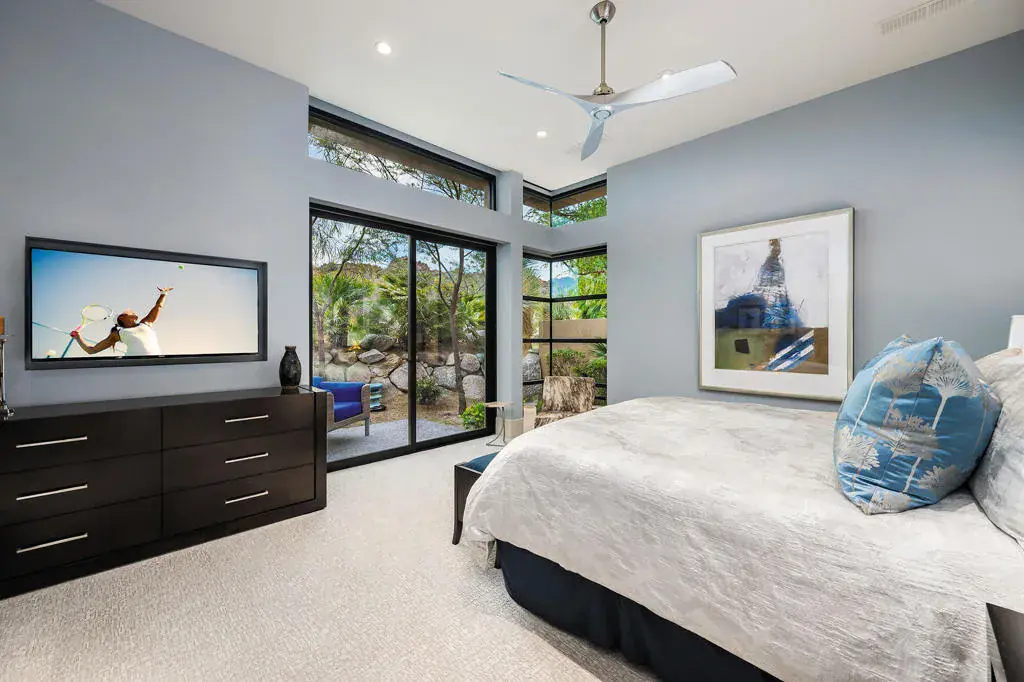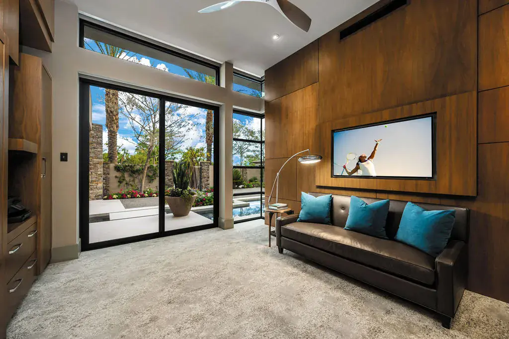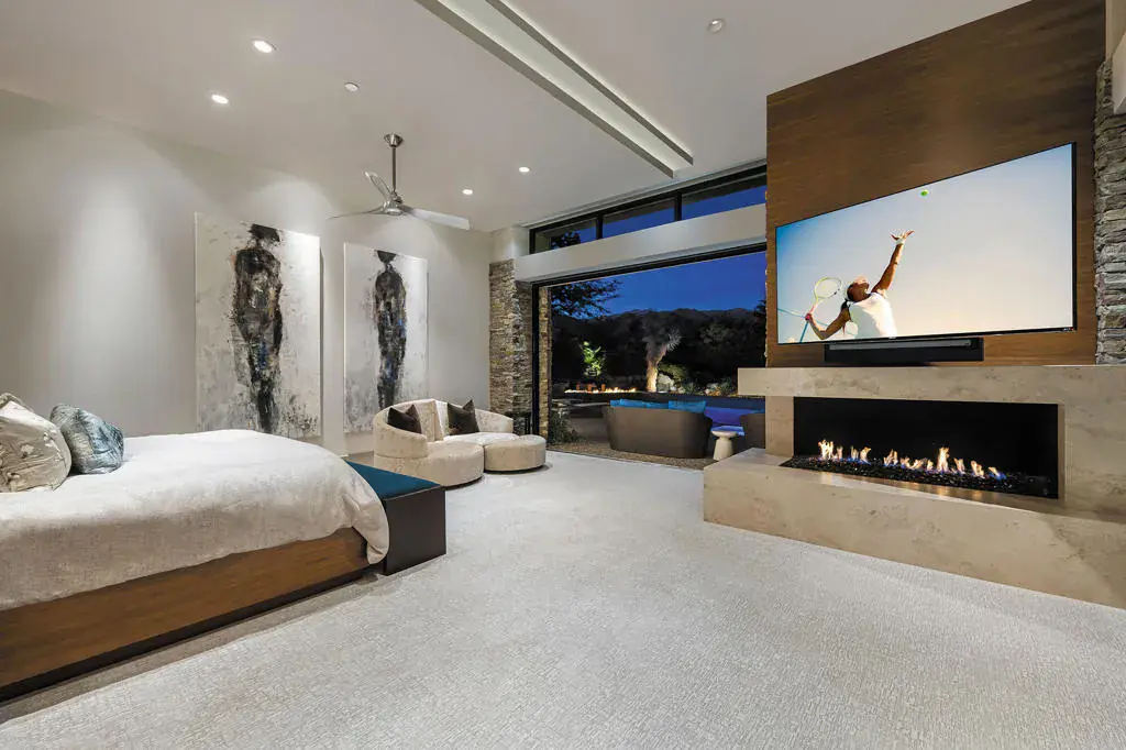 An exceptional estate that offers the best of desert living where entertaining without boundaries is just the start. A home where walls disappear providing a front row seat to breathtaking southern unobstructed views of the lake, golf course and mountains beyond. This property is designed for both leisure and lifestyle with exciting amenities including a rare 6 car plus golf cart bay with a private gated motor court which is just the introduction to all that awaits. The private courtyard with quiet water features and landscape lead you to the glass door entrance and from there you experience contemporary architecture that blends with refined, warm, livable, luxury. The attention to detail has created a private resort-style retreat designed for both entertaining and intimate everyday living. The great room opens seamlessly to the outdoors through walls of electronic pocket sliders, creating an invisible boundary between inside and out. Dual fireplaces, media, and sit down wet bar create the ultimate indoor/outdoor gathering space. A dramatic temperature-controlled wine display adds another custom feature. The primary retreat is a true sanctuary with pocketing floor to ceiling glass sliders, media and intimate fireplace; and also features a spa-inspired bath with his and her private lavs and generous closets, a slider off the stand alone tub providing serene connection to surrounding landscape. A separate office area with custom built-in shelving, and murphy bed. Four en suite bedrooms, including an attached guest house with two suites, a living room, breakfast bar and secluded spa grotto; two additional suites provide beautifully appointed comfort and privacy. At the heart of the home, the gourmet kitchen offers premium appliances, an oversized island, butler’s pantry, and a sunlit morning room with pocket sliders opening to the landscaping of the courtyard. Enjoy the outdoors with multiple outdoor entertaining areas including pool, spa, BBQ, firepits, and lounge areas all while enjoying surrounding nature and tranquil views. The warm contemporary finishes with wood details, natural stone, and curated textures throughout the home, all create a timeless yet modern aesthetic that feels both sophisticated and inviting. Owned solar. This is desert luxury reimagined…elegant, effortless, and unforgettable.