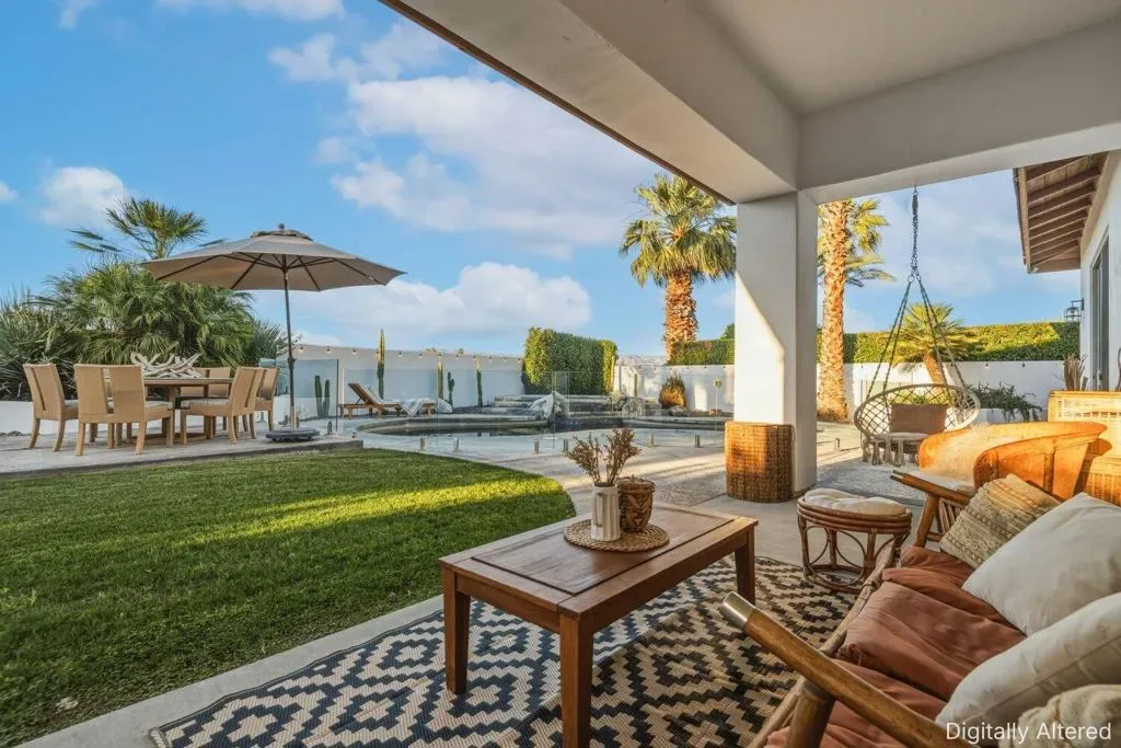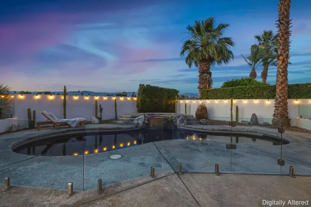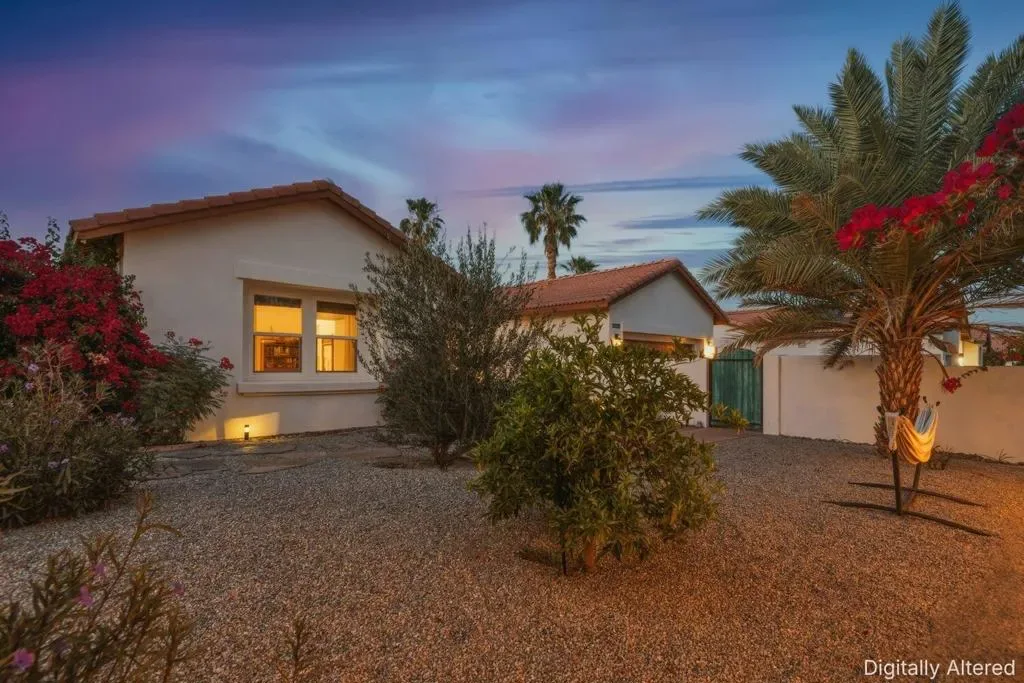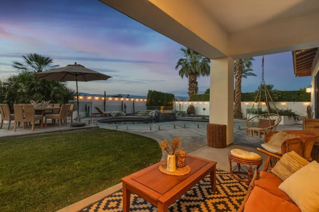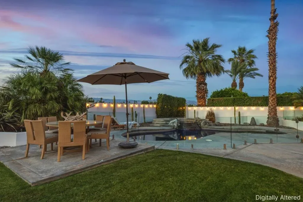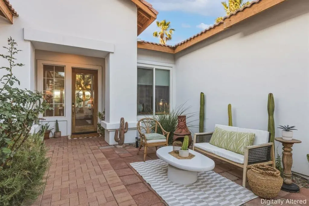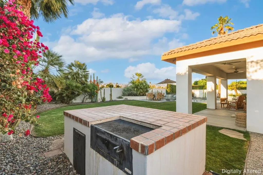 Experience a beautifully modernized residence showcasing exceptional upgrades and modern comfort throughout. Located in the highly desirable community of Canyon Crest, this home features 3 bedrooms plus an office/den that could serve as a fourth bedroom and comes fully furnished, offering a turnkey opportunity. At the heart of the home is a completely redesigned kitchen with high-end improvements, including all-new custom cabinetry, premium Quartz countertops, designer lighting, and a beautifully finished backsplash. Matching cabinetry extends into the living room to create custom built-in shelving and a media center. Comfort and efficiency are maximized with two brand-new AC units, a $24,000 upgrade ensuring year-round climate control and fully owned solar for energy savings.The home continues to impress with all-new flooring, fresh interior paint, updated baseboards, and new faucets and fixtures. Updated windows bring in natural light, and a custom glass pool enclosure adds style and function. Nearly $150K in upgrades have been completed over the past two years. The backyard features a pool with beach entry, raised spa, grassy area, vegetable gardens, desert landscaping, and a covered patio with mountain views and a built-in outdoor BBQ.