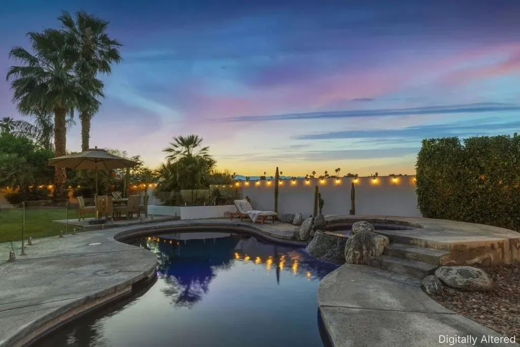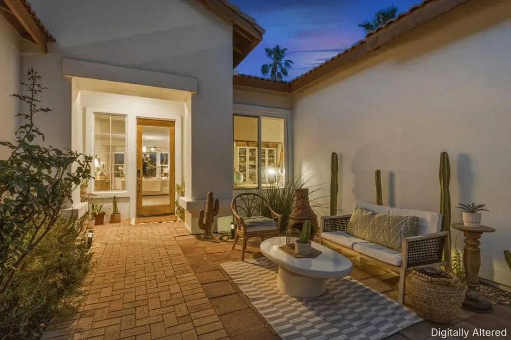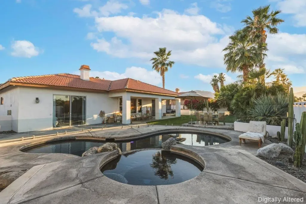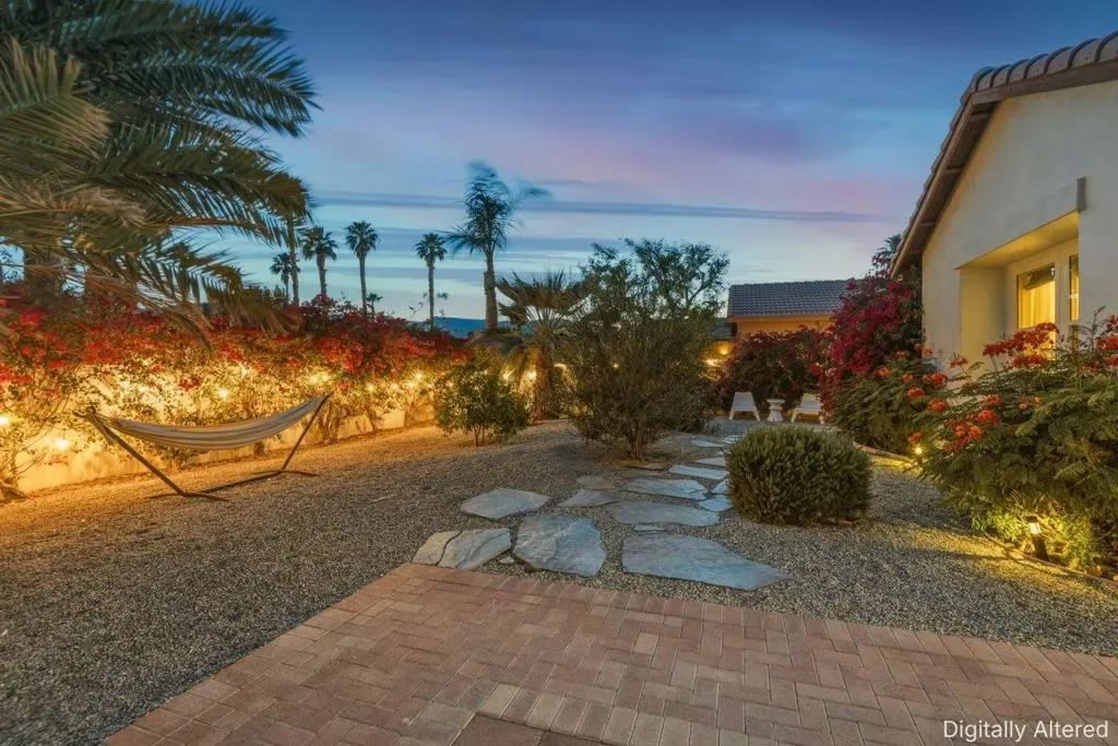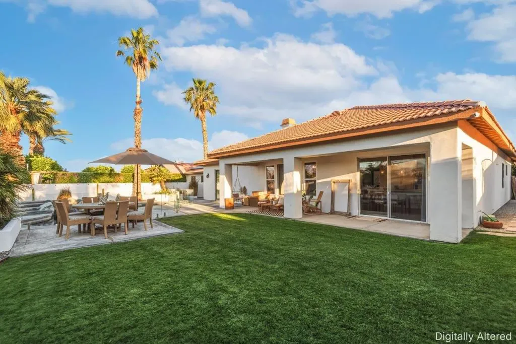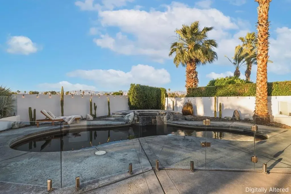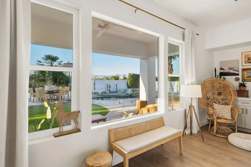 Experience a beautifully modernized residence showcasing exceptional upgrades and modern comfort throughout. Located in the highly desirable community of Canyon Crest, this home features 3 bedrooms plus an office/den that could serve as a fourth bedroom and comes fully furnished, offering a turnkey opportunity. At the heart of the home is a completely redesigned kitchen with high-end improvements, including all-new custom cabinetry, premium Quartz countertops, designer lighting, and a beautifully finished backsplash. Matching cabinetry extends into the living room to create custom built-in shelving and a media center. Comfort and efficiency are maximized with two brand-new AC units, a $24,000 upgrade ensuring year-round climate control and fully owned solar for energy savings.The home continues to impress with all-new flooring, fresh interior paint, updated baseboards, and new faucets and fixtures. Updated windows bring in natural light, and a custom glass pool enclosure adds style and function. Nearly $150K in upgrades have been completed over the past two years. The backyard features a pool with beach entry, raised spa, grassy area, vegetable gardens, desert landscaping, and a covered patio with mountain views and a built-in outdoor BBQ.