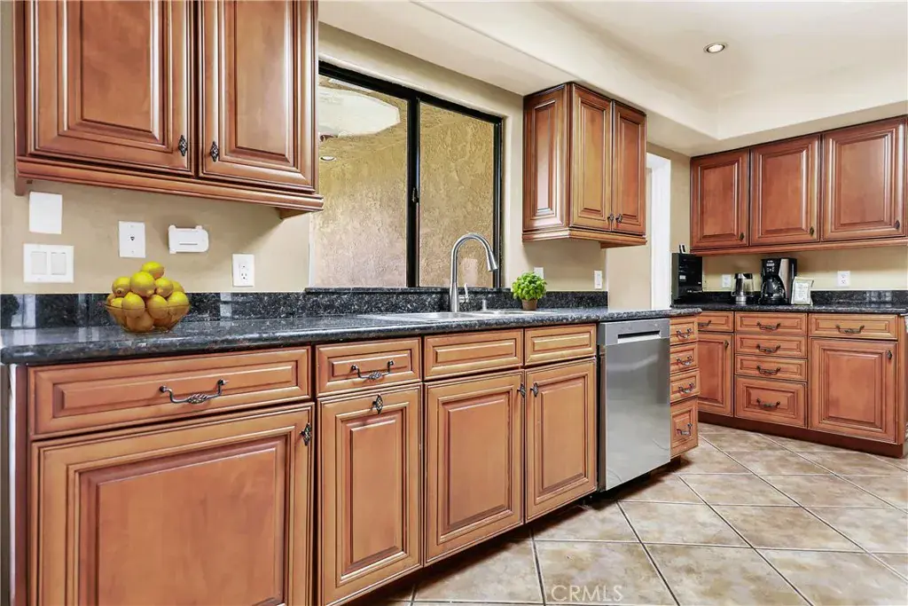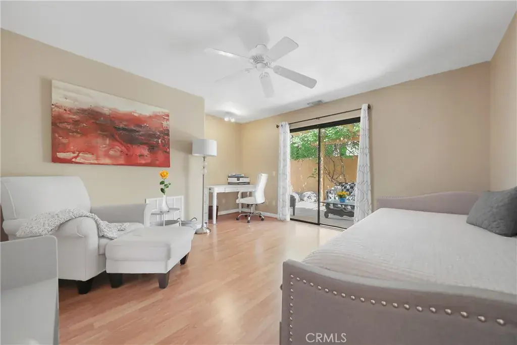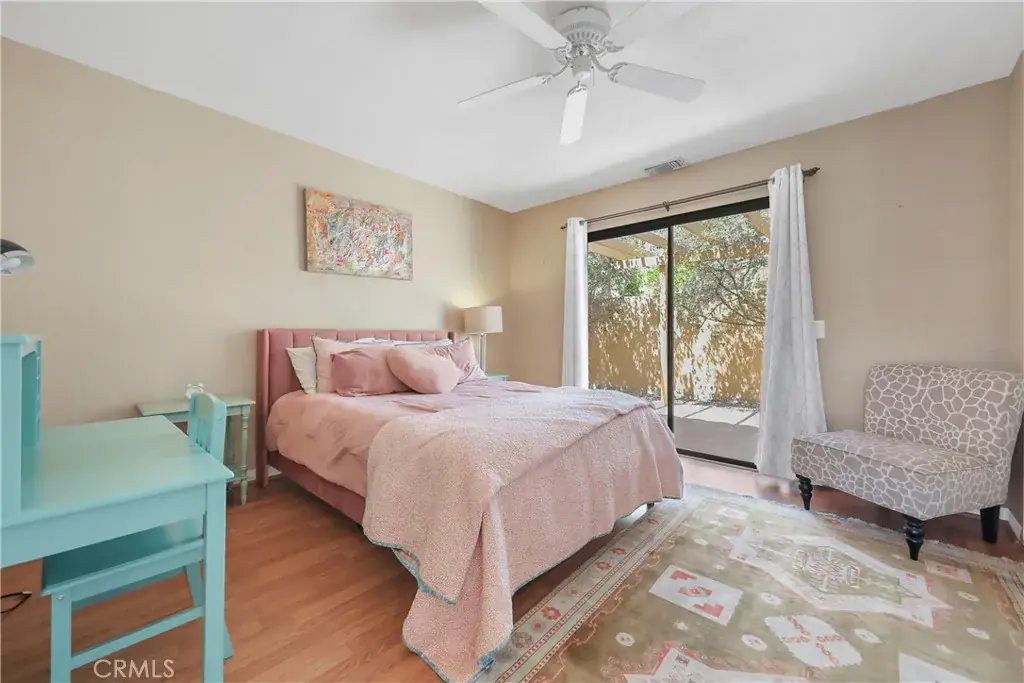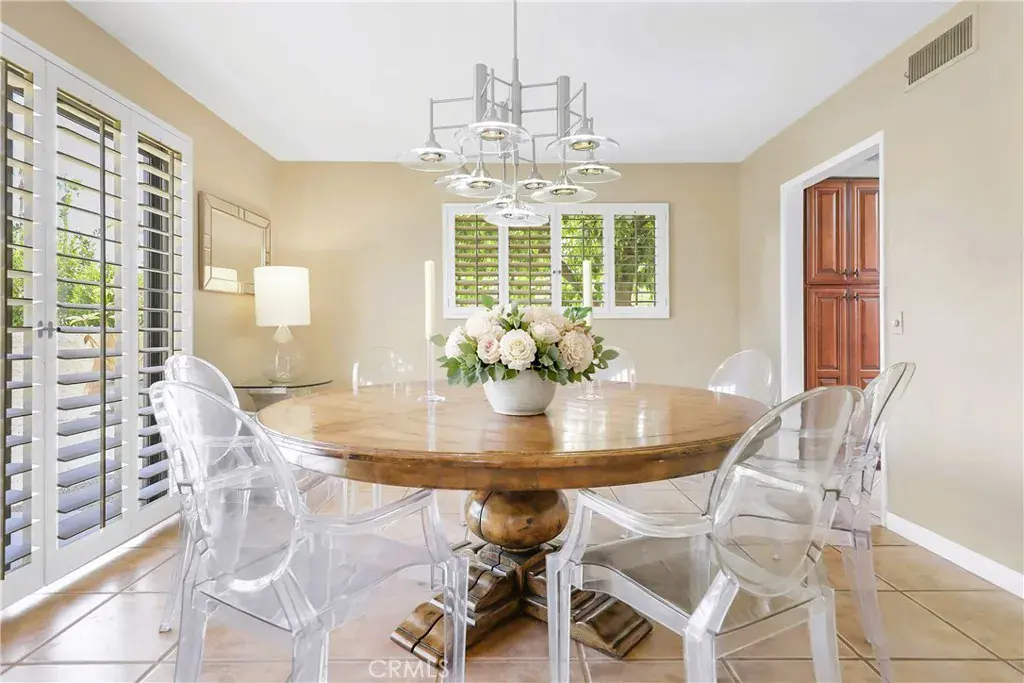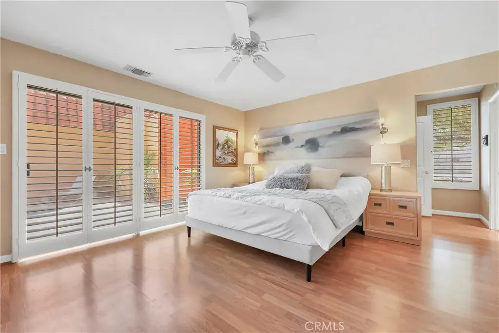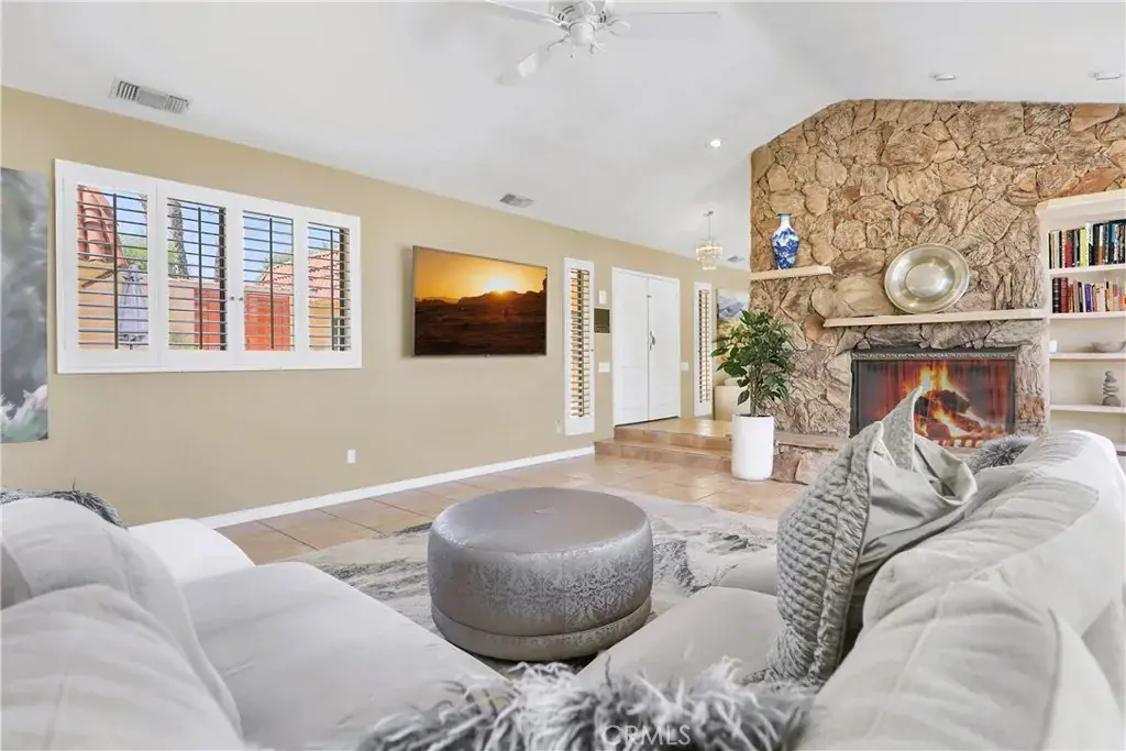 Designed with thoughtful elegance, the light-filled open floor plan features expansive sliding glass doors throughout, creating seamless indoor-outdoor living and access to four private patios. Wood and tile flooring, recessed lighting, ceiling fans, custom window coverings, two fireplaces, a wet bar, formal dining area, and separate living and family rooms enhance the home’s polished, modern aesthetic.