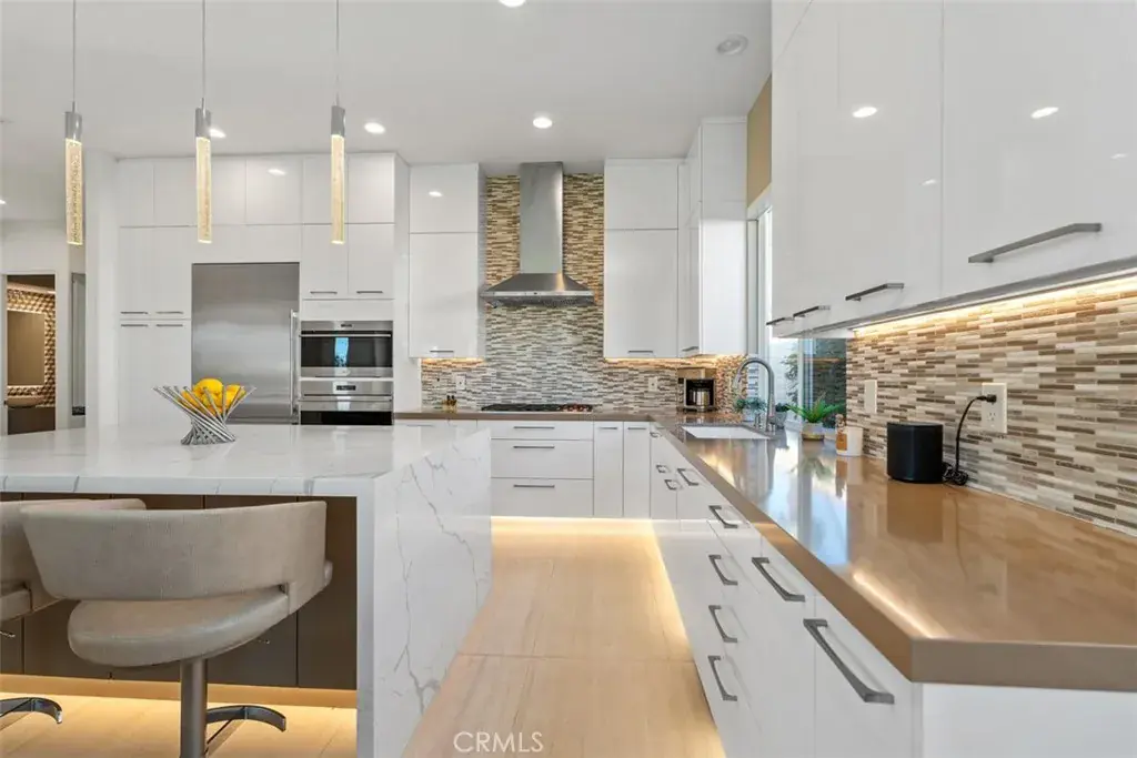 Inside, the remodel shines with elevated finishes and thoughtful design. The chef’s kitchen is a showpiece, outfitted with a built-in Sub-Zero refrigerator, Wolf 5-burner gas cooktop, and double ovens—perfect for everything from casual mornings to full-scale entertaining. Warm natural light fills the open living spaces, drawing your eye straight to the dramatic outdoor scenery.