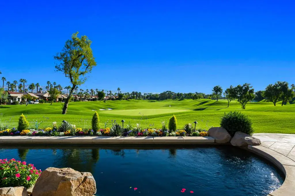 320 Bright Rock is one of those rare homes that has it all! Every inch, inside and out, has been totally gutted & remodeled in a chic, contemporary, light & bright style resulting in a one-of-a-kind masterpiece. Interior upgrades include: custom leaded glass door, 2 new A/C’s (2024-25), 36 solar panels, motorized interior blinds, pony wall has been removed, floor to ceiling stacked stone over the electric horizontal fireplace, 75” flat screen TV, interior & exterior sound system, plush carpet, interior security cameras, unique floor tiles, quartz counter tops with stylish backsplash, wet bar with wine cooler, all GE Monogram stainless kitchen appliances (refrigerator, cooktop, microwave, dish washer) glass pantry door, gold gooseneck faucet & white Blanco sink. All of the 3 bathrooms have been remodeled with new faucets, sinks & toilets. The primary bathroom has a stand alone tub & frameless shower and the exquisite powder room is a show stopper with elegant wallpaper, ultra modern sink & fashionable hardware. Exterior enhancements boast PebbleTec pool & rock waterfall spa, wind sensor awnings, pavered driveway, travertine walkway, faux grass in the courtyard, new landscaping/lighting & flowers galore. Perched on one of the best East facing elevated lots in Indian Ridge with unobstructed never ending views of the emerald green Arnold Palmer #14 Grove golf course & majestic mountain ranges in the background. Located in the HOA where your monthly dues include fire insurance, roof maintenance, all gardening (front, courtyard & rear) exterior water, tree trimming, painting, wi-fi, cable, pest control, & trash, all for stress free lock & leave convenience. Furnished per inventory including a shinny red golf cart. Club membership available with no wait.