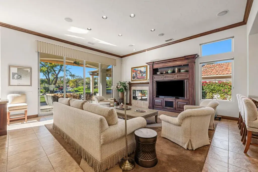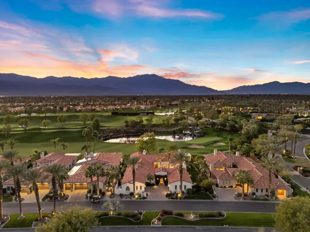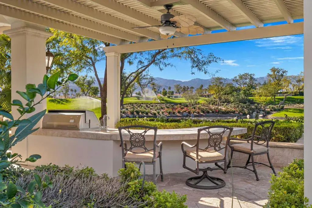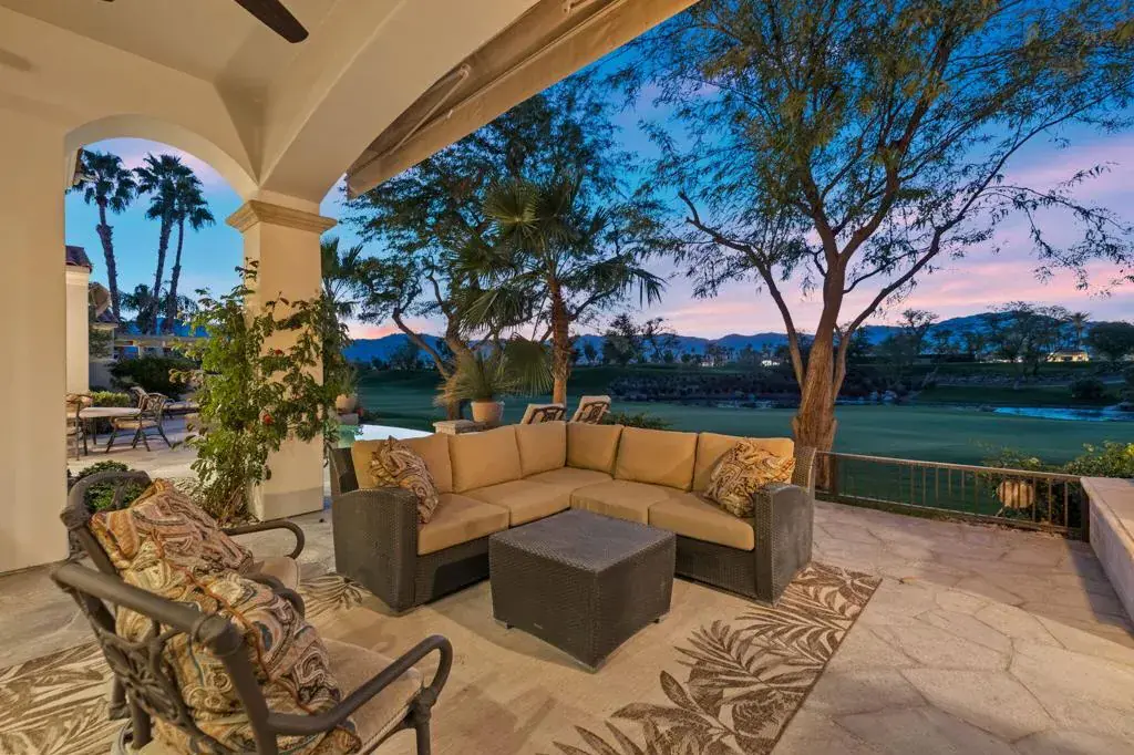 A truly rare opportunity to own the iconic Toscana Cortona 923 Prototype in prestigious Indian Ridge Country Club! This one-of-a-kind estate showcases timeless elegance, exceptional craftsmanship, and breathtaking desert vistas, all set on an oversize premium lot with views of the iconic waterfalls overlooking the 18th fairway of the Arroyo Course. Valley wide renowned builder, Bill Bone and Sunrise Corporation, saved the best lot for last to build this spectacular masterpiece within close walking distance to clubhouse, fitness, tennis & pickleball, spa and restaurants. Designed for both grand entertaining and everyday luxury, the residence features a spacious open floor plan with 4 bedrooms, 4.5 baths, including a two-room detached casita, ideal for hosting guests in comfort and privacy. Formal living and dining rooms flow seamlessly into a generous family room with wet bar and fireplace, opening to the gourmet kitchen appointed with granite countertops, a Wolf range, Sub-Zero refrigerator, large center island, walk-in pantry, and charming breakfast nook. The magnificent primary suite offers views of the golf course and mountains, dual independent bathrooms and walk-in closets, a gas fireplace, sitting area, spa-inspired soaking tub, and oversized double shower offering a true private retreat. Custom, high-quality finishes are found throughout, including built-in cabinetry, tile flooring, crown molding, shutters, remote-controlled blinds, and thoughtfully designed outdoor spaces. The resort-style backyard is the showpiece featuring a pebble-tech infinity pool and spa, paver patios, fountain, and built-in BBQ island–perfectly positioned to capture sweeping golf course, lake, waterfall, and majestic San Jacinto Mountain views. Offered decorated and designer furnished per inventory, this exceptional Toscana estate with 4-car garage delivers privacy, prestige, and unparalleled beauty–a dream home that must be experienced to be fully appreciated. The Golf Membership available with no waitlist is the cherry on top.
