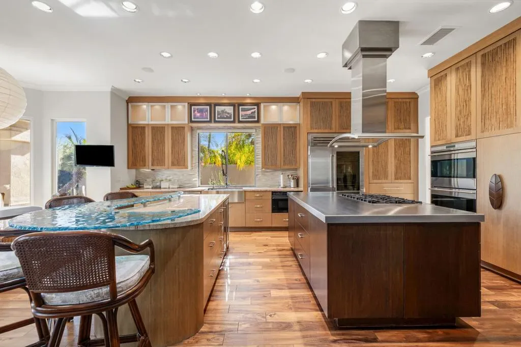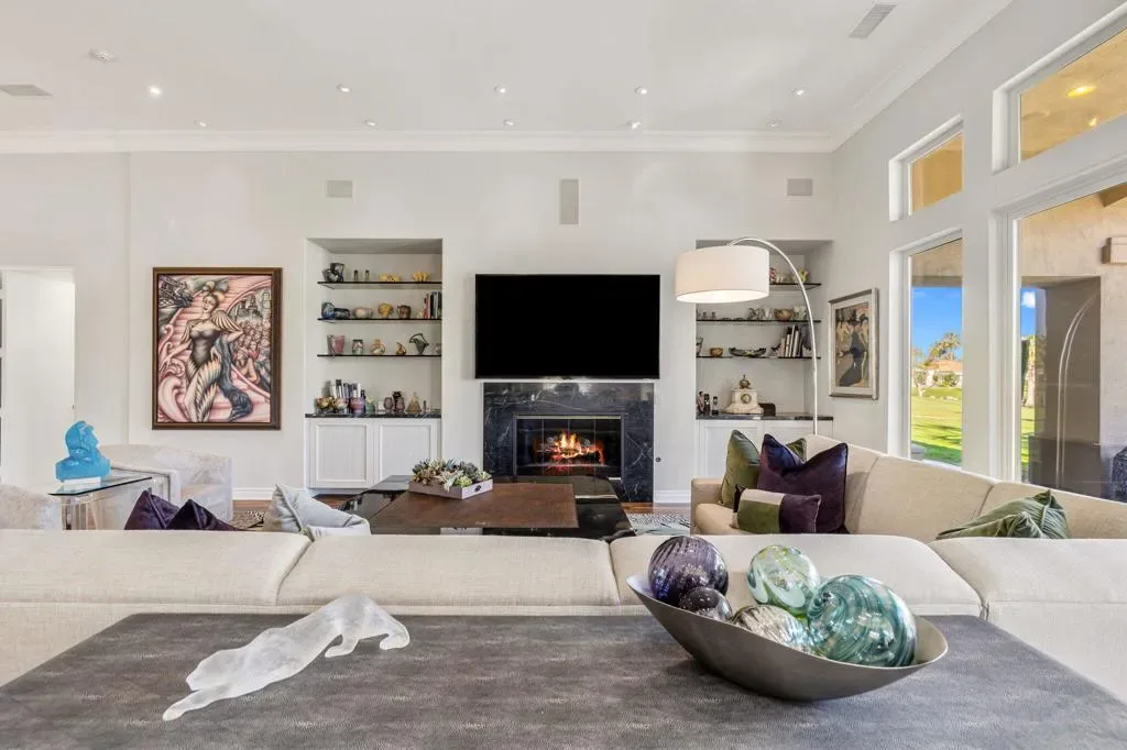 Enjoy sweeping fairway and mountain views from this beautifully maintained and highly sought after Ocotillo 1 floor plan at Indian Ridge Country Club. Designed for effortless desert living, the 3,082 square foot open-concept layout allows the living room, dining area, and kitchen to flow seamlessly to the outdoor patio – perfect for taking in the expansive golf course scenery. The home features hardwood flooring throughout, plantation shutters, custom wall finishes, and a newer HVAC system. The inviting living room is highlighted by a custom fireplace and built-in entertainment center, creating a comfortable space for relaxing or entertaining. The kitchen has been completely reimagined, offering an updated and stylish centerpiece for the home. Featuring upgraded cabinetry, quality appliances, and generous counter space, the space blends modern functionality with elegant design. The open layout and convenient breakfast bar allow the kitchen to connect effortlessly with the living and dining areas, making it ideal for both everyday living and entertaining guests. The primary suite opens directly to the patio and features a completely renovated bathroom, updated with a new walk-in shower, modern cabinetry, updated countertops, and dual sinks for a fresh and contemporary feel. Two guest bedrooms on opposite sides of the house feature en suite bathrooms, with one currently configured as a home office, providing flexibility for guests or remote work. The home also includes an attached two-car garage plus a separate golf cart garage. Situated on an approximately 8,700 square foot pie-shaped lot, the property offers potential space to add a south-facing pool, spa, or casita, creating an opportunity to further enhance the outdoor living experience. Offered partially furnished per inventory. Solar lease with panels installed in 2024 – can be paid off during escrow. Sellers have a Provisional Golf Membership. Indian Ridge Country Club offers an exceptional lifestyle with two Arnold Palmer Signature golf courses, tennis and pickleball facilities, fitness center, full-service spa, and a vibrant social and dining scene.