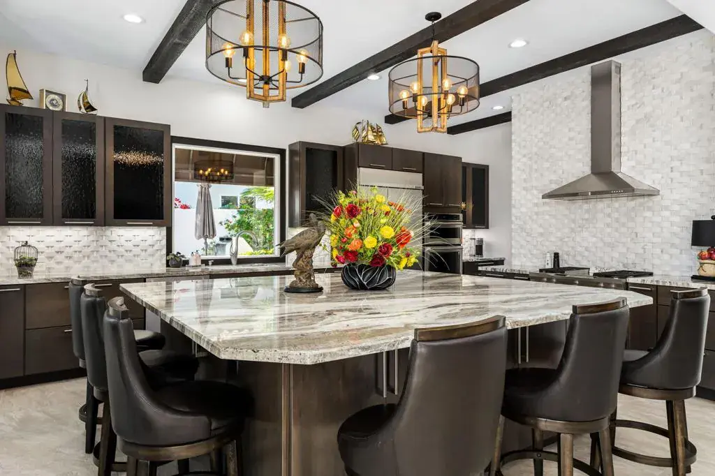 Experience desert luxury living in this impeccably reimagined 4 bedroom, 5 bath residence with casita, perfectly situated with southern views, inside the exclusive Indian Ridge Country Club. Masterfully redesigned by an acclaimed designer in 2019, the 3,371sf. showpiece was transformed into a celebrity-level retreat, so exceptional it became one of only two homes featured in an NBC home design series. A custom enlarged entry front door sets the tone for the refined elegance inside. Expansive oversized tile flows throughout, paired with imported luxury interior doors, all new premium windows & sliders, and three stunning large French doors that enhance the homes airy modern aesthetic. At the heart of the home is a chef’s kitchen of remarkable scale, anchored by an 8 by 9 foot granite island-among the largest in Indian Ridge. The reimagined butler’s pantry, premium KitchenAid appliances, all new cabinets and deep pull-out drawers, architectural ceiling beams, & additional under-counter refrigeration make this a space designed for elevated cooking, gathering and entertaining. The great room exudes sophisticated comfort with its dramatic floor- to-ceiling stacked stone fireplace, elegant wet bar & 75” flat screen. A 16 foot sliding glass wall pockets completely away, blending indoor & outdoor living. The expansive south-facing travertine terrace features multiple seating areas, a spillover spa, firepit feature, oversized pergola, built-in Alfresco BBQ & bar, and immersive indoor/outdoor sound system. Serene lake views, flowing streams & panoramic south mountain vistas complete this exceptional setting. Each ensuite bedroom is individually curated with luxurious stonework and custom cabinetry. The primary suite offers large French doors to the spa terrace, dual walk-in closets, and a beautifully designed frameless shower. A custom office adds functional elegance with custom built-ins and a dual-workstation layout. Additional upgrades include two new HVAC systems, Bradford White water heater, security cameras, epoxy-coated garage floor, new premium garage cabinets, three built-in safes, a climate controlled garage with mini split A/C, Moen leak detection, and highly energy efficient owned solar. Offered fully furnished with exquisite designer pieces, including the premium LUXE golf cart. Club membership is available with no wait.