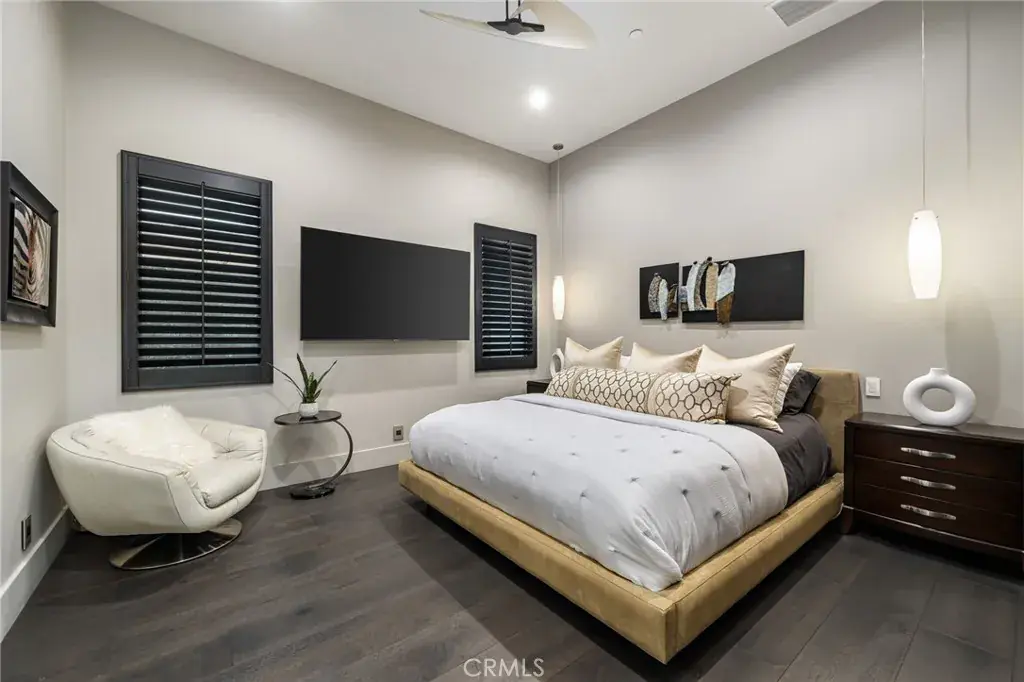 The home spans 6,265 square feet across a private 19,600-square foot lot, designed with a modern, organic, desert centric architecture that blends seamlessly with its natural surroundings. An elegant motor court, framed by palms, water features, and desert landscape welcomes you home. Inside, refined living spaces and walls of glass with 14 foot ceilings open to breathtaking views at every turn. A modern, entertaining kitchen with seating for many, a butler’s pantry with coffee bar, a mountain view dining room, a 1,500-bottle wine room, a private viewing room with huge pivot doors, and a gym, all elevate your everyday living. Each of the four ensuite bedrooms offers its own retreat, including a luxurious private casita with a spa-inspired bath with waterfall shower. The primary suite enjoys exceptional views, two walk-in closets, fireplace, sitting area, and direct access to the pool and spa—perfect for savoring desert nights in solitude.