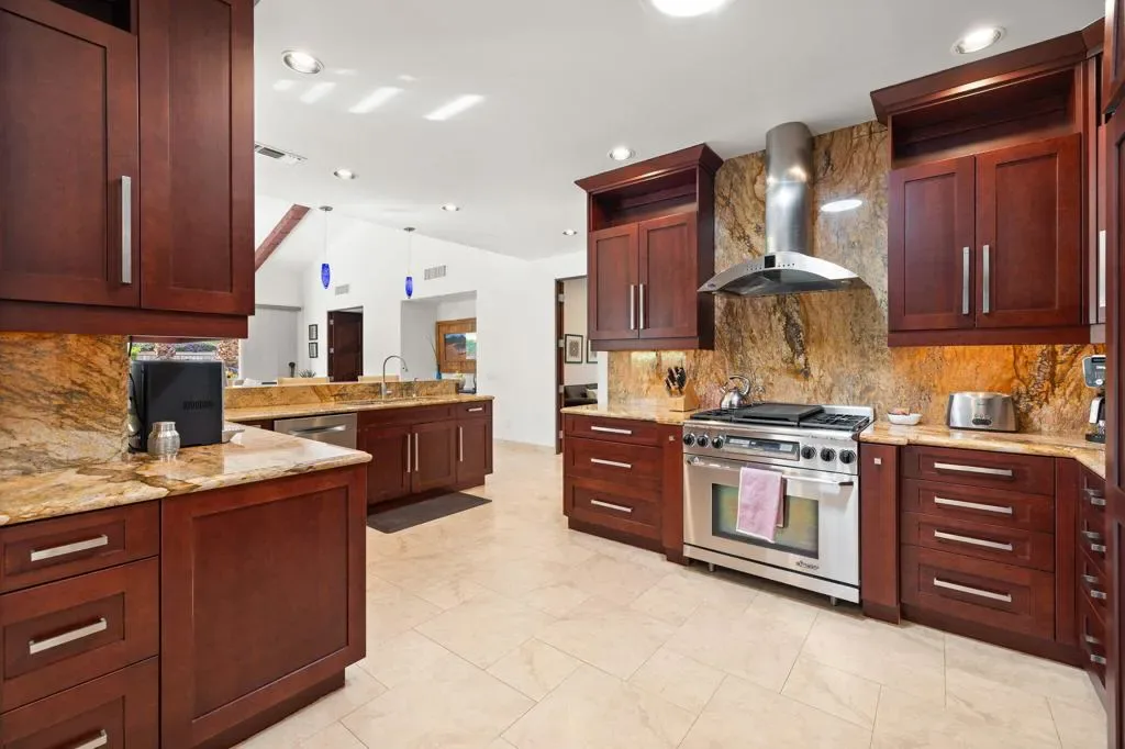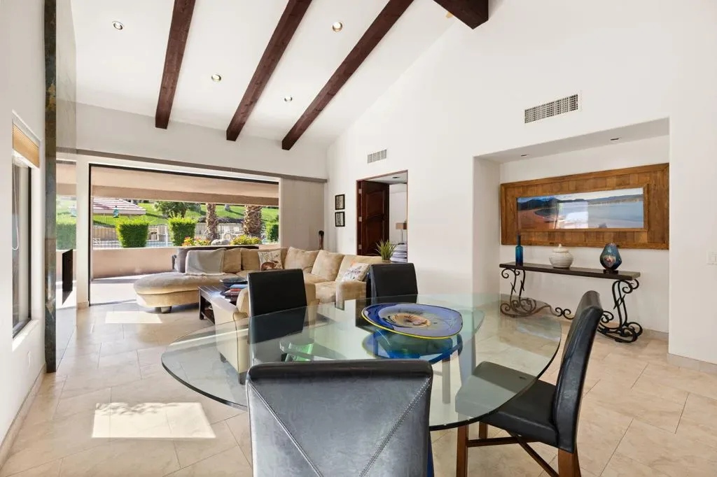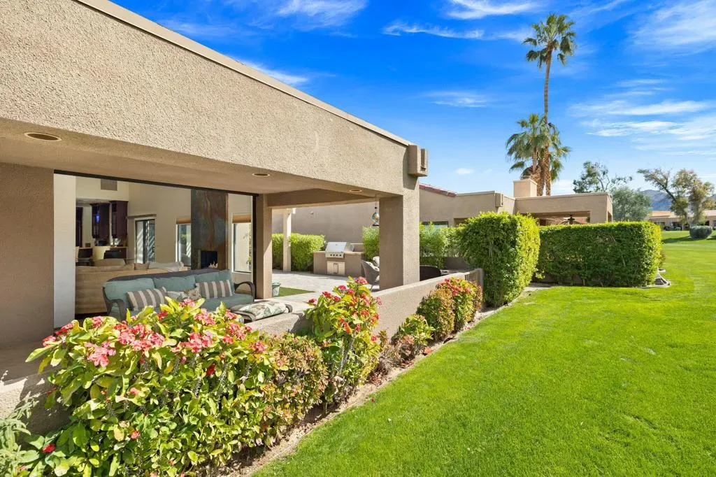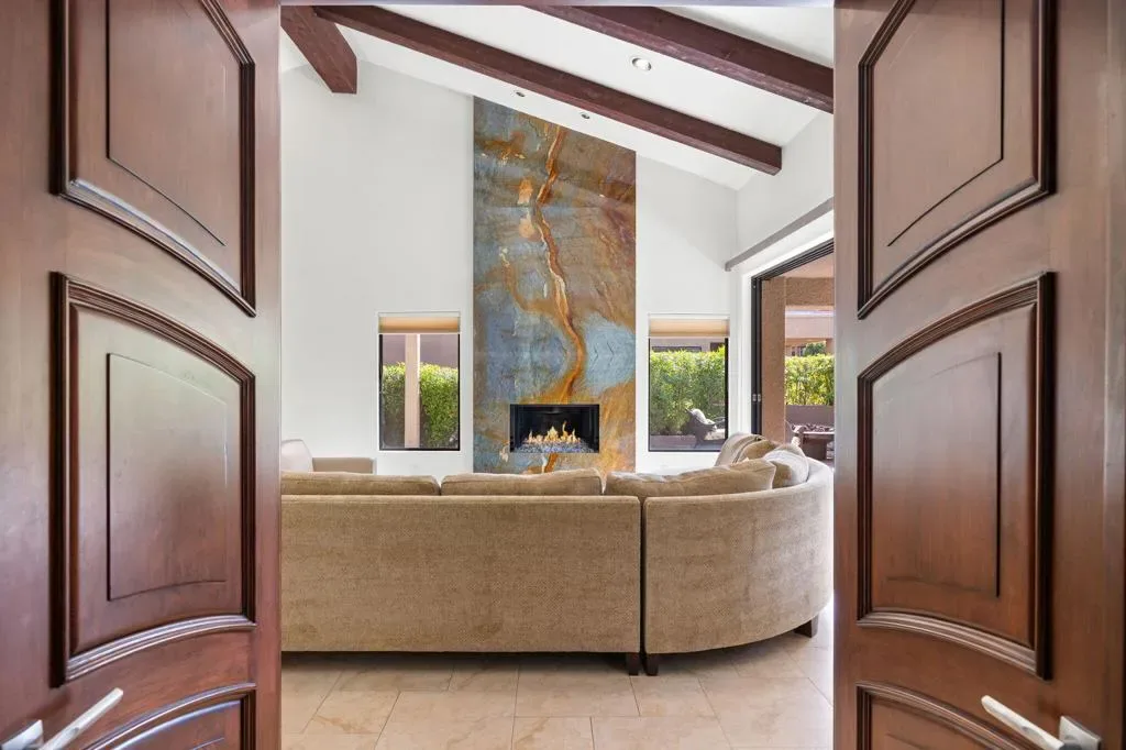 Major remodel. Taken to the studs and strapped to the slab foundation. New electrical. Ceilings raised to 10 feet from the typical 8 ft. Fireplace raised and exquisite DaVinci marble slabs placed with matching details. Expanded to the property line with only the top quality materials and workmanship. No expense spared. One of the largest freestanding Skyview home and unlike any other. With so many unique features, it is hard to know how to list them all. The view across the golf course toward the mountains to the South are captivating. To enhance the view, the Western glass sliders across the rear of the great room disappear completely into the wall. The home offers additional privacy due to the generous greenbelt on the right side. The nearby community pool is conveniently there. The Paradise Theater brand cinema room is an enclosed room with a 4 K laser projection system, leather seats from Belgium, 5 layers of sound insulation, lead lined walls, custom designed HVAC system to minimize the noise. engineered for an amazing experience equal the best commercial theaters for unmatched acoustics and visual images on a large 120 inch screen. It will transform your enjoyment of watching movies, sports and news. Like being the the theater, but your own private theater! The expanded kitchen and eating area offers a superior dining experience. The kitchen is thoughtfully designed with a 6 burner gas cooktop and oven, a stainless hood, granite countertops and stainless steel sink. And a SubZero refrigerator, of course. All integrated into an open floor plan. Additional square footage was added to gain access to the garage directly from inside the home, to expand the informal eating area, to add the theater room and to expand the primary bath and primary bedroom, now 25 ft. long. It now feels and is luxuriously large. Custom shower and cabinetry. The 3rd bedroom has it’s own bathroom. It is currently used as an office. You will sense that no expense was spare. The massive paver stone and tile patio wraps around and has the unique feature of being one of the very few that is enclosed. There you will find a pergola, a gas firepit and gas built-in BBQ. A pet-friendly yard is a very rare find. Association VII consists of 86 homes, all freestanding and the dues include EARTHQUAKE INSURANCE.