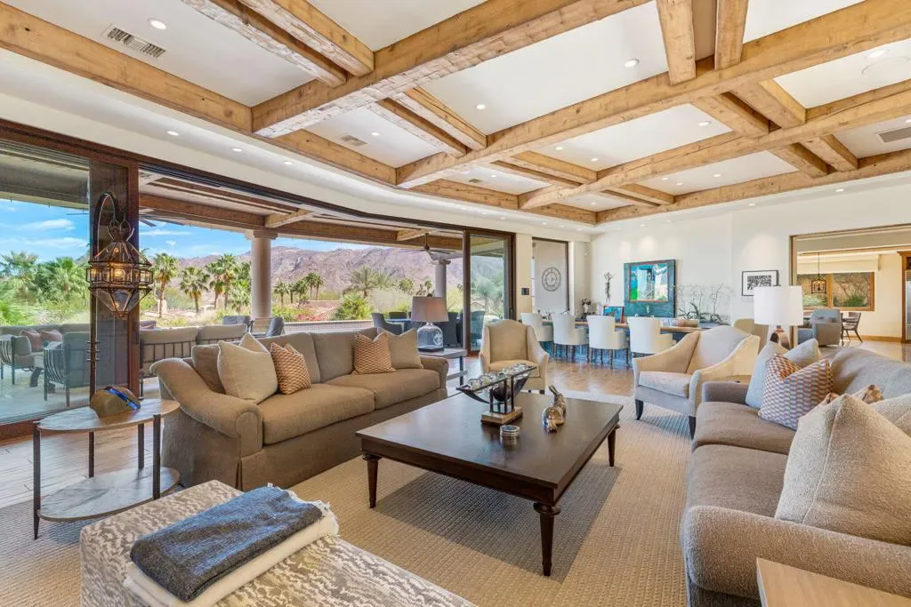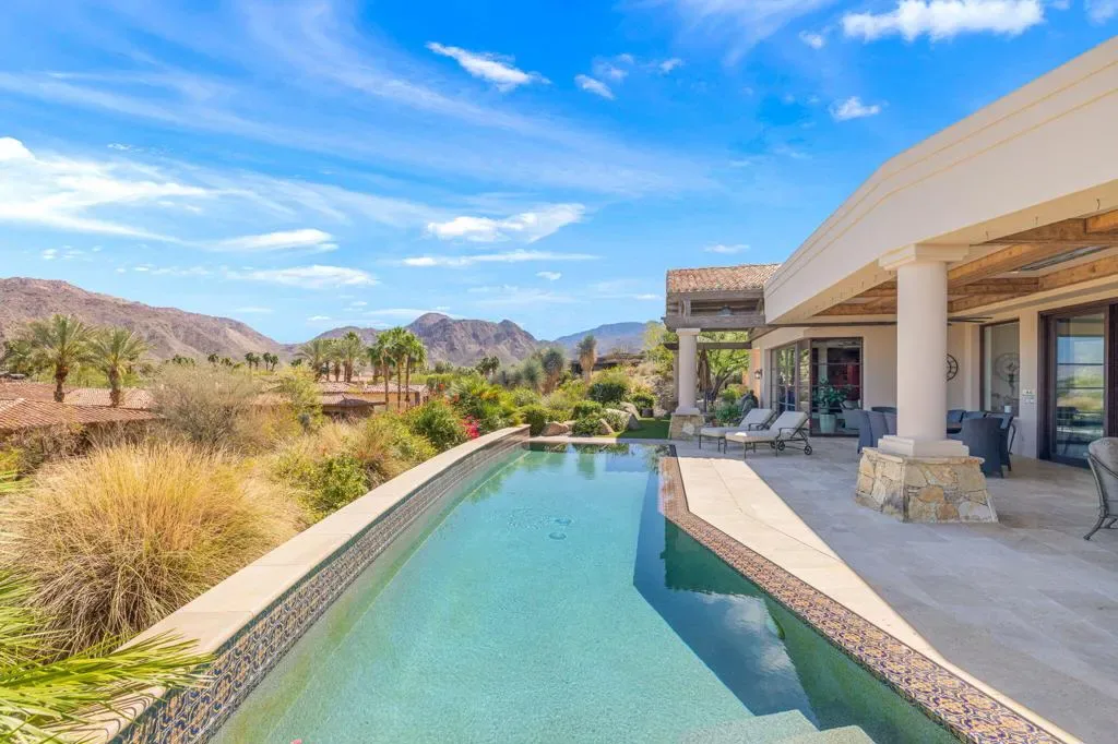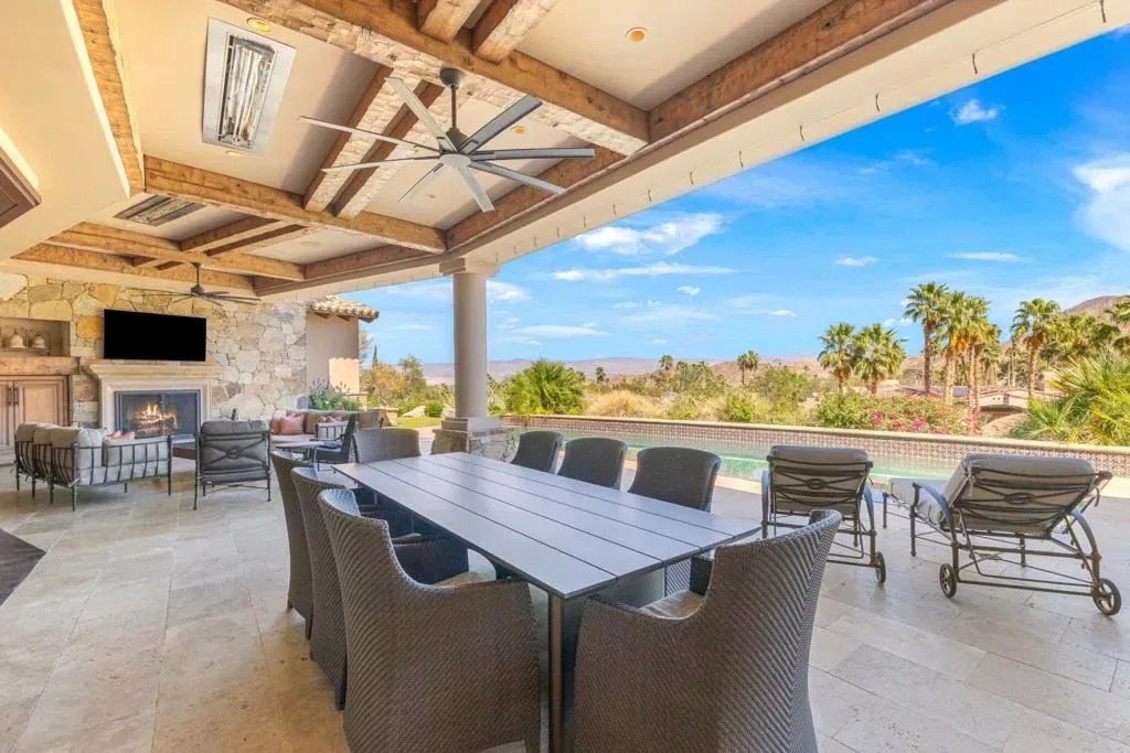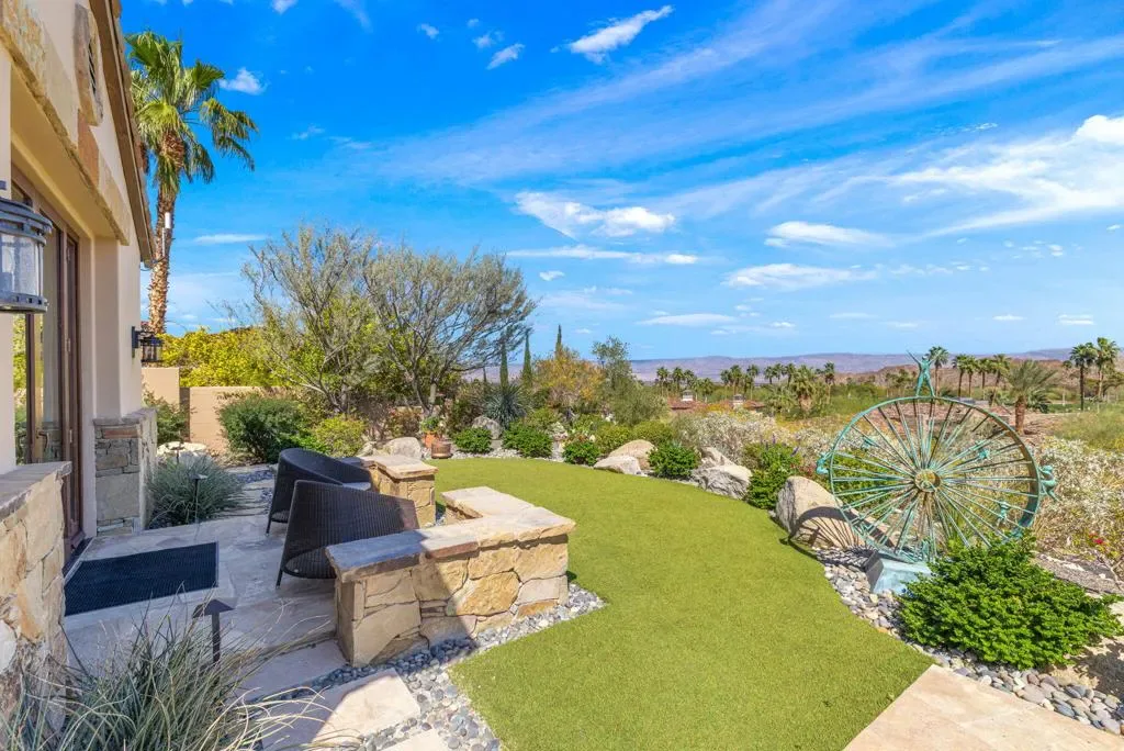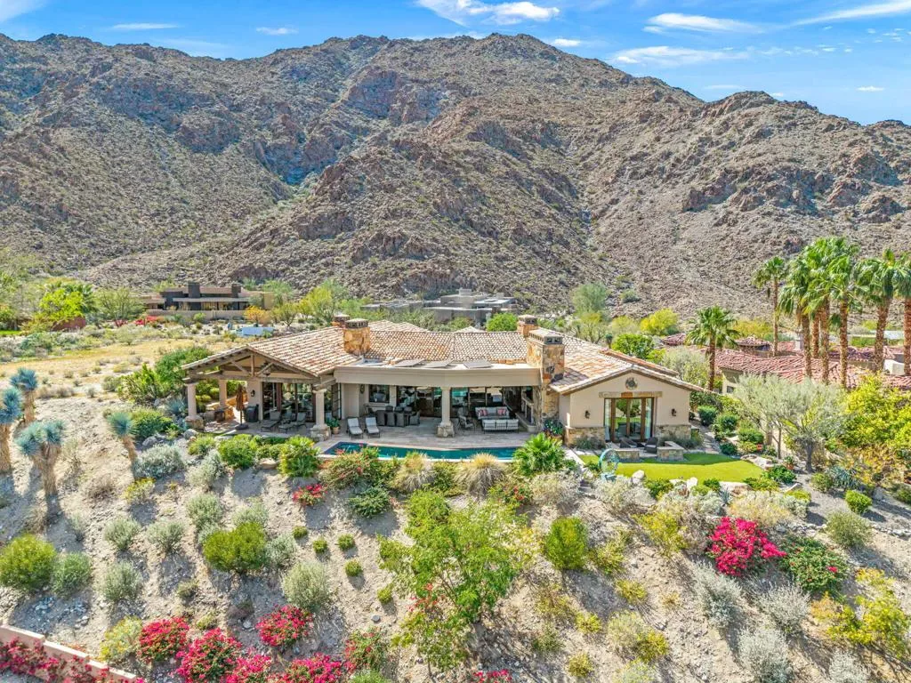 An masterful blend of contemporary touches and a timeless architectural design. This 2006 custom built home is situated up high for unmatched views of the mountains and valley. Impeccable layout for privacy and luxury living. Nestled on a cul-de-sac lot is this 3 bedroom plus an office, 5 baths with 5,066 sq. ft. of living space. The wood plank floors seamless transition to porcelain tile flooring. The 1 bedroom, 1 bath casita offers privacy and all the amenities one would ever want. The open floor plan is here for gracious entertaining. The bar area offers sitting for 6, a SubZero refrigerator and an ice maker. Tall wood framed glass sliders in the great room disappear into the wall allowing full advantage of the magnificent view. The four fireplaces are a clear signal of quality throughout. Sellers have made major upgrades and changes that take 3 pages to list. Here you will find technology at its best. There is a Control 4 Smart System, for HVAC, lights, newer surround sound speakers, pool, cell signal booster and more. The Ring security system has cameras and motion sensors. 4 newer A/C condenser units, and 30 owned solar panels with 3 Tesla backup batteries and car charger. The approx. 1,000 sq. ft. patio and salt water pool are ideally situated with vistas toward the view. The eye- catching Quartzite kitchen center island countertop, another recent addition, is remarkable. There is a large walk- in butler’s pantry with 2 SubZero freezer drawers. The separate golf cart garage door has it’s own entrance. All these benefits and the home is offered furnished per inventory list. There is so much to like about this impeccable home.