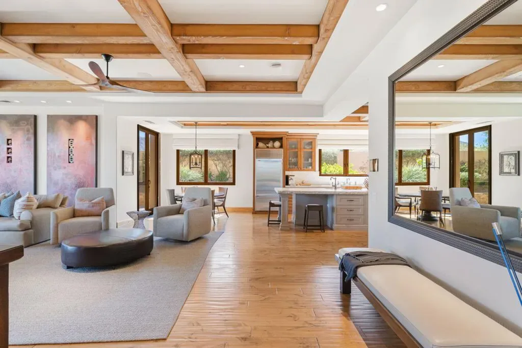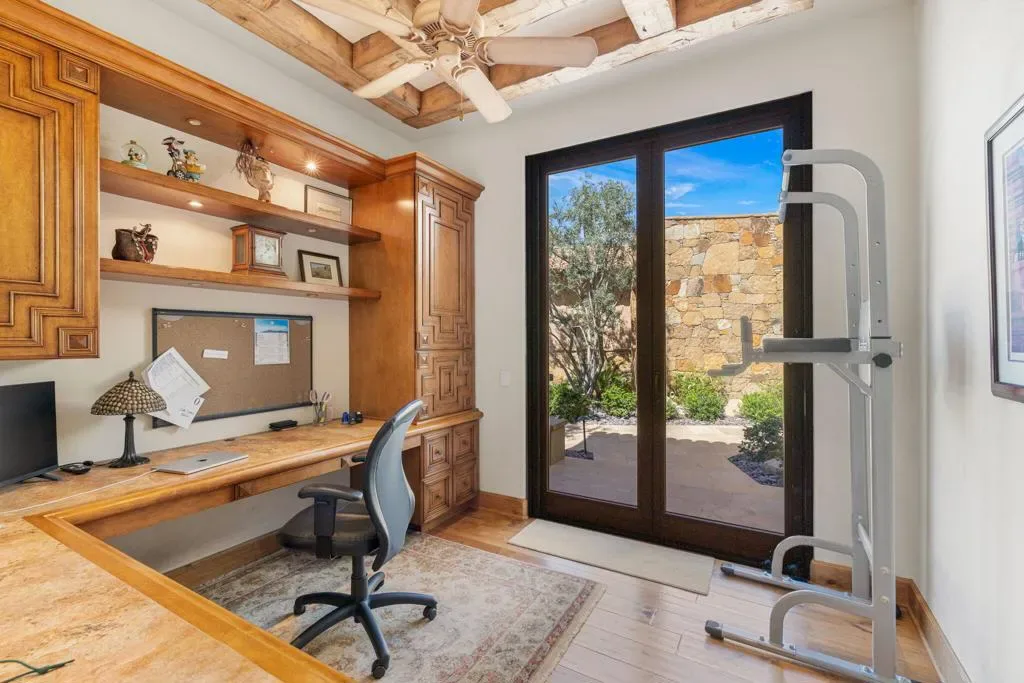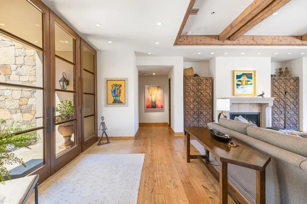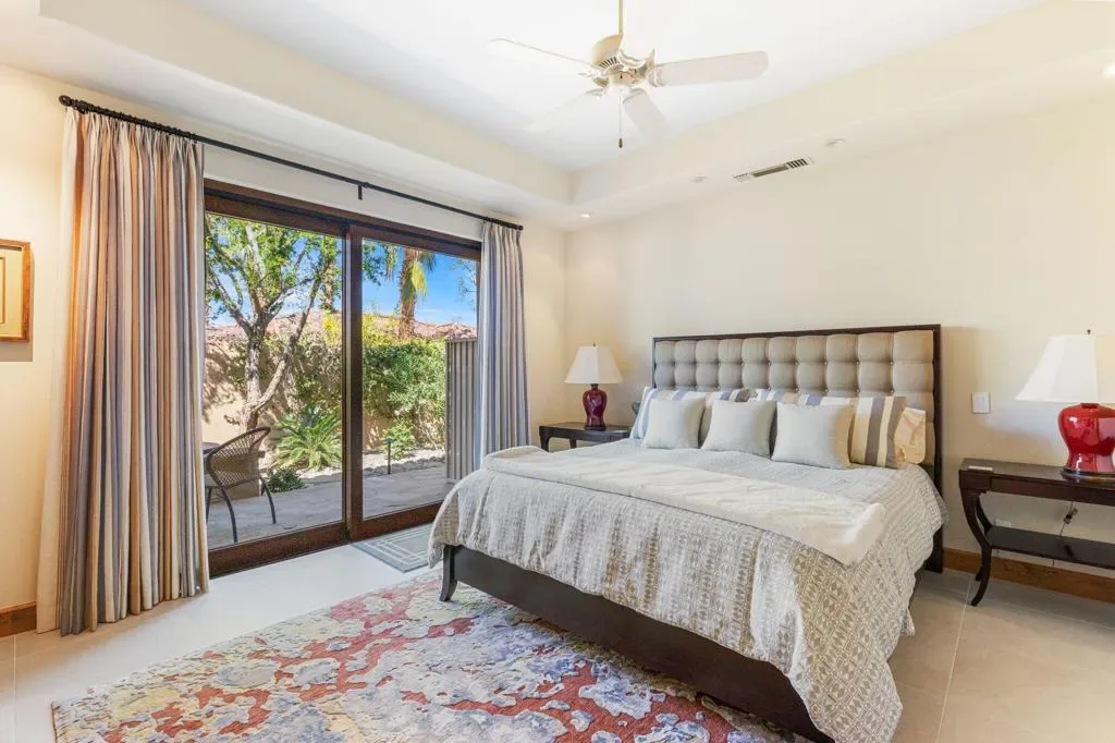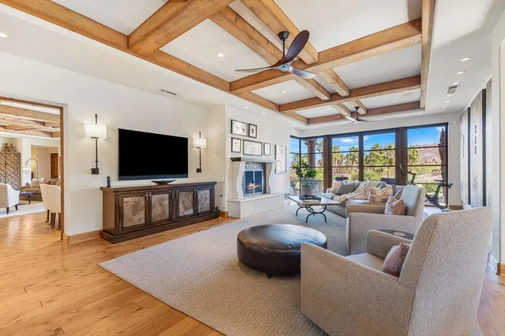 An masterful blend of contemporary touches and a timeless architectural design. This 2006 custom built home is situated up high for unmatched views of the mountains and valley. Impeccable layout for privacy and luxury living. Nestled on a cul-de-sac lot is this 3 bedroom plus an office, 5 baths with 5,066 sq. ft. of living space. The wood plank floors seamless transition to porcelain tile flooring. The 1 bedroom, 1 bath casita offers privacy and all the amenities one would ever want. The open floor plan is here for gracious entertaining. The bar area offers sitting for 6, a SubZero refrigerator and an ice maker. Tall wood framed glass sliders in the great room disappear into the wall allowing full advantage of the magnificent view. The four fireplaces are a clear signal of quality throughout. Sellers have made major upgrades and changes that take 3 pages to list. Here you will find technology at its best. There is a Control 4 Smart System, for HVAC, lights, newer surround sound speakers, pool, cell signal booster and more. The Ring security system has cameras and motion sensors. 4 newer A/C condenser units, and 30 owned solar panels with 3 Tesla backup batteries and car charger. The approx. 1,000 sq. ft. patio and salt water pool are ideally situated with vistas toward the view. The eye- catching Quartzite kitchen center island countertop, another recent addition, is remarkable. There is a large walk- in butler’s pantry with 2 SubZero freezer drawers. The separate golf cart garage door has it’s own entrance. All these benefits and the home is offered furnished per inventory list. There is so much to like about this impeccable home.