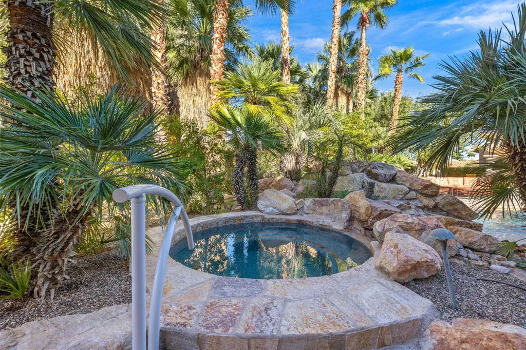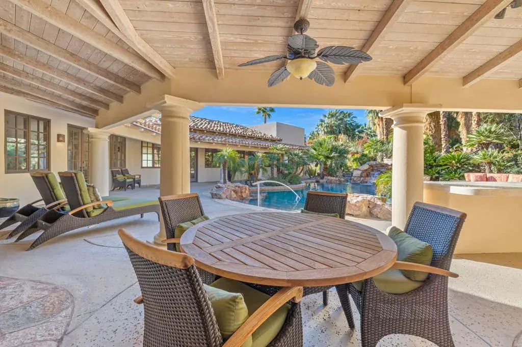 Discover this classic Santa Barbara style new hacienda home in the desert! Quality, charm and elegant design elements are evident in every room. Located at the end of a quiet street in the exceptional community of Ironwood Country Club this very private home has a spacious living room with high tongue and grooved beamed ceilings, custom cabinetry, a fireplace a mirrored bar, and four ceiling fans. Large custom windows bring in light and offer views of the lush desert landscaping. The gracious formal dining room is perfect for entertaining. The large charming kitchen has a breakfast bar, built-in desk, large workspace island, granite and wood countertops, a pantry, GE Monogram, and Kitchen Aid appliances. Six sets of French doors open from the beautiful wide hallway and master bedroom to the courtyard patio and pool. There are a total of four light filled bedrooms all ensuite, two full baths, two 3/4 baths and two additional 1/2 baths. The primary bedroom has high ceilings, and an attached office/ sitting area with fireplace. A long and inviting covered walkway and courtyard curves around the back yard, a stunning highlight of this home with professional landscaping as backdrop for the spa, waterfall and pool. Stairs lead to a high deck patio offering 360 degree views of the valley and mountains, and a delightful place to enjoy sunrises and moonrises This property is a true oasis of privacy and tranquility. Ironwood Country Club offers two Championship exceptional 18-hole courses and one of the most active golf programs in the Coachella Valley for social and competitive play. Other member amenities include 9 Tennis Courts, 10 Pickleball Courts, 2 Pop Tennis Courts, 2 Bocce Ball Courts,State-of-the-Art Wellness Center,Complimentary Group Exercise Classes,Spa Services, Dining and Club Social Events & Activities. The Club offers a variety of memberships by application and sponsorship. Membership is not required to own a home in Ironwood,
