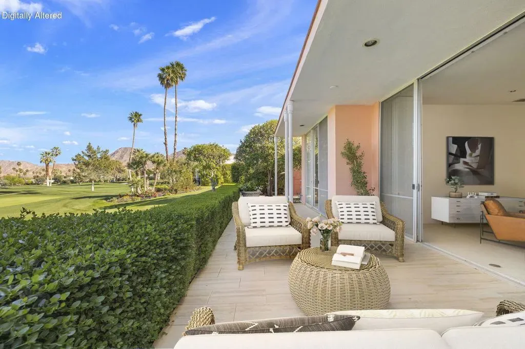 Welcome to Marrakesh Country Club, ”The Jewell of the Desert”. This elegantly remodeled 3BR / 3BA villa was designed by John Elgin Woolf, the patriarch of the Hollywood Regency Design. Located on a quiet interior street with superior views of the golf course and the mountains beyond, this villa is the largest of the four plans at Marrakesh. The spacious living and dining area features a large picture window with 10 ft sliders that enhance your dining experience. The highlight of this house is the view to the south east of the 17th green and the 18th fairway with Eisenhower mountain in the distant background. When the full moon rises , it feels like it is in your back yard. While this villa is being offered unfurnished, it has been staged virturally to give you a sense of how your own furnishing will look. The remodeled club house features an up to date fitness center, a fully staffed golf pro shop supporting the 18 hole Ted Robinson designhed golf Course, casual and fine dining , lighted bocce ball and pickle ball courts. and much more including 14 community pools and spas. The photos tell the story on this charming villa. Come and see for your self. This is your chance to become a part of the acclaimed Marrakesh Life Style. There is not another place like Marrakesh in the desert and the location of this particular villa is at the top of the list.