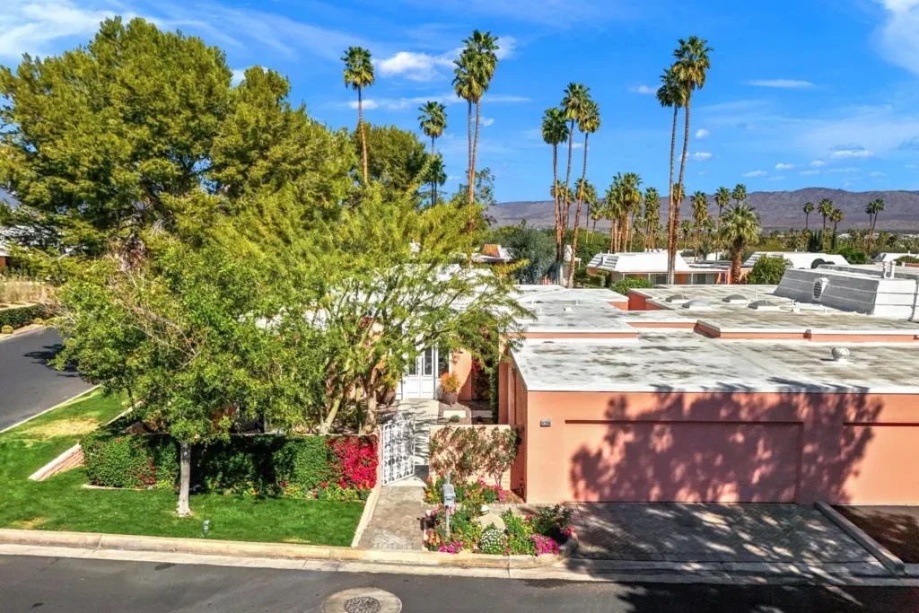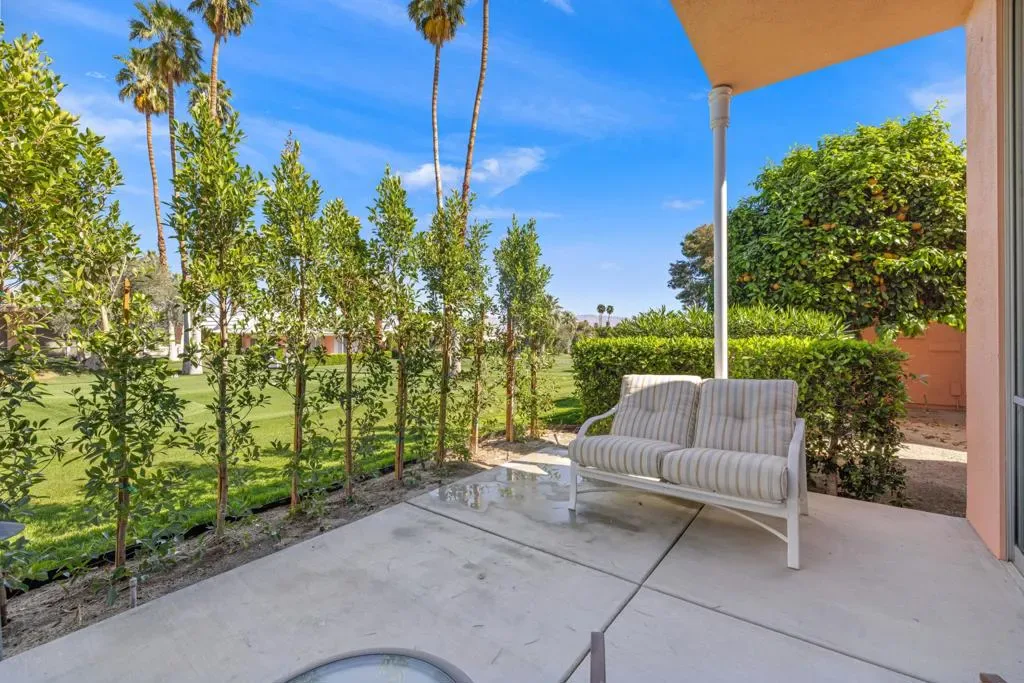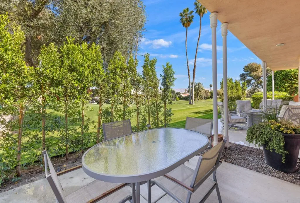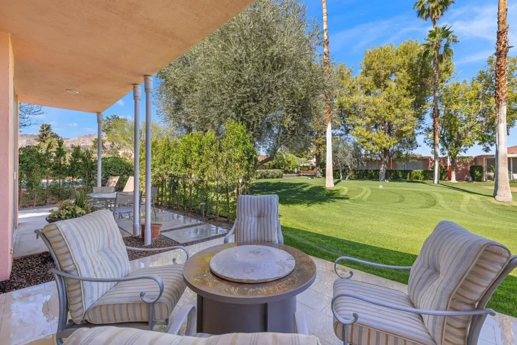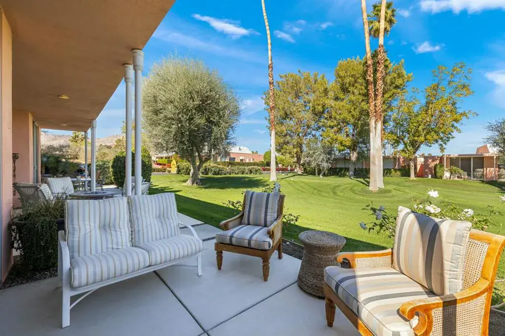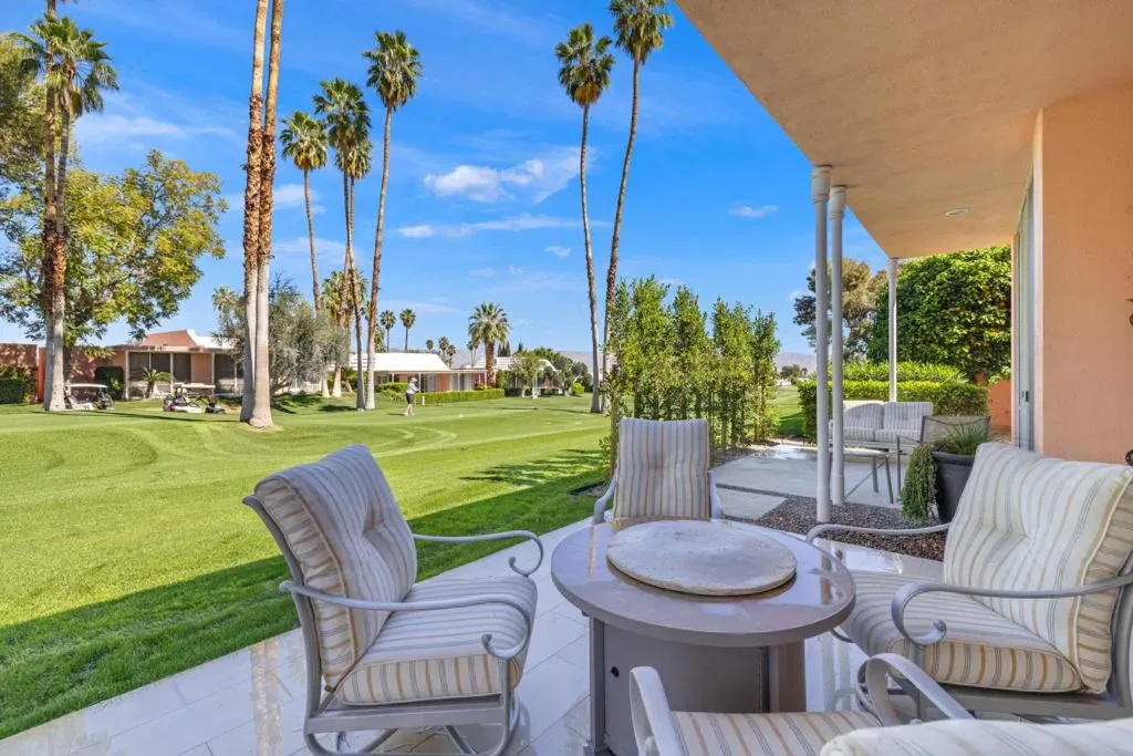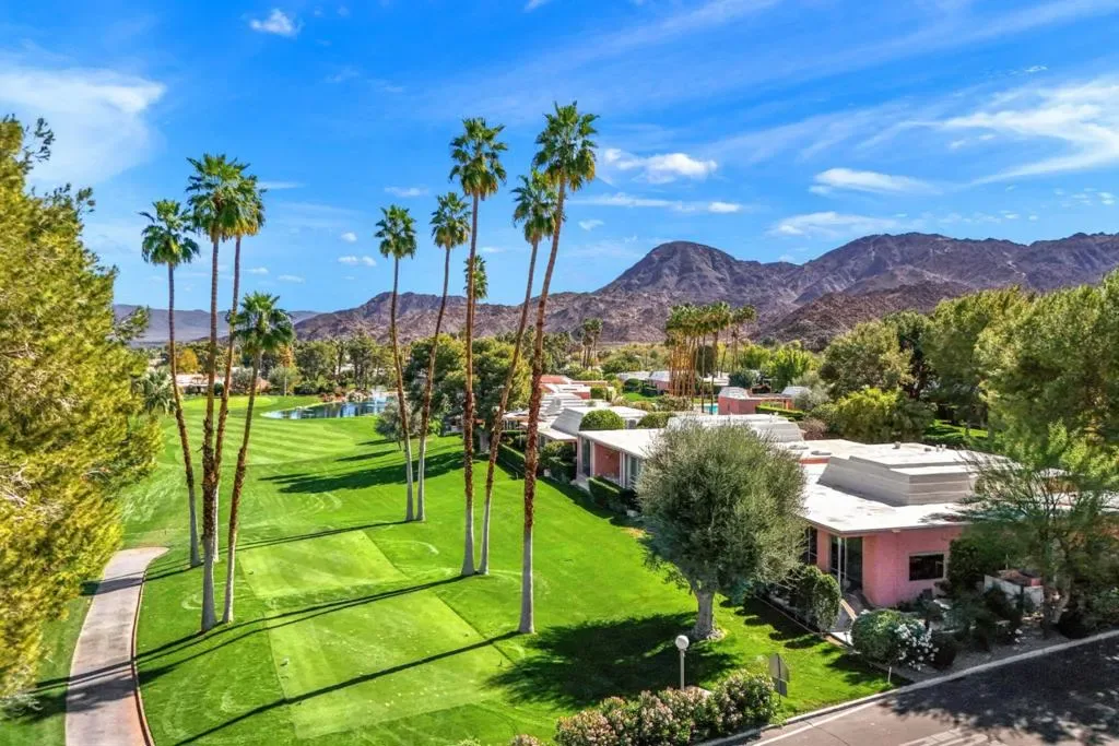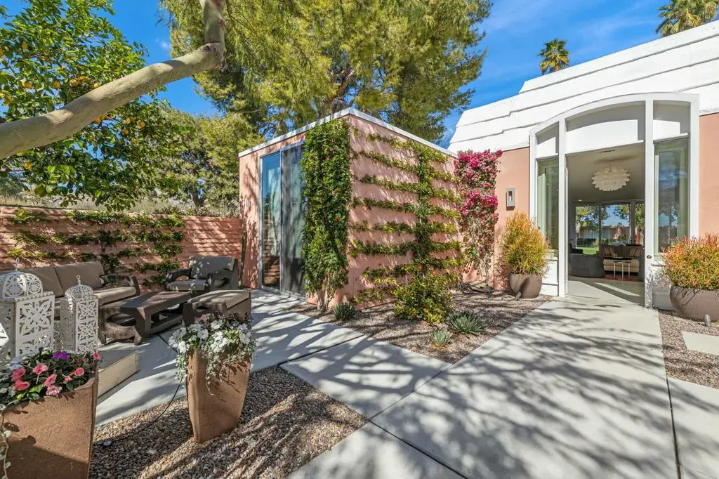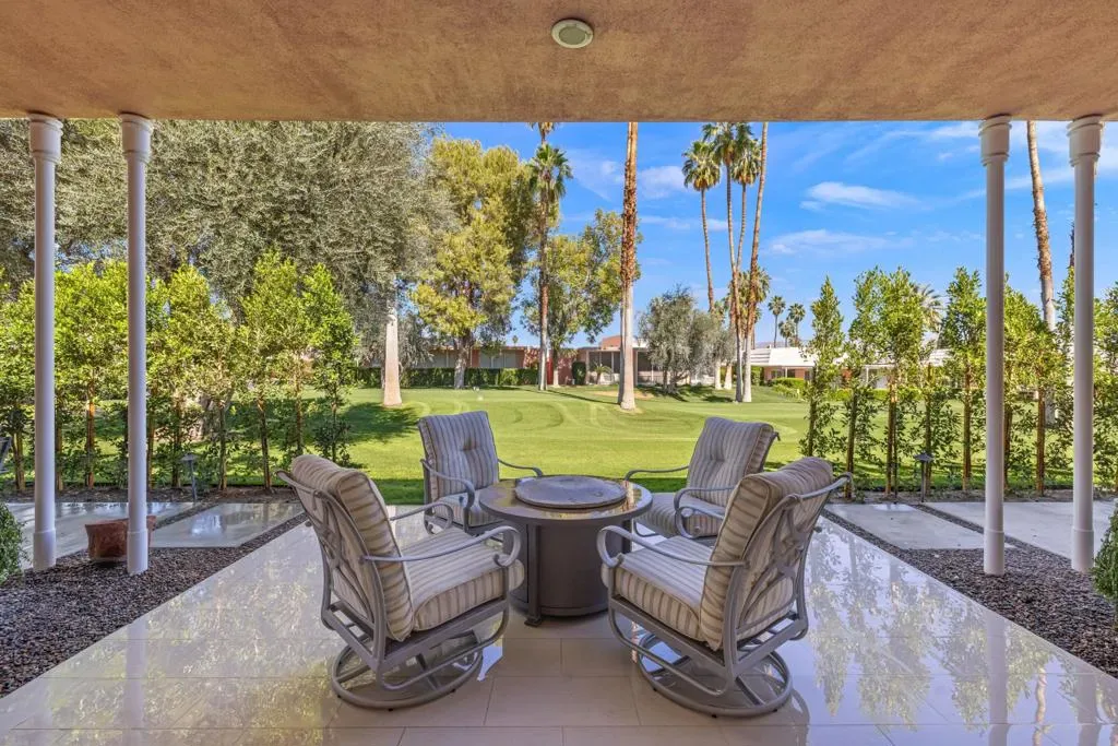 Presented in Beautiful Marrakesh Country Club, this Hollywood Regency Villa in a rare corner location features classic white wrought iron gates which open to a serene courtyard with walled greenery and pathway leading to the iconic Marrakesh double front doors. This D-plan, the largest in Marrakesh at 2,427 sq. ft., offers 3 bedrooms and 3 bathrooms in a beautifully updated design. The stunningly modern kitchen features a sleek breakfast bar, while generously sized bedrooms–with walk-in closets–offer ideal separation for privacy. The primary suite, overlooking the golf course, serves as a tranquil retreat with a luxurious spa-inspired bathroom, freestanding soaking tub, and windows framing lush greenery for a true Zen escape. Floor-to-ceiling glass flood the home with natural light and showcase fairway views of the north-facing 7th hole and spacious leisure terrace. Additional highlights include an ensuite guest room, a versatile office or den flex space, a stylish powder room, and an attached garage–elevating desert living to its finest. Marrakesh is a boutique country club with an ideal central valley location amongst a few of the desert’s finest private clubs. Amenities include 18-hole private executive golf course, tennis, pickle ball, 14 pools and spa, a fitness center, and an active and newly-remodeled club house with fine dining. Marrakesh is near famous El Paseo with all of its elegant boutiques, restaurants, art galleries and coffee houses.