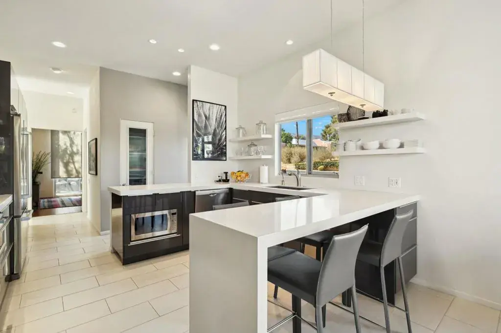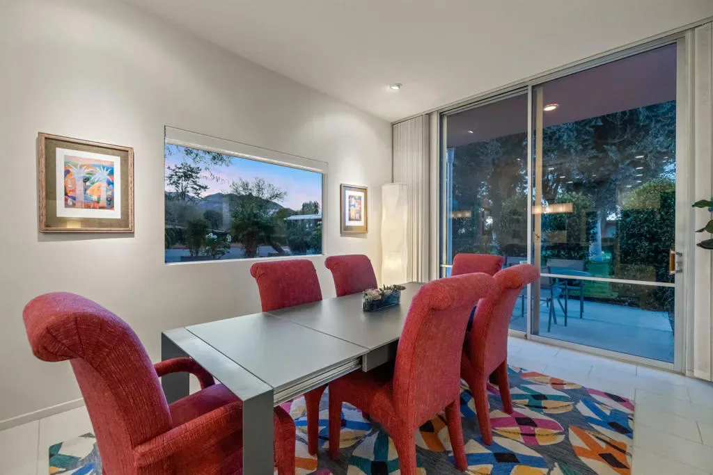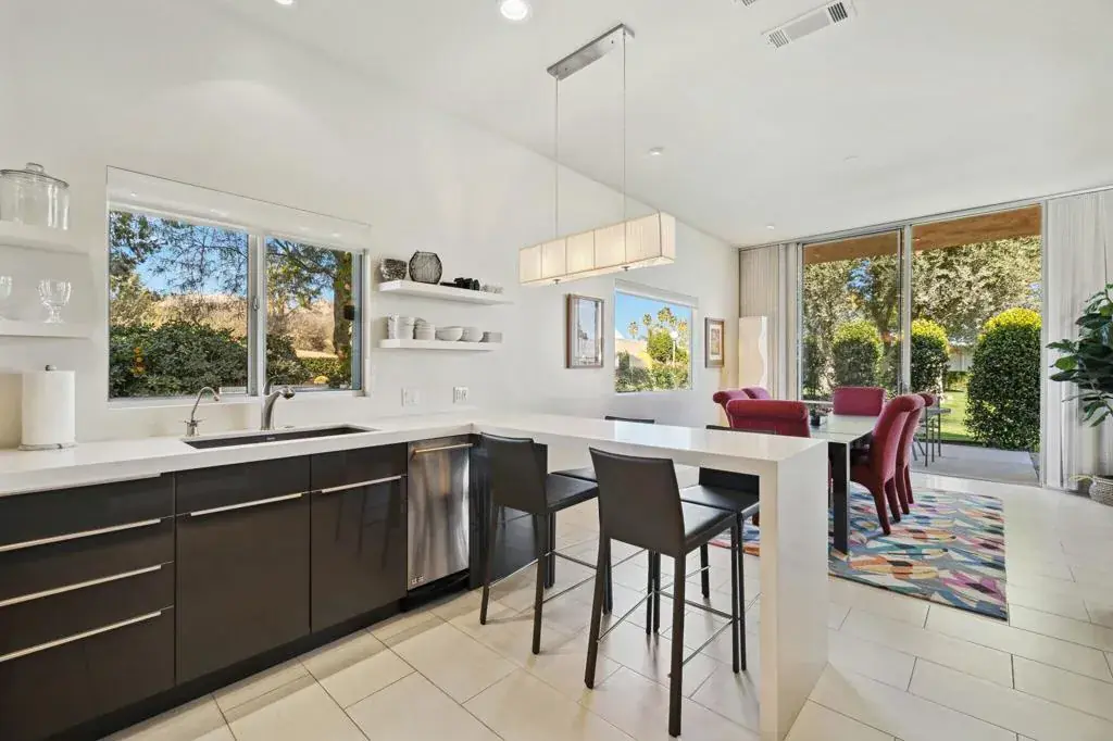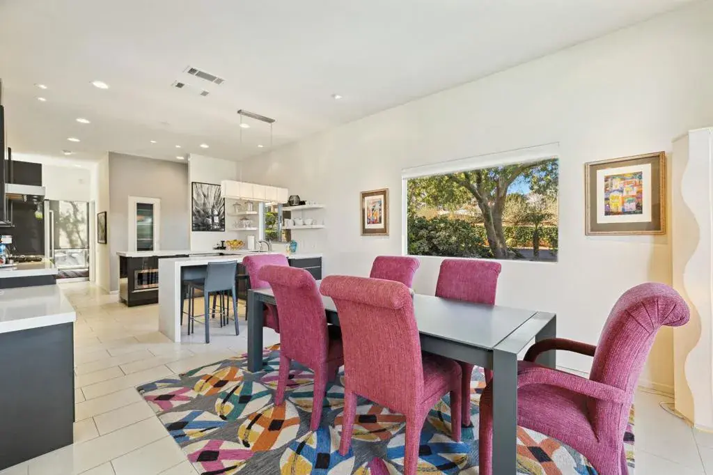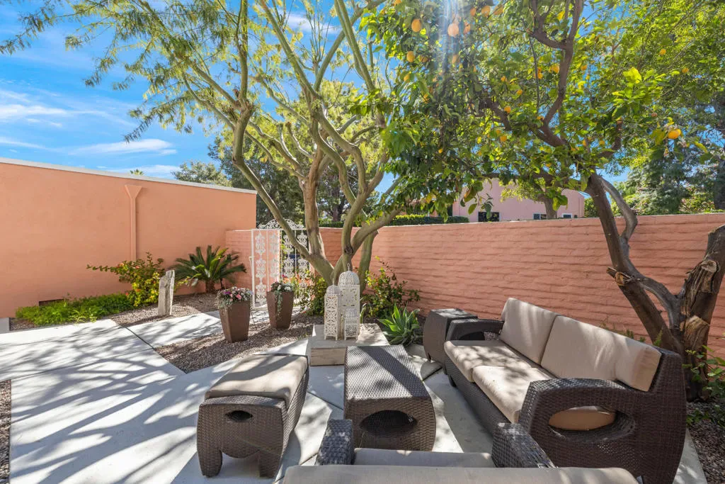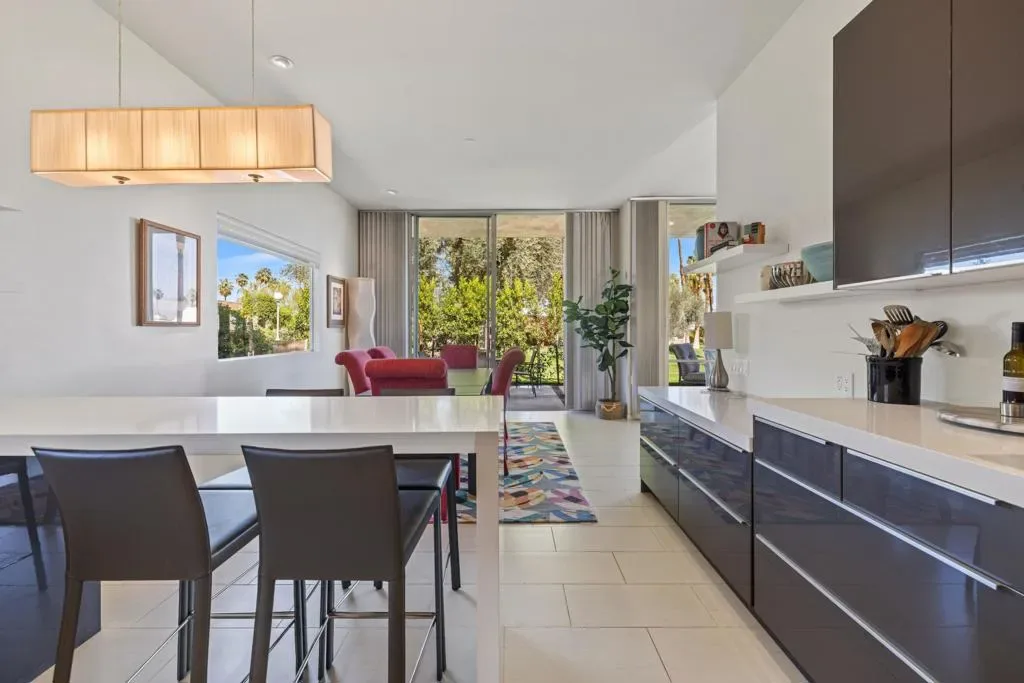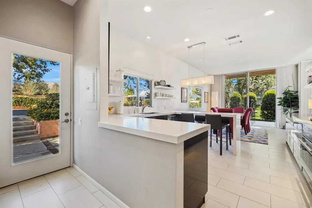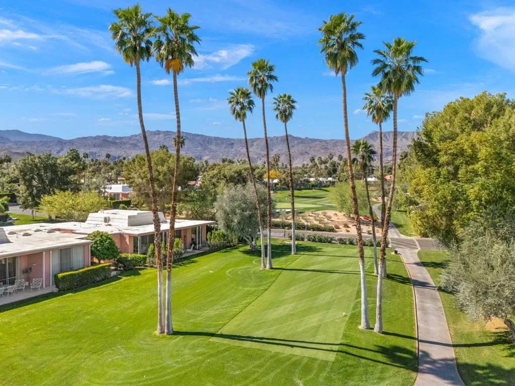 Presented in Beautiful Marrakesh Country Club, this Hollywood Regency Villa in a rare corner location features classic white wrought iron gates which open to a serene courtyard with walled greenery and pathway leading to the iconic Marrakesh double front doors. This D-plan, the largest in Marrakesh at 2,427 sq. ft., offers 3 bedrooms and 3 bathrooms in a beautifully updated design. The stunningly modern kitchen features a sleek breakfast bar, while generously sized bedrooms–with walk-in closets–offer ideal separation for privacy. The primary suite, overlooking the golf course, serves as a tranquil retreat with a luxurious spa-inspired bathroom, freestanding soaking tub, and windows framing lush greenery for a true Zen escape. Floor-to-ceiling glass flood the home with natural light and showcase fairway views of the north-facing 7th hole and spacious leisure terrace. Additional highlights include an ensuite guest room, a versatile office or den flex space, a stylish powder room, and an attached garage–elevating desert living to its finest. Marrakesh is a boutique country club with an ideal central valley location amongst a few of the desert’s finest private clubs. Amenities include 18-hole private executive golf course, tennis, pickle ball, 14 pools and spa, a fitness center, and an active and newly-remodeled club house with fine dining. Marrakesh is near famous El Paseo with all of its elegant boutiques, restaurants, art galleries and coffee houses.