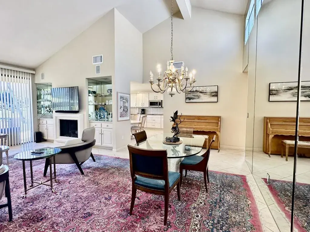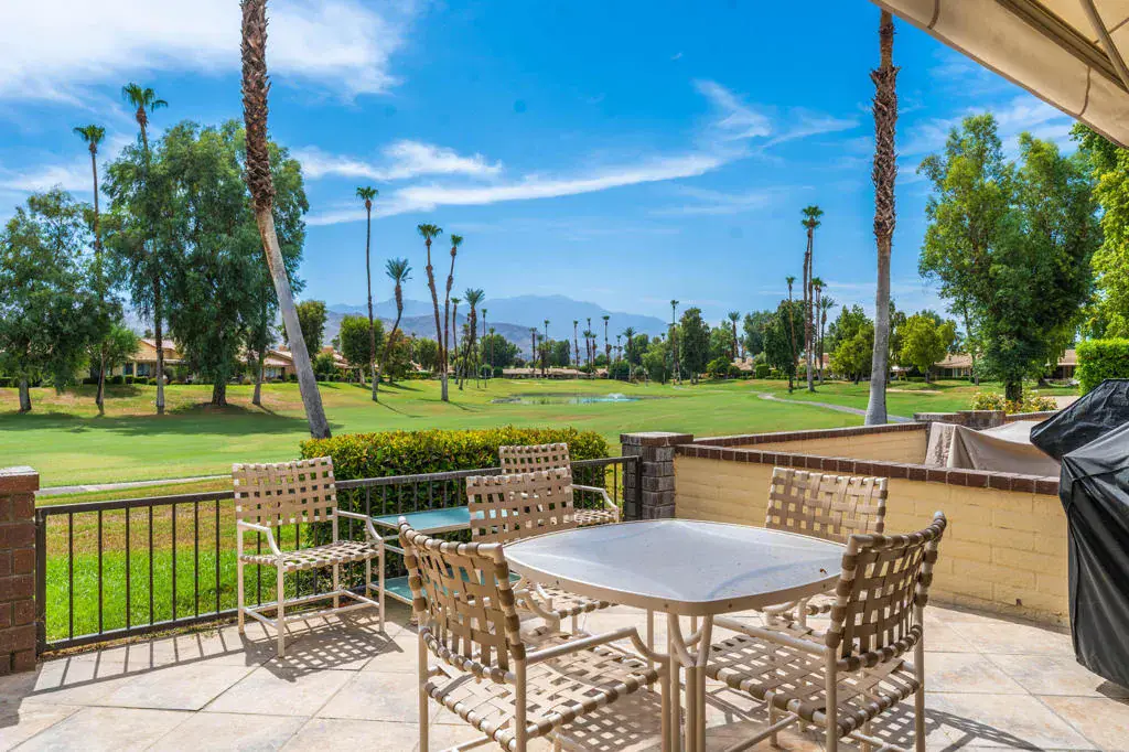 Welcome to this beautifully maintained 2-bedroom, 2-bathroom home with a den, located in a prime golf course setting offering sweeping views of lush fairways and the surrounding mountains. The spacious interior features an open living and dining area with vaulted ceilings, a cozy fireplace, and expansive floor-to-ceiling windows that fill the space with natural light and showcase the picturesque landscape beyond.The kitchen is both functional and elegant, with abundant cabinetry, granite countertops, double ovens, and a charming breakfast area that opens directly to the outdoor patio. Ideal for both relaxation and entertaining, the extended back patio provides a serene setting overlooking the golf course and a nearby water feature, while the private entry courtyard offers a warm and inviting welcome.The primary bedroom suite features a generous layout and a walk-in closet, offering comfort and privacy. The second bedroom is bright and spacious, perfect for guests or family members, with convenient access to the second full bathroom. A versatile den provides the perfect space for a home office, media room, or additional sleeping area.This home blends timeless design with an unbeatable location, ideal for enjoying the comfort and beauty of desert living.
