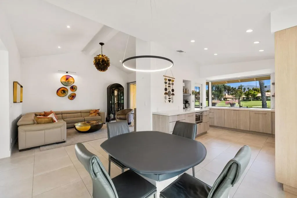 Wow! Best value in Monterey Country Club for a fully remodeled home, this south-facing, elevated 2-bedroom, 2-bath residence + a den is ideally positioned in the heart of the community, capturing breathtaking panoramic mountain and golf course views along the award-winning Ted Robinson-designed fairways.No detail has been overlooked in this thoughtfully redesigned residence. The open-concept layout is enhanced by large-format porcelain tile throughout, high-end appliances, custom cabinetry, custom interior doors, and beautifully remodeled bathrooms. All-new windows and sliders flood the space with natural light, while a brand-new HVAC system, upgraded water heater and custom window treatments. An oversized laundry room with exceptional storage adds both convenience and functionality.This is a rare opportunity to own a truly move-in-ready home where everything has already been done for you.Seamlessly blending indoor and outdoor living, the expansive south-facing patio is fenced for privacy and features a retractable awning, perfect for hosting, relaxing, and soaking in the stunning desert scenery.Location truly sets this home apart. Centrally positioned in the heart of the Coachella Valley, Monterey Country Club offers unbeatable access to El Paseo’s premier shopping and dining, world-class golf, and endless entertainment. Residents of Monterey Country Club enjoy a clubhouse, fitness center, 27 holes of Ted Robinson-designed golf, 6 tennis courts, 33 pickle-ball courts, 4 lane bocce ball court, and 37 pools and spas.