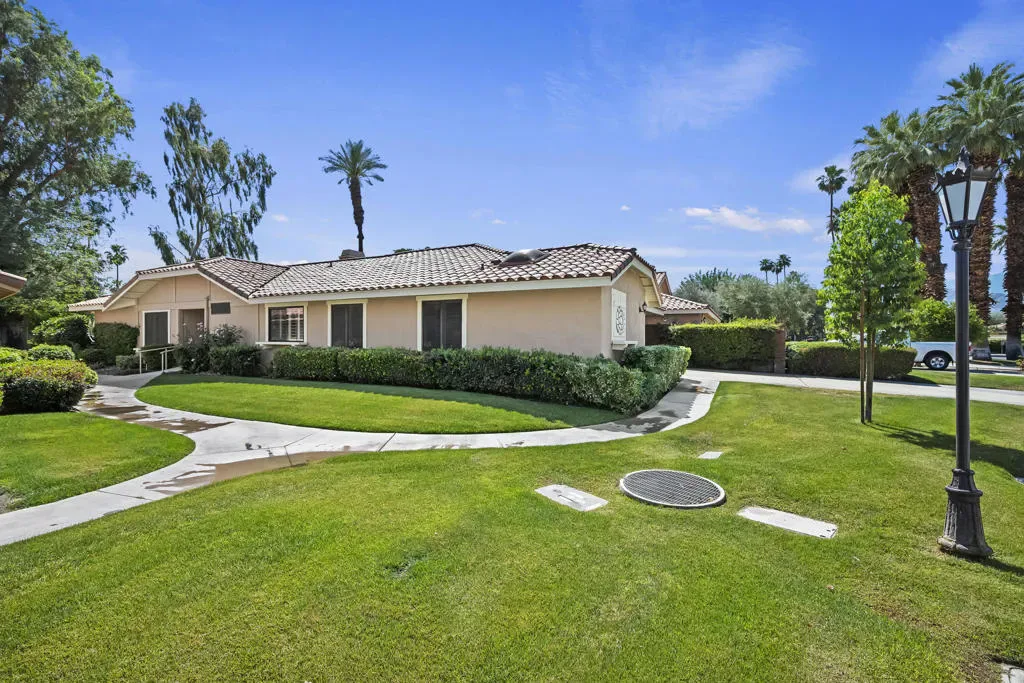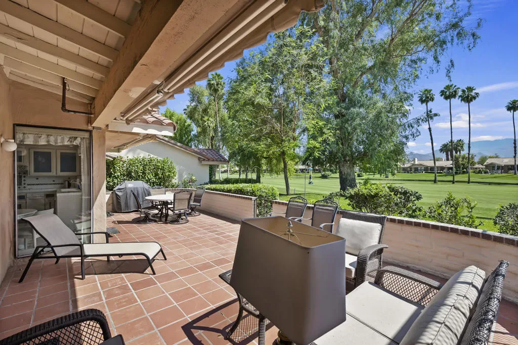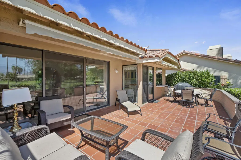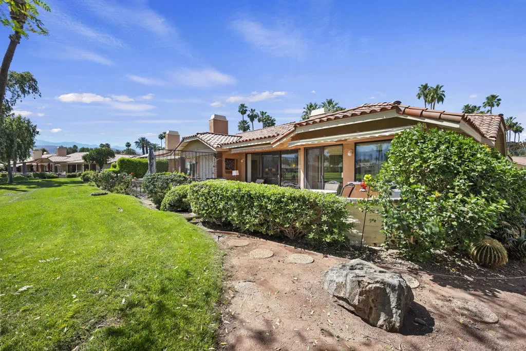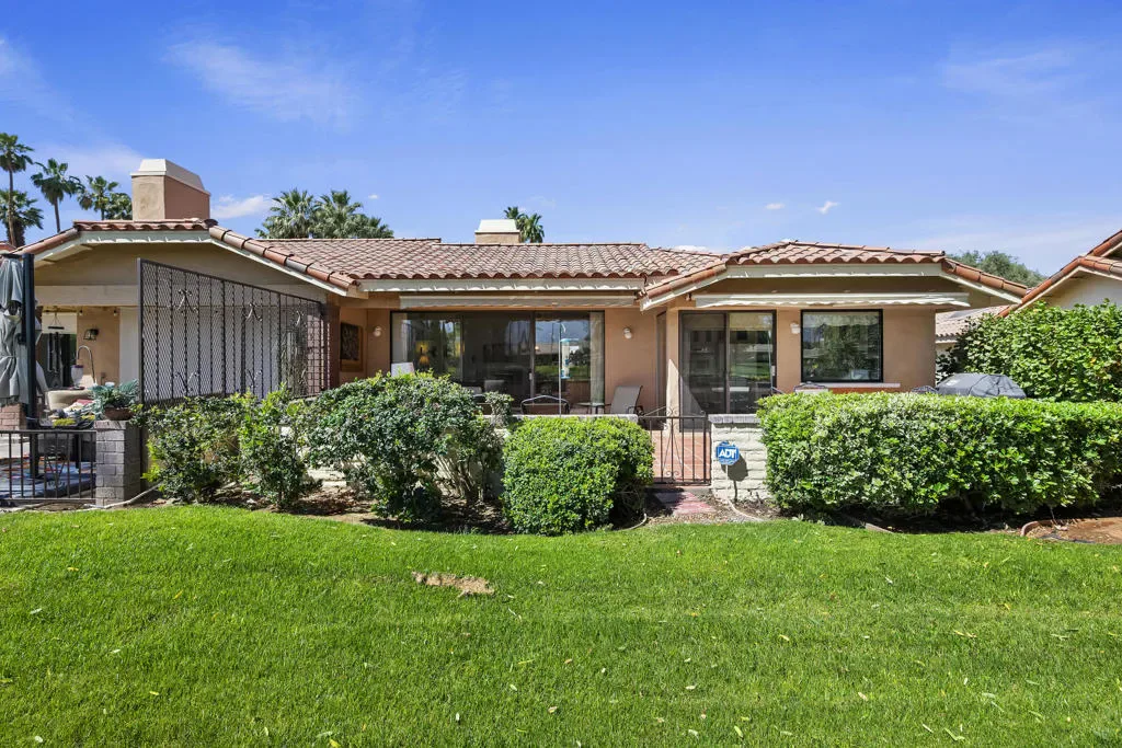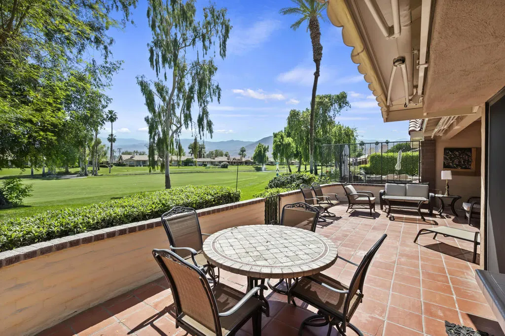 Welcome to this beautifully situated south-facing residence offering sweeping views of the fairway, tranquil lake, and surrounding mountains. Ideally positioned within Monterey Country Club, this highly desirable Max Plan 3000 floor plan features approximately 2,200 sq. ft. of thoughtfully designed living space.This spacious home includes 2 generously sized bedrooms, 3 full bathrooms, and an additional powder room. A versatile den/media room–complete with a wet bar and wine refrigerator–creates the perfect setting for entertaining or relaxing.The open-concept kitchen, living, and dining areas are filled with natural light, enhanced by the home’s premium southern exposure. Step outside to the rear paver-tiled patio, where two retractable awnings provide shade and comfort while you enjoy picturesque golf course and mountain views–ideal for morning coffee or evening gatherings.Additional features include plantation shutters, ceiling fans throughout, mirrored closet doors, and elegant mirrored accent walls in the living and dining areas. The attached 2-car garage offers finished flooring for added functionality and style.Residents of Monterey Country Club enjoy an exceptional array of amenities, including 27 holes of championship golf, 20 pickleball courts, tennis facilities, a fitness center, and a vibrant clubhouse.Centrally located in the Coachella Valley, this home is just minutes from the renowned El Paseo, known for its upscale shopping, fine dining, and art galleries. Nearby College of the Desert and other local conveniences further enhance the appeal of this prime location.