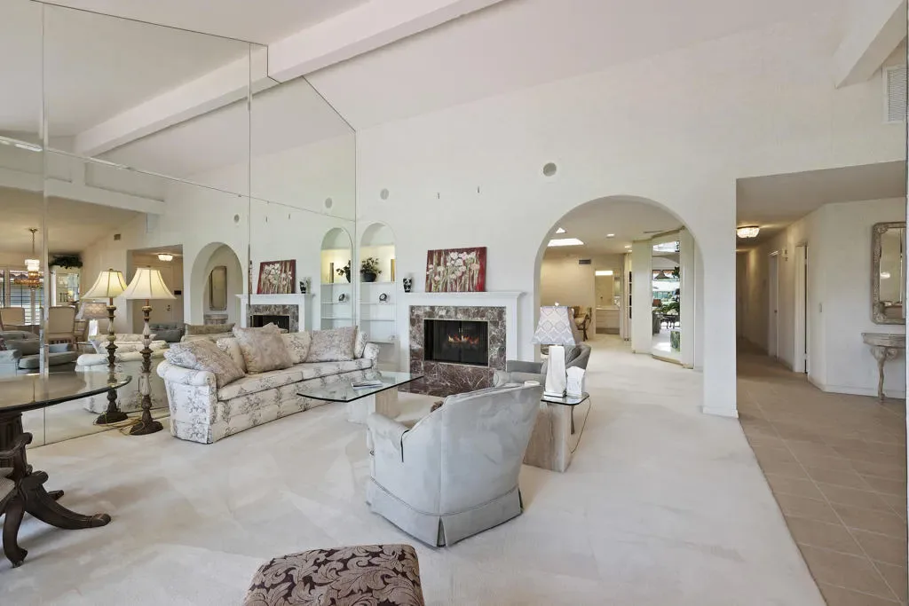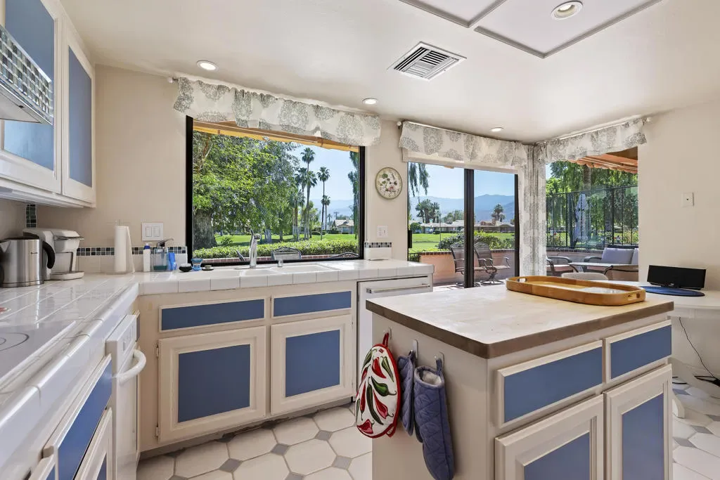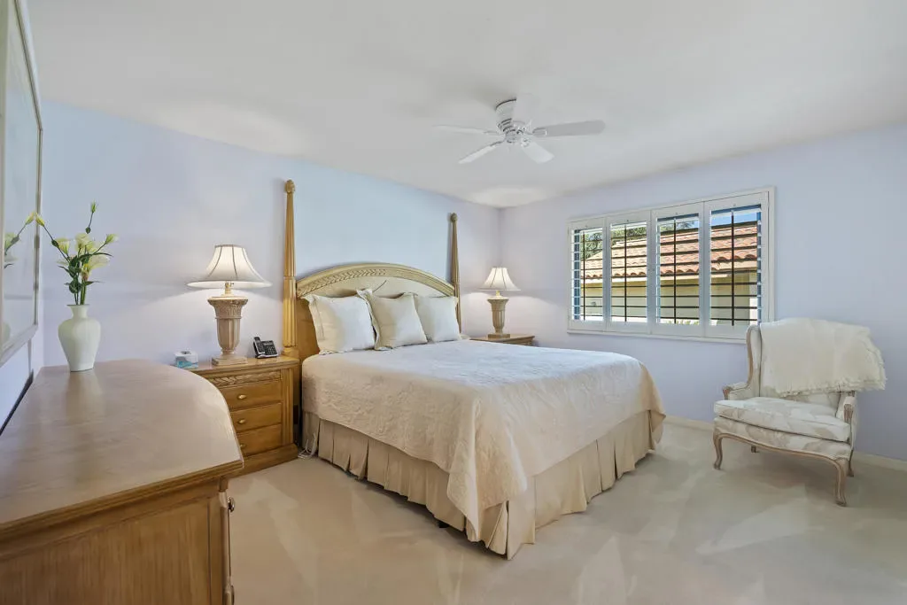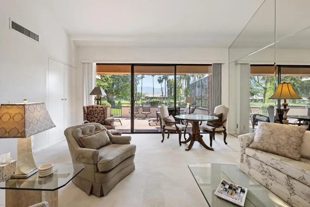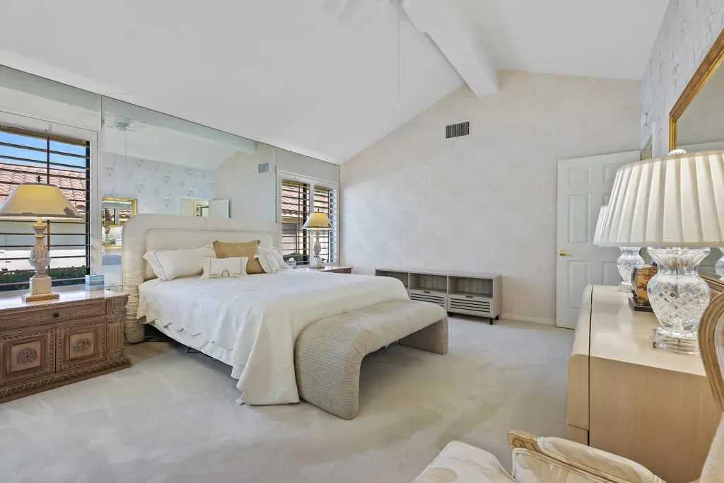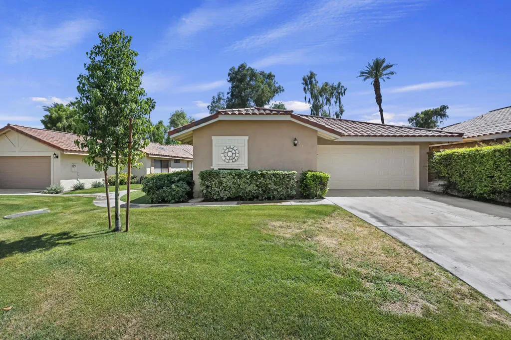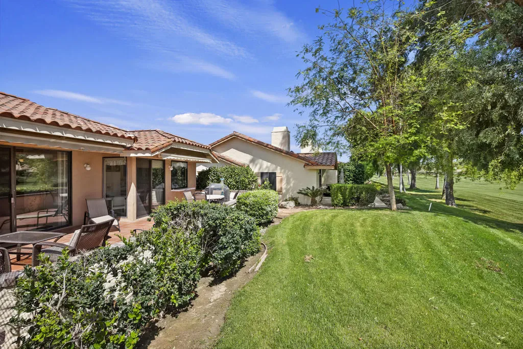 Welcome to this beautifully situated south-facing residence offering sweeping views of the fairway, tranquil lake, and surrounding mountains. Ideally positioned within Monterey Country Club, this highly desirable Max Plan 3000 floor plan features approximately 2,200 sq. ft. of thoughtfully designed living space.This spacious home includes 2 generously sized bedrooms, 3 full bathrooms, and an additional powder room. A versatile den/media room–complete with a wet bar and wine refrigerator–creates the perfect setting for entertaining or relaxing.The open-concept kitchen, living, and dining areas are filled with natural light, enhanced by the home’s premium southern exposure. Step outside to the rear paver-tiled patio, where two retractable awnings provide shade and comfort while you enjoy picturesque golf course and mountain views–ideal for morning coffee or evening gatherings.Additional features include plantation shutters, ceiling fans throughout, mirrored closet doors, and elegant mirrored accent walls in the living and dining areas. The attached 2-car garage offers finished flooring for added functionality and style.Residents of Monterey Country Club enjoy an exceptional array of amenities, including 27 holes of championship golf, 20 pickleball courts, tennis facilities, a fitness center, and a vibrant clubhouse.Centrally located in the Coachella Valley, this home is just minutes from the renowned El Paseo, known for its upscale shopping, fine dining, and art galleries. Nearby College of the Desert and other local conveniences further enhance the appeal of this prime location.