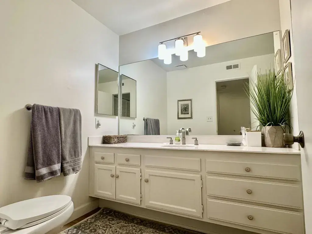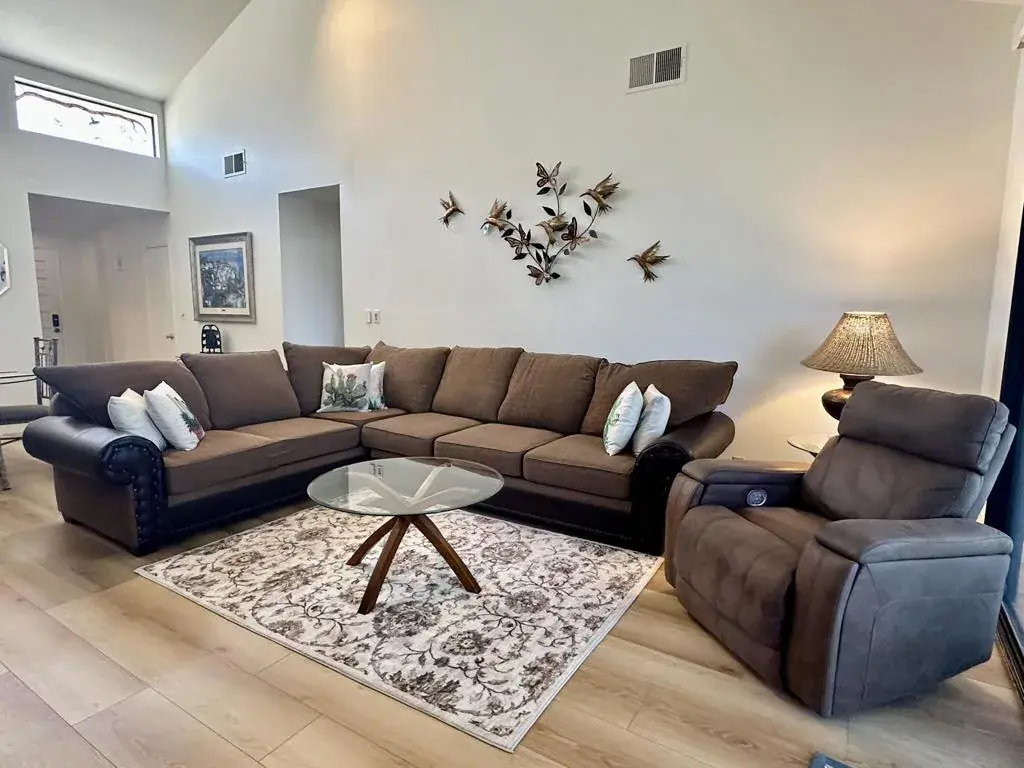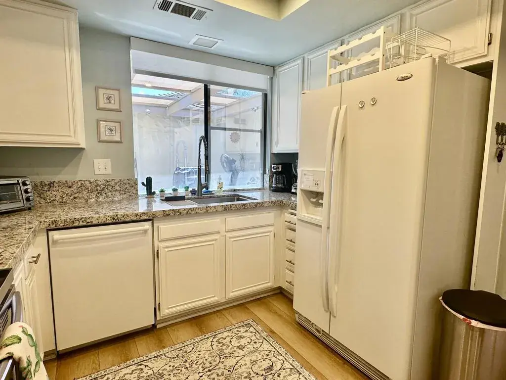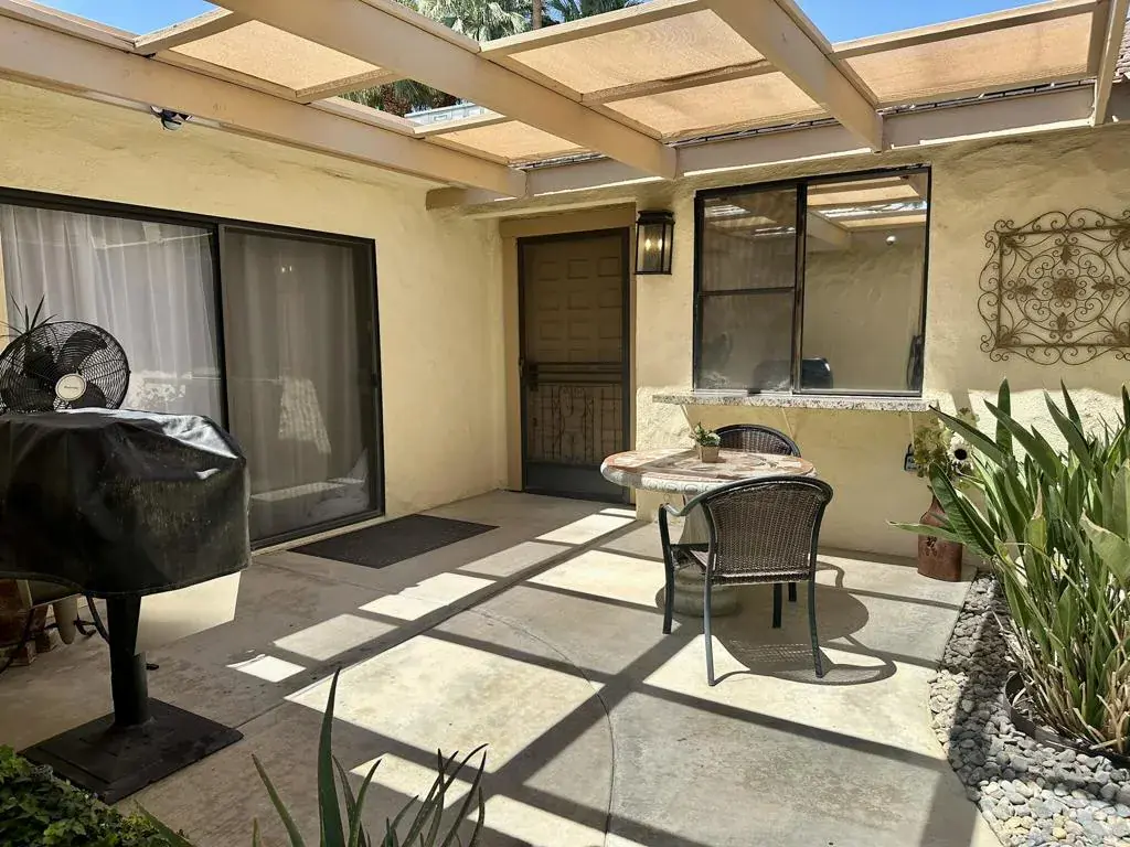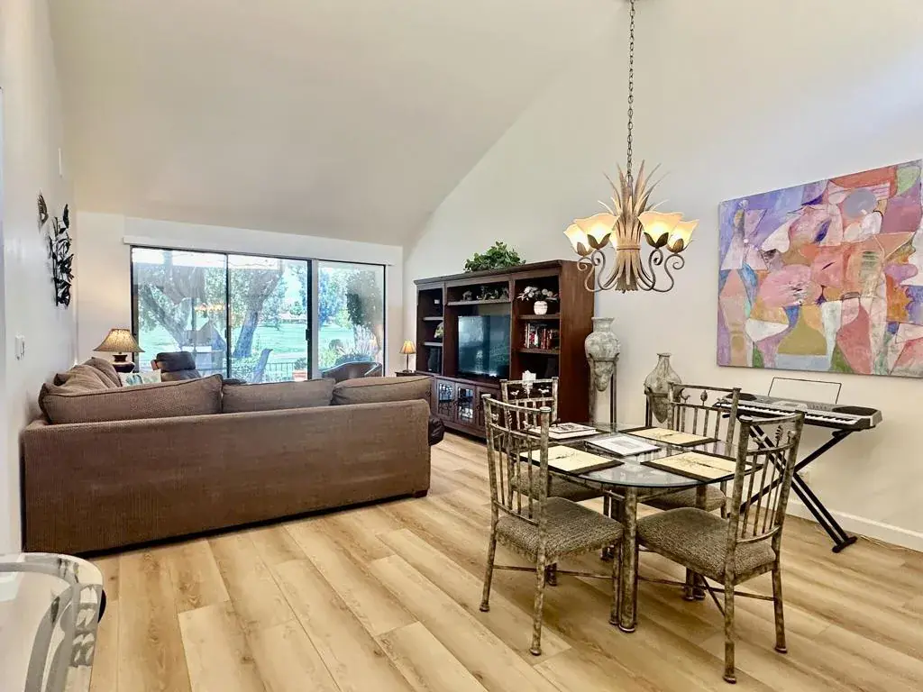 Beautifully updated 2 bedroom, 2 bath home located in Monterey CC! This light-filled home features an open-concept living area with vaulted ceilings, luxury vinyl plank flooring, and a spacious sectional perfect for entertaining or relaxing. The modern kitchen is equipped with granite countertops, white cabinetry, stainless steel appliances, and ample storage space. The primary bedroom offers direct access to a private patio with serene views of lush landscaping and mountains. Both bedrooms are generously sized, and the bathrooms have been tastefully updated for a fresh, clean feel. Located just steps from the community pool, this condo offers the perfect blend of comfort, style, and convenience–ideal for a relaxing getaway in a peaceful, well-maintained neighborhood.