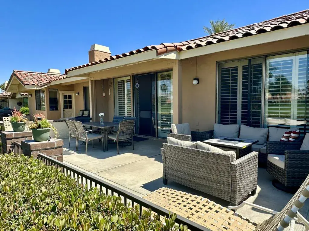 Welcome to your dream getaway! This beautifully maintained 2-bedroom, 2-bathroom condo boasts an open-concept floor plan with soaring vaulted ceilings and expansive windows offering stunning golf course views. The spacious living area features a comfortable sectional, modern decor accents, and easy access to the extended patio through plantation-shuttered glass doors–perfect for relaxing or entertaining.The updated kitchen comes equipped with classic dark wood cabinetry, white tile countertops, and modern appliances. Functional touches like a double sink and ample storage make it as practical as it is inviting.Retreat to the serene primary bedroom, where you’ll find a plush bed, elegant furnishings, and direct access to the patio. With large windows and tiled flooring throughout, this home combines warmth, style, and low-maintenance living.Located in a desirable, quiet community with lush golf course surroundings, this condo offers the perfect blend of comfort and convenience.