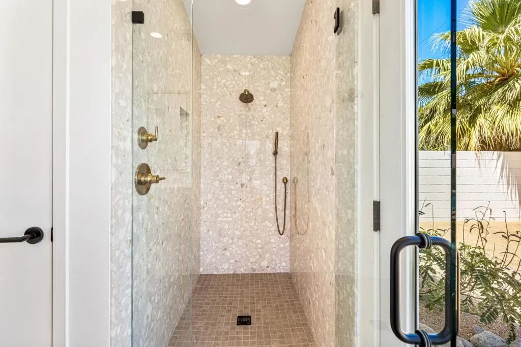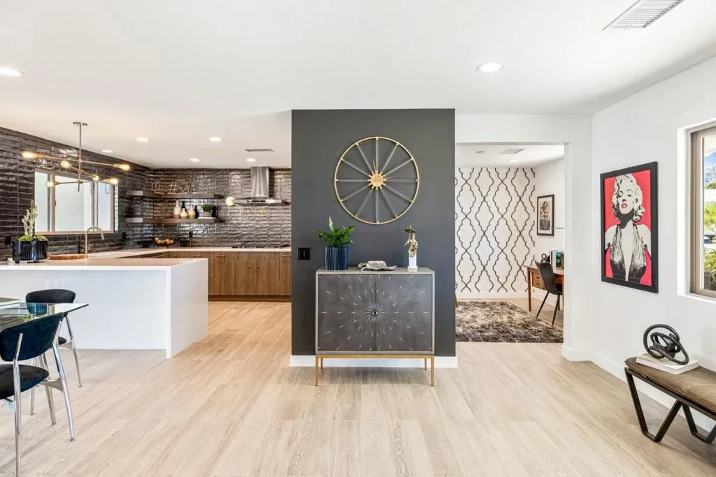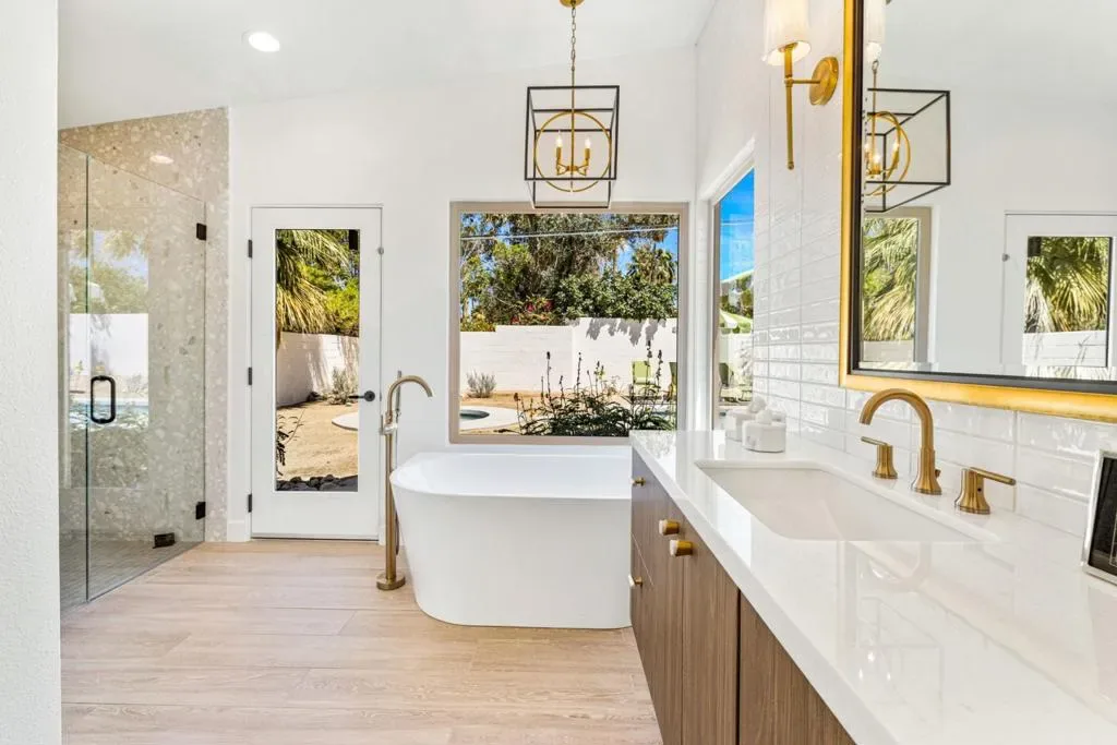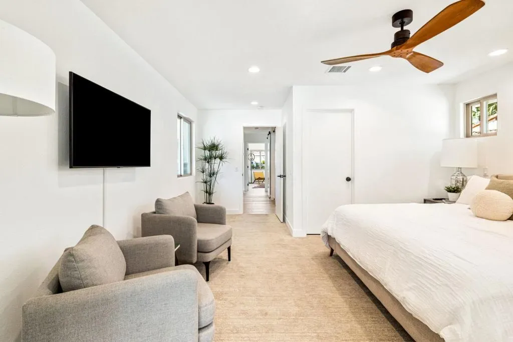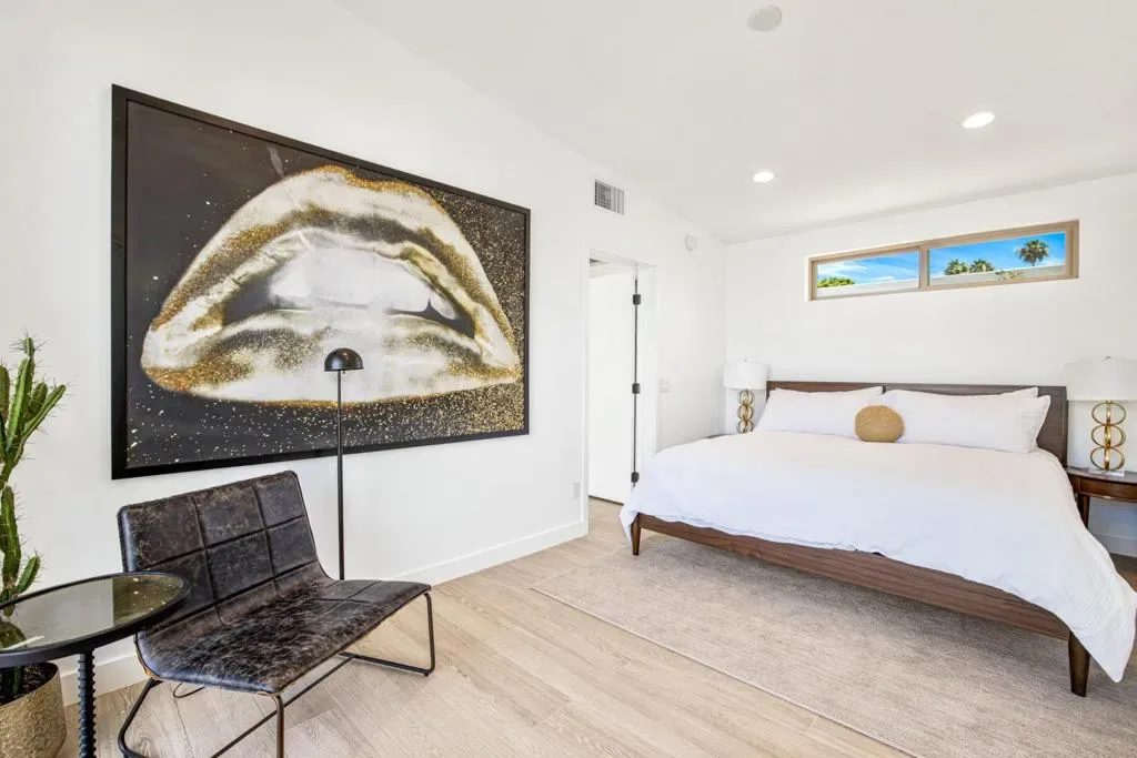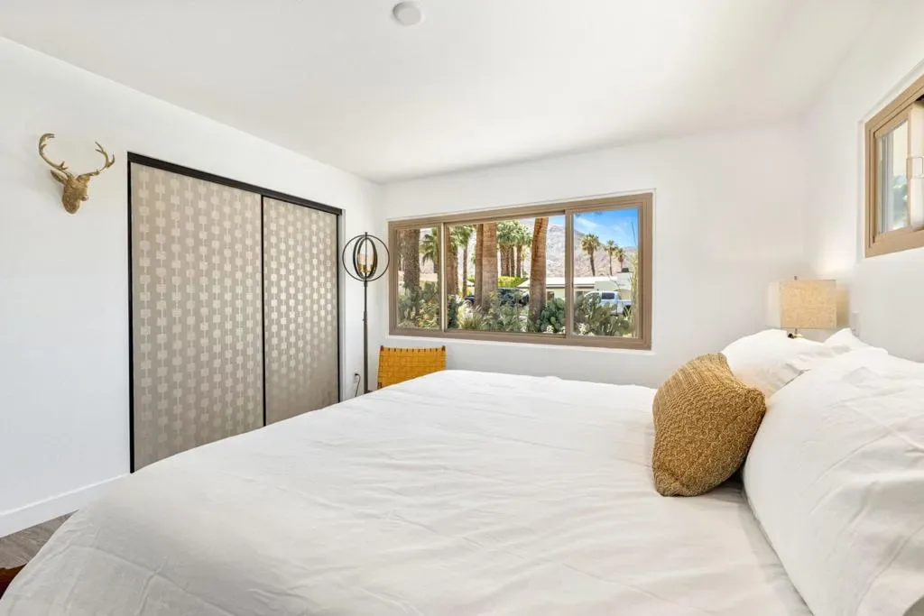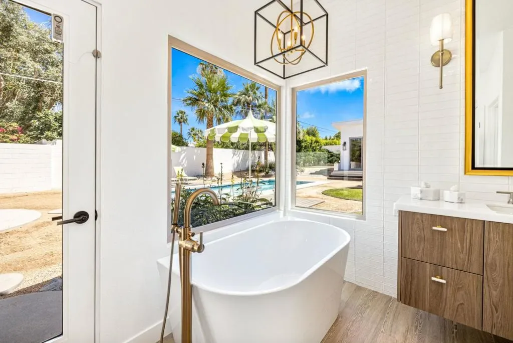 Moments from the boutiques, galleries, and dining of the famed El Paseo Shopping District, this beautifully reimagined mid-century ranch style home, captures the essence of relaxed desert living on an expansive .35-acre parcel in South Palm Desert. Originally built in 1950 and thoughtfully renovated from top to bottom, the residence blends timeless architectural character with contemporary design and modern comfort. Clean lines, open living spaces, and abundant natural light create a welcoming atmosphere throughout the home. At the heart of the residence, the chef’s kitchen has been completely transformed with professional-grade appliances, sleek custom cabinetry, floating shelves, and a striking waterfall island designed for both everyday living and effortless entertaining. The open-concept great room features a gas-burning fireplace, designer tile flooring, and views that extend toward the surrounding mountains. The primary suite offers a tranquil retreat with a sitting area, walk-in closet, and a beautifully renovated bath featuring a soaking tub, dual vanities, and direct access to the pool and spa. Two additional bedrooms, including a private poolside casita connected by a breezeway, provide comfortable accommodations for guests while maintaining privacy and flexibility. Outdoors, the property unfolds as a private resort; a newly constructed pool and spa anchor the grounds, complemented by multiple lounging and dining areas, mature desert landscaping, and generous open space rarely found so close to El Paseo.Offering architectural charm, modern upgrades, and an exceptional location, this distinctive property presents a rare opportunity to experience the very best of desert living.
