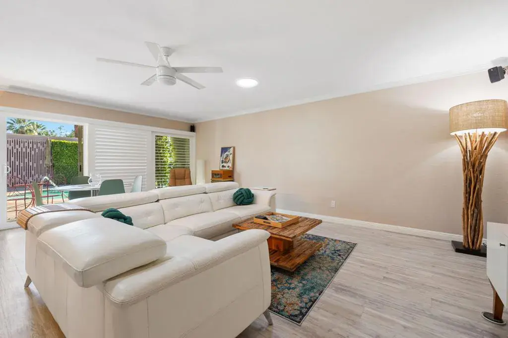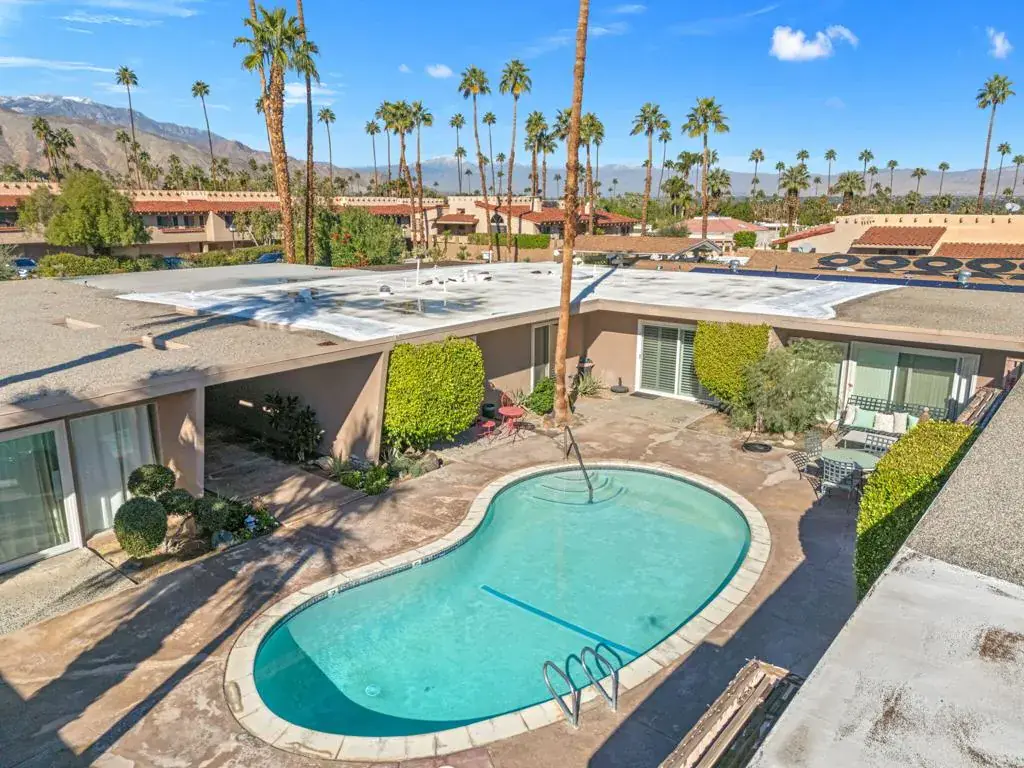 ADORABLE MID CENTURY BUNGALOW This two bedroom/two bath is the perfect desert home or getaway. Located on a cul-de-sac, all on one level, and walking distance to El Paseo for dining and shopping. Small private complex of just 4 units with shared pool. Great space, lots of light, view of the pool and mountains, plantation shutters thru out, double pane windows and LOW HOA fees. Lovely updated kitchen w/stainless appliances. Washer/dryer inside unit. Large primary bedroom w/large shower in primary bath. Updated guest bath. Inviting large front patio with Awesome mountain views. One car Garage w/storage. Join the Shadow Mountain Social Membership and meet your neighbors. Come take a look! You will not be disappointed!