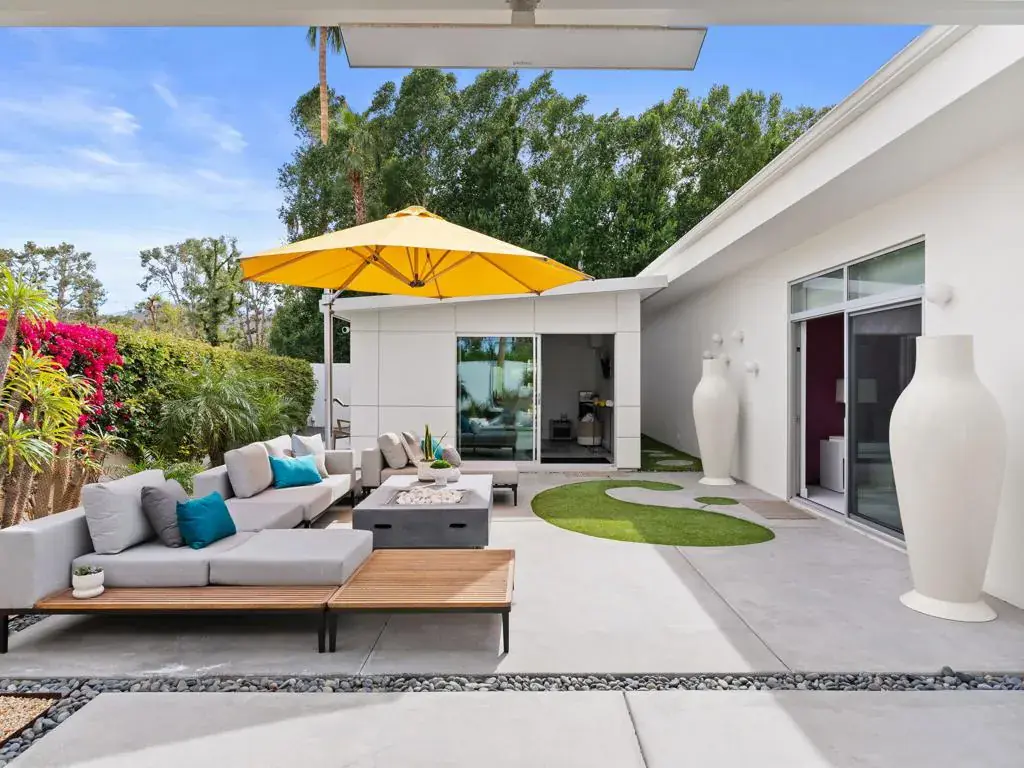 Reimagined both inside and outside by the talented owner-designer, this residence has been transformed into a modern masterpiece. Commercial-grade windows and sliders, arranged in a Mondrian-inspired composition of varying glass sizes and shapes, enhance the home’s sleek lines, natural light, and dynamic color contrasts. This to-the-studs renovation includes a 38-panel solar system with three Tesla Powerwall batteries, a massive atrium with a lighted wall fountain and firepit, and two primary suites. The main suite features dual spa-like bathrooms, two custom walk-in closets, in-room laundry, and direct access to the backyard and gym. The secondary primary suite offers luxe carpeting, a designer ensuite bath, and a private patio. The striking ultra-modern kitchen boasts an expansive island, high-end appliances, and custom cabinetry with quartz countertops. Outdoor enhancements include a motorized pergola with recessed heat lamps and a detached structure that is currently used as a private gym. A spacious guest suite ensures comfort for visitors and also has a stunning en-suite bathroom. With panoramic mountain views to the east and west, the home is ideally located near the renowned El Paseo Shopping District, Historic Highway 111, and prestigious golf clubs, blending high-end functionality with modern sophistication. Seller is open to credit towards substantial RATE BUYDOWN dependent on offer.