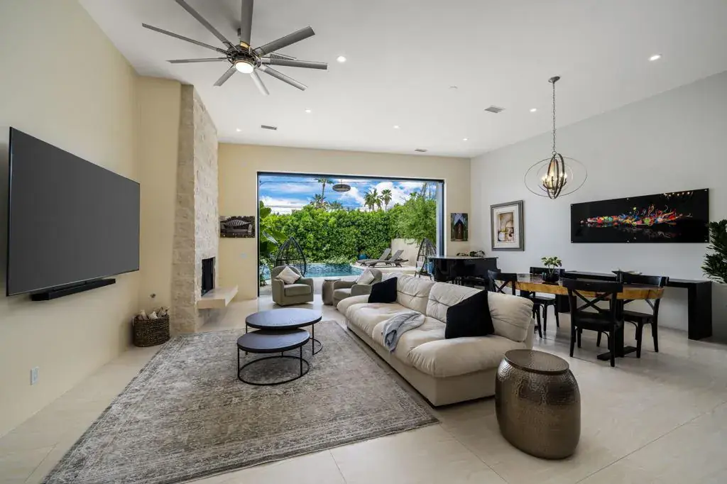 Completely rebuilt in 2020, this custom home blends modern design with organic finishes and meticulous craftsmanship. From the moment you step through the mahogany front door into the light-filled foyer, soaring ceilings, natural limestone accents, and solid 8′ mahogany doors set the tone for a true desert retreat.The open-concept living space features a wine bar, stone fireplace, and oversized pocket doors that disappear to seamlessly connect indoors and outdoors. Multiple conversation areas extend to a private patio, sparkling pool with natural stone decking, outdoor shower, floating BBQ, and lush garden filled with fruit trees, grapes, olives, and herbs.The gourmet kitchen is a chef’s dream, with a Sub-Zero refrigerator and freezer, six-burner Thermador range with griddle and pot filler, double ovens, dual sinks and dishwashers, expansive walk-in pantry, and a striking 5×10 granite waterfall island with seating and storage.The primary suite offers artisan iron-and-glass French doors to a private courtyard with fire feature, spa-like bath with freestanding tub, open shower, dual vanities, and two private toilets plus a custom walk-in closet. A second en suite bedroom, two guest rooms with Jack & Jill bath, a powder room, laundry, and mudroom complete the interior.Additional highlights include:XL 3-car garage (24×30) with 10′ ceilings, 8′ clearance doors, EV pre-wireFoam roof for added insulationNew underground plumbing, electrical, gas, and water with 200-amp serviceZoned HVAC (3 systems)Custom paver driveway and courtyardsBuilt-in angled concrete patio benchMultiple natural limestone walls and pillarsLocated at the end of a quiet street, this oversized lot offers mountain views and complete privacy, all within walking distance to El Paseo, dining, shopping, tennis, farmers market, and hiking trails.