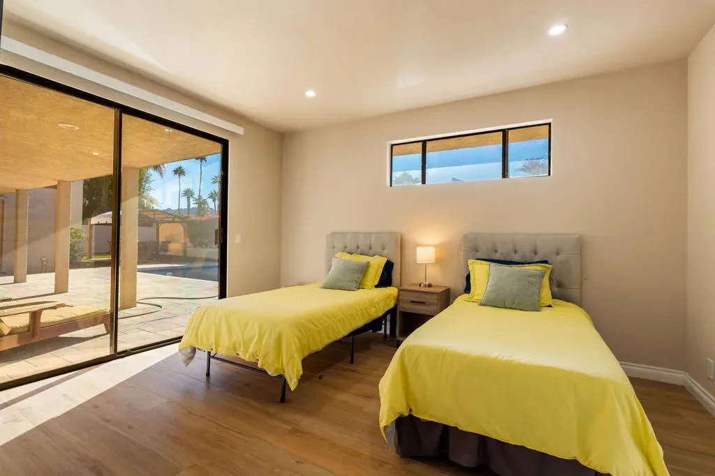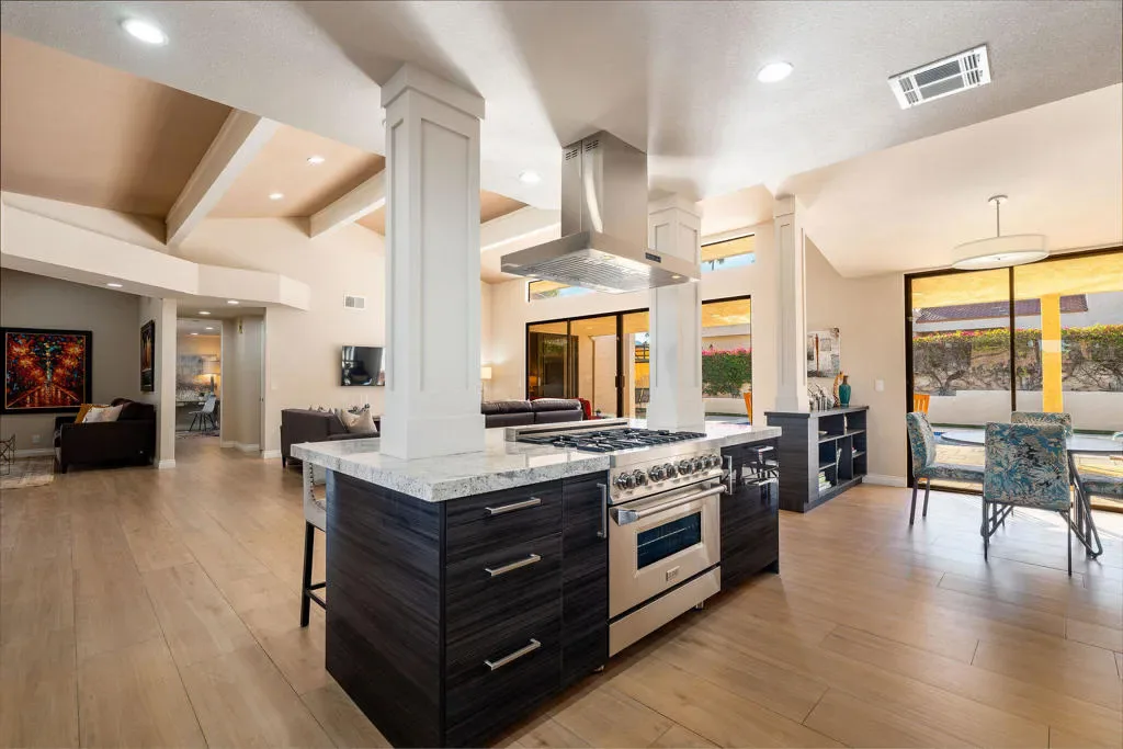 An exceptional South Palm Desert residence, fully reimagined through a complete down-to-the-studs renovation in 2021, offering refined desert living with modern systems, thoughtful design, and owned solar–all in a desirable non-HOA setting. This south-facing home was entirely rebuilt to today’s standards, including new interior walls, ceilings, flooring, roof, fireplace, appliances, hot water heaters, and a new garage door and opener, resulting in a property that lives with the ease and confidence of newer construction. Expansive living spaces are filled with natural light and defined by soaring ceilings and exposed beams, creating a sense of volume and architectural interest. The custom kitchen serves as the centerpiece of the home, featuring a large granite island with seating, a commercial-style gas range, and seamless flow to the surrounding entertaining areas. A built-in wet bar with beverage and wine coolers enhances both daily living and hosting. Outdoors, the private backyard offers a resort-style experience with a striking glass-tile pool and spa, expansive imported travertine decking, and a gazebo perfectly positioned to enjoy mountain vistas and dramatic desert sunsets. The primary suite is a true retreat with direct access to the backyard and a spa-inspired ensuite bath complete with a standalone soaking tub and walk-in closet. Two additional guest suites each feature their own ensuite baths, providing comfort and privacy for guests or extended stays. Porcelain tile flooring runs throughout the home for a clean, cohesive aesthetic and easy maintenance. Owned solar, installed in late 2021, delivers outstanding energy efficiency and meaningful long-term savings. Surrounded by low-maintenance desert landscaping and ideally located near El Paseo’s renowned shopping, dining, golf, and hiking, this home offers a rare blend of luxury, privacy, and modern desert sophistication.