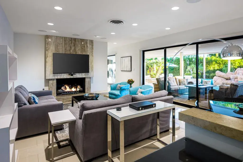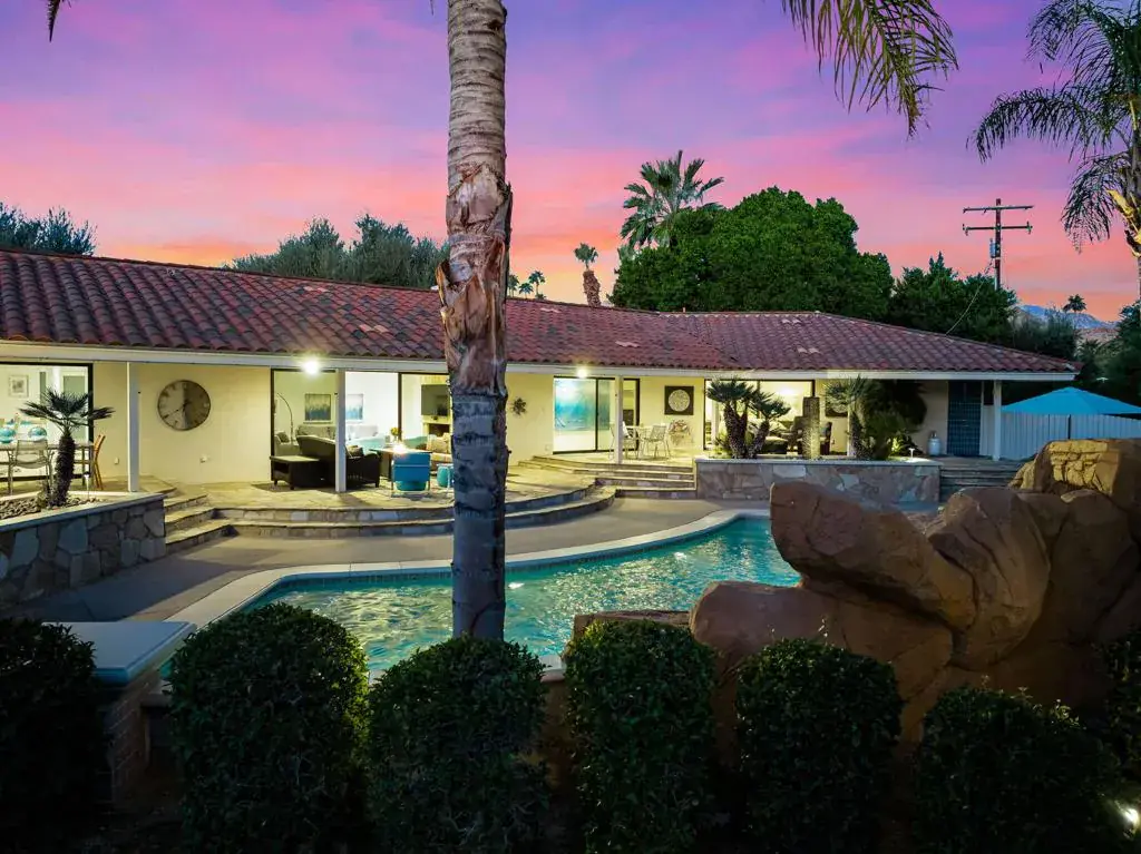 Designed and built in 1962 by the renowned architecture firm Patten & Wild, this mid-century modern residence captures the timeless elegance of South Palm Desert architecture with clean lines, effortless flow, and a seamless connection between indoors and out. Located at the end of a quiet cul-de-sac, the home offers mountain views from both the front and back, exceptional privacy, and a recessed position that enhances curb appeal. Set on an expansive 0.53-acre parcel, significantly larger than most in the neighborhood, the property offers generous outdoor living and room for future development. The backyard is designed for entertaining, with mature landscaping, thoughtful hardscape, and a 20,000-gallon pool featuring a dramatic rock formation and cascading waterfall. Inside, a 2013 renovation updated the home while honoring its mid-century roots. Open living and dining areas flow through six glass sliders to the pool and patio, including direct access from both master bedrooms. The kitchen features Thermador double ovens, a 6-burner cooktop with glass-flared hood, KitchenAid appliances, espresso cabinetry, and a designer-selected palette that reflects refined Desert Contemporary style. Each of the three bedrooms has an en-suite bathroom and walk-in closet, and a private office provides a quiet workspace. The home includes a comprehensive smart system with over 50 smart switches, remote-accessible controls for door locks, pool, thermostats, smoke and CO₂ monitors, and irrigation. Offered fully furnished inside and out, it is truly turn-key, with recent upgrades including newly stained concrete, refreshed garden beds, a new pool heater, new pumps for the waterfall and filtration system, an outdoor shower, and backyard misters. Minutes from El Paseo, this property combines architectural legacy, significant privacy, and rare oversized lot with future development potential.