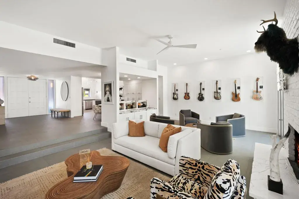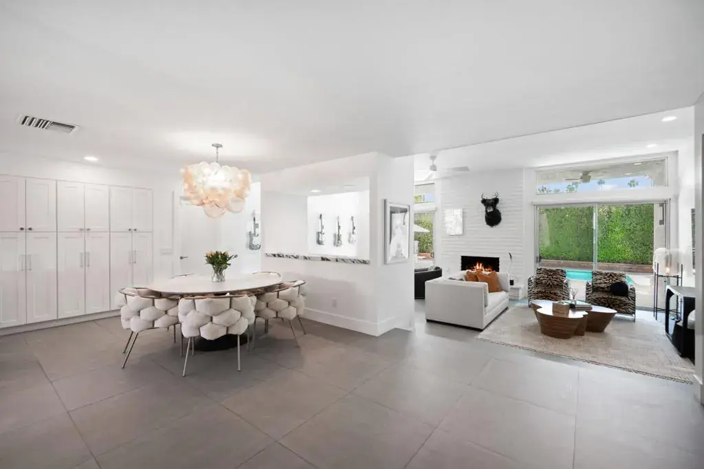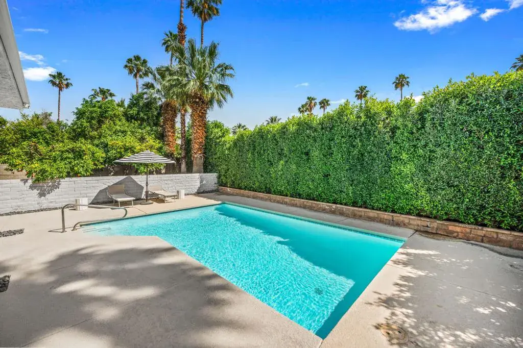 Designed by acclaimed New York designer Deux Ellis, this South Palm Desert residence is a true statement of modern desert living. Located along Shadow Mountain Golf Course, the home blends timeless design with thoughtful details and luxurious finishes throughout.Inside, warm stone and wood flooring meet Italian leather marble countertops and Restoration Hardware fixtures, creating an elevated yet comfortable atmosphere. The open kitchen with stainless steel appliances and bar seating flows seamlessly into a sunken living room with a charming brick fireplace and wet bar ideal for entertaining or relaxing evenings in. Expansive windows and sliders fill the home with natural light and open to the south-facing backyard, where the sparkling pool takes center stage against the mountain backdrop.Each bedroom offers direct patio access for effortless indoor-outdoor living, while the separate office provides flexibility for work, art, or wellness space. Outside, enjoy multiple seating areas, a covered patio, and lush landscaping with mature citrus trees, all designed for privacy and relaxation.Additional highlights include a two-car garage plus golf cart space, designer lighting by Tom Dixon and Oly Studio, and no HOA fees. Just minutes from El Paseo’s shopping and dining and within the Washington Charter School District, this home embodies the best of desert living.