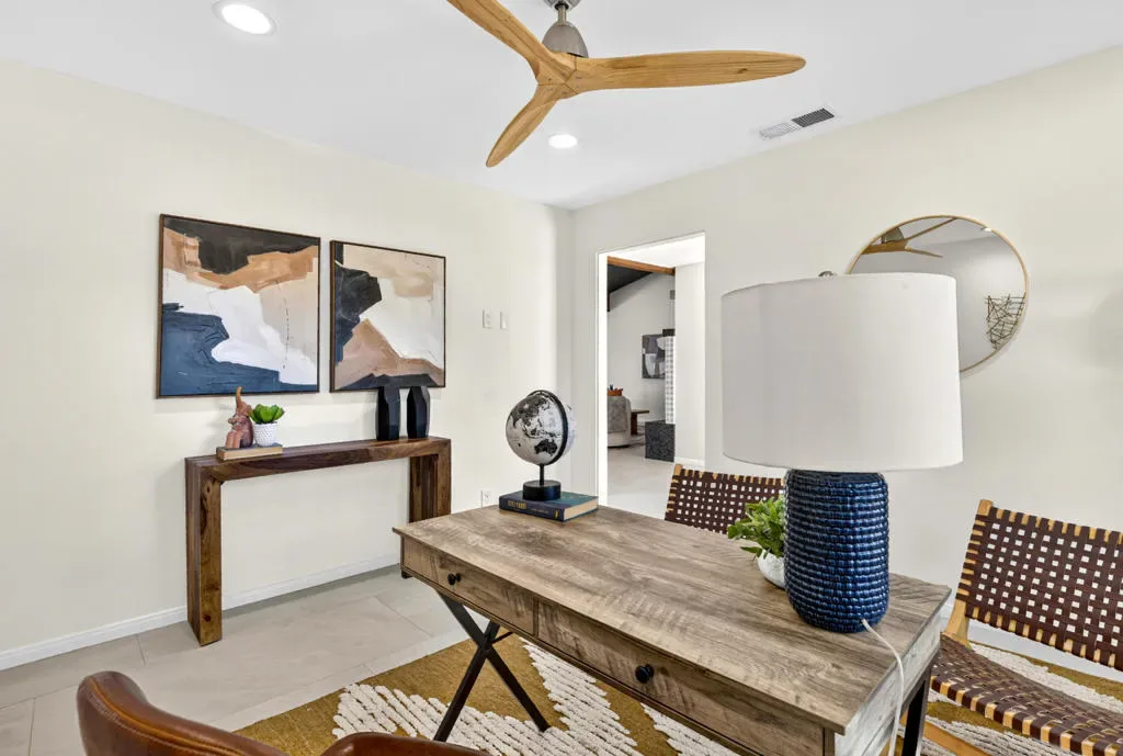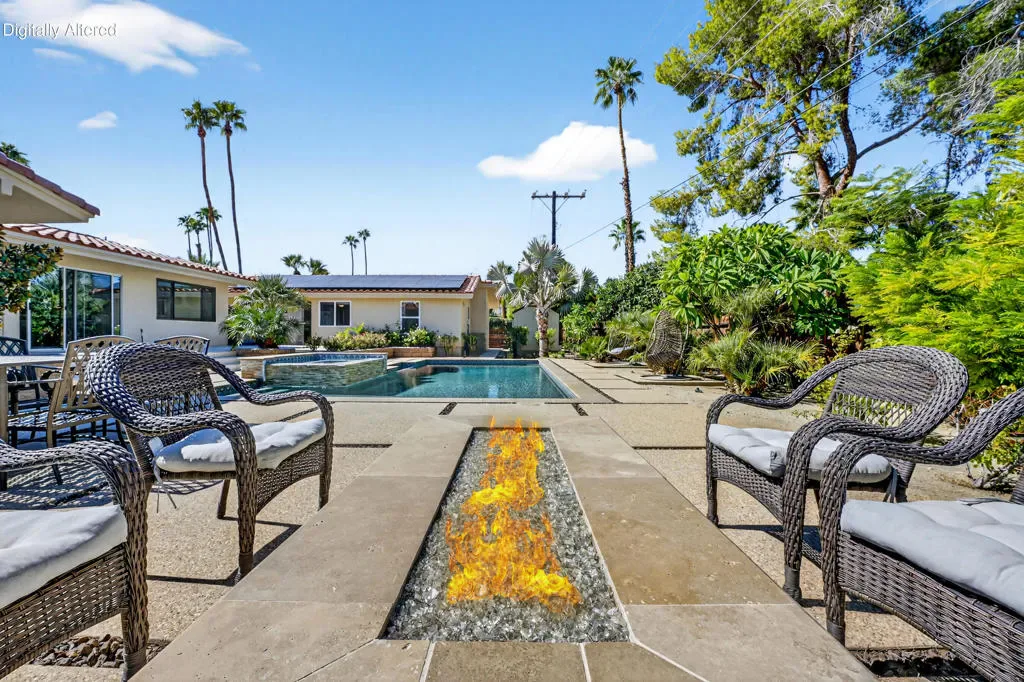 Rare opportunity to own a fully renovated desert retreat in the heart of South Palm Desert, complete with a detached casita and resort-style outdoor living. Set behind professionally landscaped grounds and a striking limestone-accented exterior, this home is designed for effortless indoor-outdoor flow and elevated everyday living.Inside, an open-concept layout is highlighted by soaring vaulted hardwood ceilings and refined designer finishes throughout. The inviting family room is anchored by a gas fireplace and flows seamlessly into a show-stopping kitchen built for gathering. A dramatic stone waterfall island with seating for six is complemented by a six-burner range, wine and beverage refrigerator, and generous custom cabinetry–ideal for both entertaining and daily life.Expansive dual sliders open to a private backyard oasis, where porcelain tile continues from interior to patio for a seamless transition. Enjoy a resort-inspired setting featuring a Pebble Tech pool and spa, built-in barbecue, and custom fire feature–perfect for relaxed afternoons, evening entertaining, and starlit desert nights.The primary suite is a serene private retreat, offering a spa-like bath with rain shower, dual vanities, private water closet, and dual walk-in closets. Two additional guest bedrooms and a full bath are thoughtfully positioned for privacy, while an office, powder room, laundry area, and abundant storage enhance comfort and functionality.A fully finished detached casita adds exceptional flexibility with its own full kitchen, spacious living area, and private entrances from both the backyard and side yard–ideal for guests, extended family, or potential rental use.Purchased solar adds energy efficiency to this exceptional South Palm Desert residence, where refined design, flexible living, and resort-style amenities come together in perfect balance.