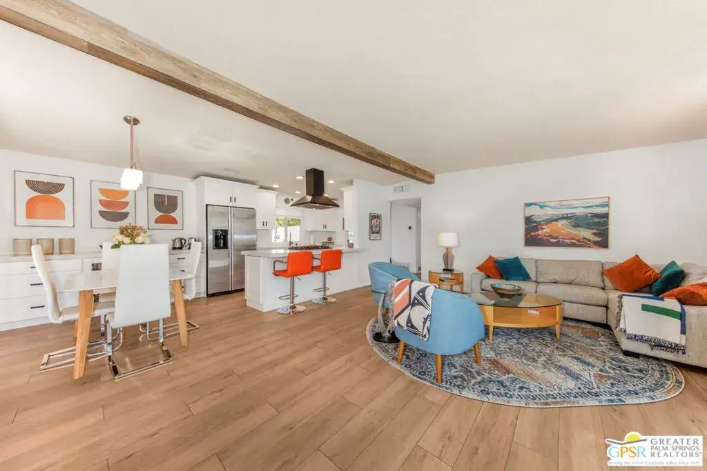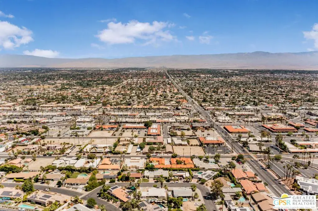 Exceptional Location in South Palm Desert! This charming Mid-Century home is ideally located within walking distance of the upscale shops and dining on the iconic El Paseo. Enjoy bike rides through the peaceful, scenic neighborhood, complete with stunning mountain views. The furnished home boasts an upgraded kitchen featuring stylish cabinetry and hardware, quartz countertops, a Koehler cast iron sink, and porcelain wood flooring throughout. The updated fireplace adds extra warmth and style to the living space. There are 2 OWNED solar systems, one for the pool and one for the house, which helps with rising electricity costs. The roof was replaced in 2024. Step outside to discover a beautifully upgraded Pebble Tech saltwater pool, a hot tub, and recently upgraded landscaping, perfect for relaxing or entertaining. Nearly every room in the home opens to outdoor patios, including a covered patio that has been added by the sellers off the living room, and the lush backyard, offering a seamless flow between indoor and outdoor living. The generous primary suite opens to a private south-facing pool area with breathtaking mountain views. The third bedroom offers flexibility, ideal as a home office or guest room. Make this your permanent home or weekend escape, this property has it all!