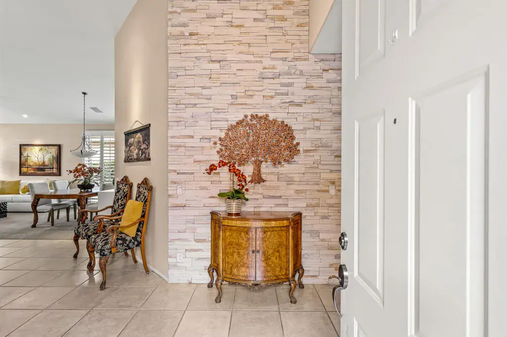 Perched on a premier, south facing lot overlooking the 2nd green–with tranquil lake views and the Santa Rosa Mountains in the distance–this beautifully upgraded home sits adjacent to the enclave’s private pool and spa. Thoughtful enhancements throughout make it both inviting and functional, including the upgraded kitchen. The kitchen features granite countertops, quality appliances,including double ovens a 5 burner gas cook top and opening seamlessly to the spacious family room. Anchored by a striking stack stone ‑accented fireplace wall with a large screen TV. This warm gathering space flows effortlessly to the expansive patio, where sweeping views of the golf course and Santa Rosa Mountain vistas create the perfect backdrop for relaxation or entertaining. The patio is generous in space which allows your guests to enjoy the peacefull sounds of the water feature on the lake.Formal living and dining areas offer additional room to host with ease, while the generous primary suite provides a peaceful retreat complete with a well‑appointed bath, featuring a soaking tub, separate shower, and dual vanities. A secondary bedroom and bath are conveniently located down the hallway for added privacy. Currenty the study is being used as an addtional sleeping area.A sizable two‑car garage with a dedicated golf cart space, workbench, and abundant storage completes the home’s practical amenities.Life at The Oasis extends far beyond the front door–residents enjoy golf, tennis and pickleball courts, a dog park, driving range, putters course, 18 sparkling pool and spas, a vibrant Clubhouse offering a formal dining room, grill room, library, card room, and Pro Shop.The Oasis CC is close to world class recreation, shopping and dining.Come and see this home!