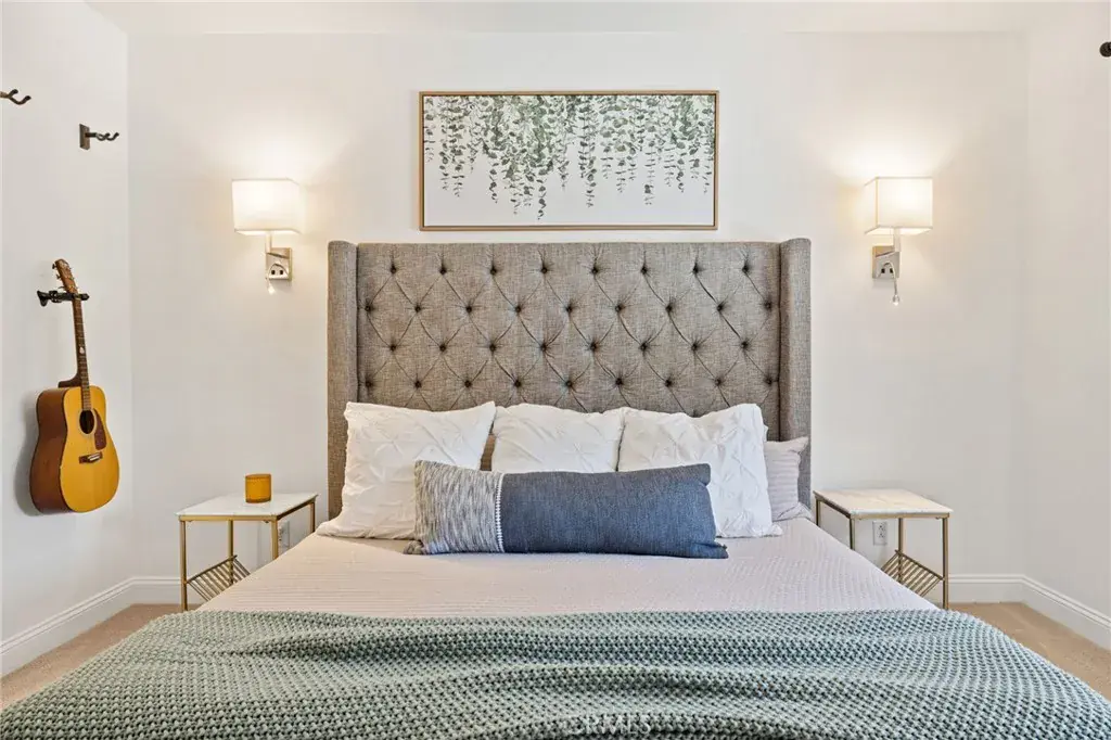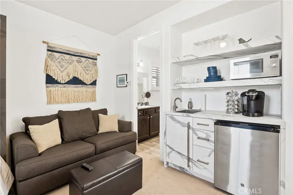 An open floorplan with custom designed chef’s kitchen with plenty modern amenities. Walk-in pantry with wine rack wall, quartz countertops and full height backsplash. Custom built-in walnut and bronze glass dining table. Custom white oak modern built-in entertainment wall with wrap-around millwork with integrated primary bedroom interior door. Surround sound Sonos speakers in ceiling throughout main living area as well as out in the backyard. Porcelain wood grain flooring, new baseboards, new door casing, entire home recently painted. The casita includes a kitchenette and separate entrance with its own AC. Main home also has own AC unit as well as a newer mini split system in the garage, washer and dryer in home.