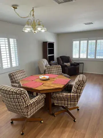 Looking for a nice quiet neighborhood with easy access to the back gate? This is it! With an open floor plan, this is a great home for entertaining family and friends. The living, dining, and family rooms are all conveniently located off the updated kitchen which has a large breakfast bar for cozy dining. The home is dry walled throughout, has plantation shutters and laminate floors in living, dining, and family rooms. The guest bathroom has recently been remodeled with a large walk in tile shower. The master bedroom is spacious with a walk-in closet. The master bath has a newly installed walk-in tub with an overhead shower head and jets for a great relaxing bath. Both the hot water heater and air conditioner have been recently replaced for more efficient energy along with a rooftop evaporative cooling system. The home comes with a golf cart and an insulated, air conditioned shed. There is carport parking for one with an additional driveway for two, tandem style. The current HOA fees of $400 include FREE golf, trash, cable TV, internet, guarded gate and roaming patrols. Our community has a beautiful clubhouse, banquet facilities, pools, fitness center, sport courts and numerous social clubs available.
