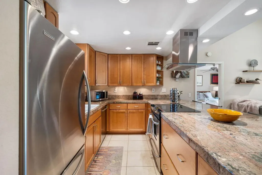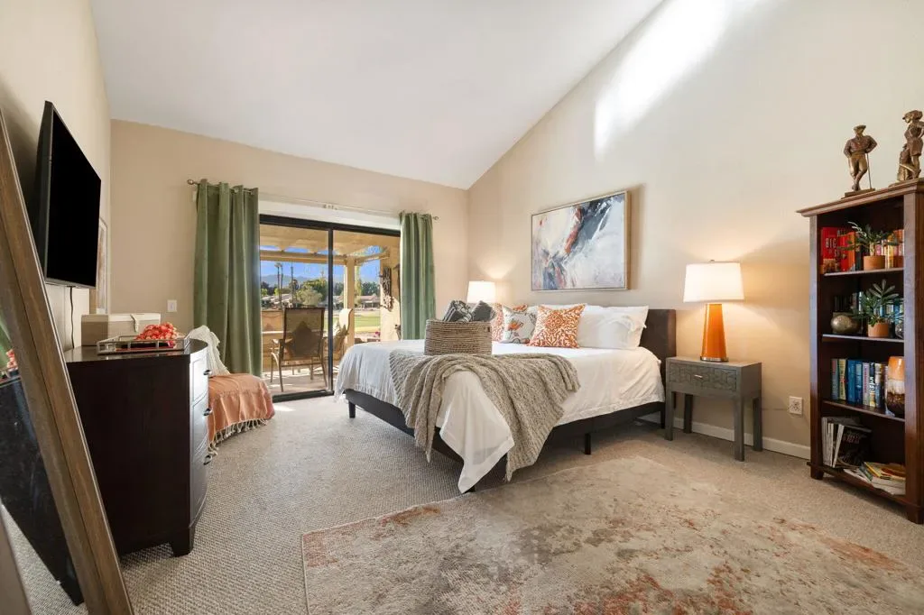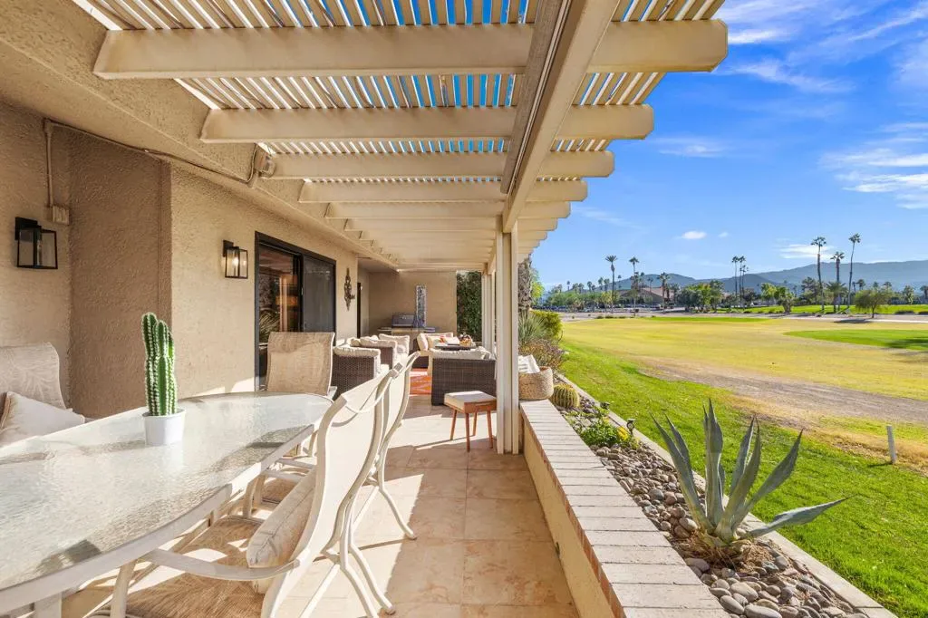 Introducing this exquisite Vintage Model showcasing panoramic views of both the mountains and the expansive 10th fairway. Southwest facing location with the Cafe, Clubhouse and 2 salt water pools/spas just a short walking distance away.. As you enter, you’ll be welcomed with warm color tones with natural light that fills the space. Enjoy cooking and entertaining in the open kitchen with stainless steel appliances, granite countertops, and an ample-sized peninsula for added counter space and eating. The breakfast bar seating has plenty of cabinet space for your storage needs. The vaulted ceilings in the open concept living room make this home feel spacious and welcoming. Intelligent floor plan with owner’s suite and bath is on one side of the home, and guest bedroom and bath on the opposite side, which is perfect for privacy and separation, and makes this one of the most popular models. Both bathrooms have quality finishes and have a complementary design with the rest of the stunning home.Step outside the sliding glass door, and you will see an extended tiled patio with a patio cover and an exterior pony wall for furry friends with sunset views that cannot be missed. A 2-car garage is attached, which is a valuable feature. Exceptional FURNISHINGS(some have been improved from photos) included per inventory list! The Palm Desert Resort Country Club has a beautiful clubhouse, Coachella Valley’s premier pickleball and tennis club, and an award-winning golf course. The resort is a very active community with a clubhouse (includes formal dining, a lounge, and a pro shop), and 20 pools and spas. The Resorter has a guard gate with 24-hour security. There is proximity to dining and shopping. Desert activities include hiking and biking trails near the resort. The resort is 4 miles from the Indian Wells Tennis Gardens, 10 miles from Empire Polo Grounds, 25 minutes to the Palm Springs Airport, and 2.5 hours to San Diego, Los Angeles, and Disneyland. The resort is a gem and is short-term rental friendly. You will be in paradise out on the patio, enjoying the sunset views and resort ambiance! This is a must-see!