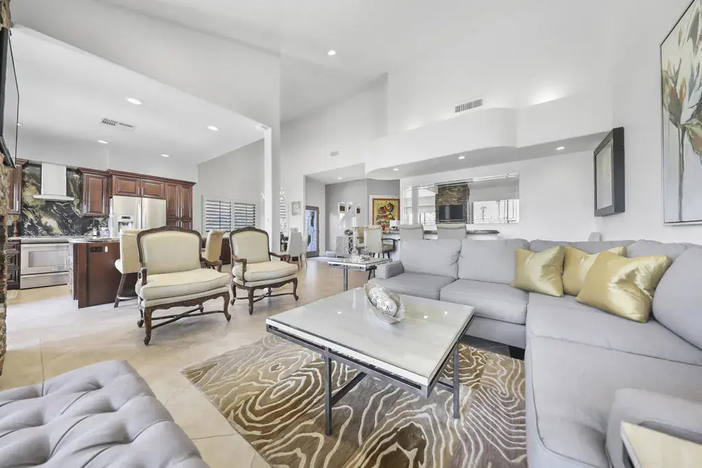 Beautiful Lakefront Luxury Condo Completely Remodeled with Golf and Tennis Membership!This is the getaway you have been dreaming of in the desert! This stunning Lakefront condo is gorgeous and now available for the first time as a SHORT TERM RENTAL! This 3 BR, 3BA condo has been reconfigured making this a one-of-a kind Sycamore model on one of the best view lots in Palm Valley CC. As you step through the custom glass entry door you immediately notice the breathtaking lake view, lush golf course and majestic mountains that extend gracefully through the windows and sliders creating an indoor-outdoor ambience for entertaining, then you look at the home and discover the entire home has been professionally and tastefully decorated! This floor plan has soaring ceilings that seamlessly connect to the dining area and a 12 ft. granite wet bar w/ wine cooler where friends & family will enjoy gathering. This beautifully upgraded condo offers boundless enhancements including motorized interior blinds, 2 car garage w/ epoxy floor, stacked stone fireplace w/ flat screen TVs, a built-in BBQ, wall insets to showcase the beautiful artwork and every room has been recently painted making it light and bright. The kitchen is a dream for the cook in the family and boasts a unique semi-circle granite kitchen island w/ seating for 5, under counter microwave, stainless Frigidaire appliances and a chic stainless steel and glass hood. All the bathroom ensuites have raised granite counter tops, Toto toilets, custom sinks and faucets, custom designed showers. The Primary ensuite showcases a recessed wall mounted 55” television, 2 walk-in closets dual sinks w/granite counter tops, custom designed shower, and a private bedroom patio. One of the guest bedrooms is currently used as a den w/ a custom entertainment wall that houses a recessed 65” television, built-in desk, stacked stone wall from floor to ceiling, & custom wall cut-outs which provide a flow through feel. Palm Valley CC is conveniently situated just minutes away from various shopping destinations, including El Paseo, The River, Casinos, Living Desert Reserve and so much more! There is a vast array of dining options in the desert and numerous grocery stores are also nearby, such as Whole Foods, Bristol Farms as well as Costco. This is the lifestyle we love here in the desert so come be a part of it and experience the 5 Star resort lifestyle of Palm Valley CC, one of the desert’s most vibrant communities!