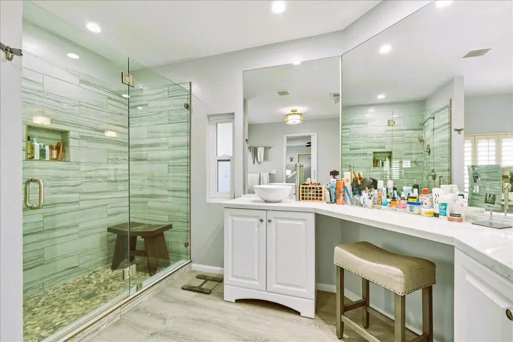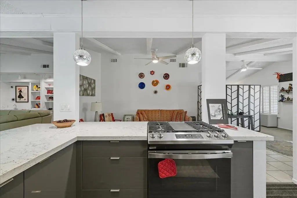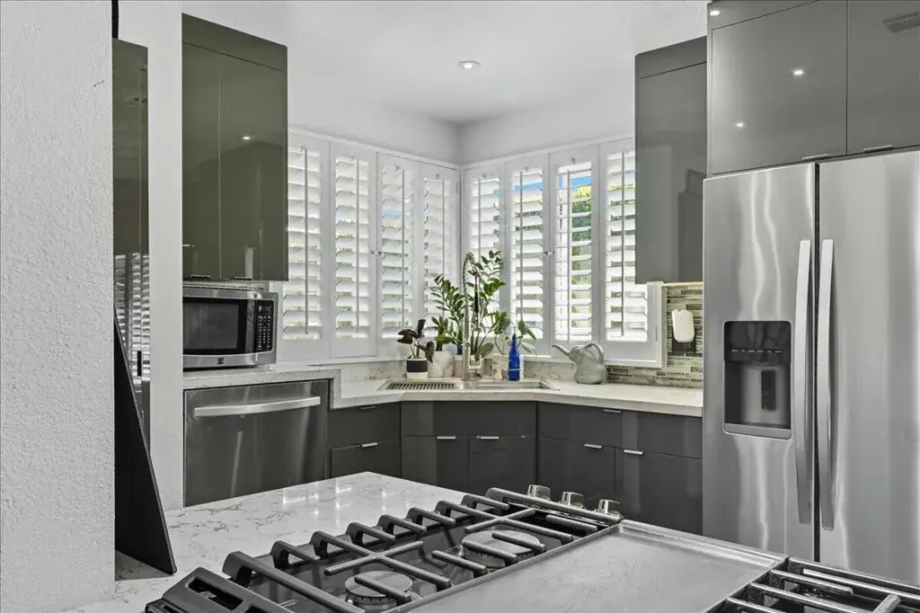 Contemporary & spacious Desert Oasis awaits its new owner. 55+Gated Golf Country Club living. Over 1900′,this home has a great open floor plan with vaulted ceilings, dry-wall, gorgeous remodeled kitchen, large family room, 2 primary bedrooms with their own baths, attached 2-car garage & a wonderful backyard. The gourmet kitchen has been recently remodeled with designer cabinets, quartz counters & Island, stainless steel appliances. The recessed & custom lighting with the modern charcoal cabinetry is stunning. The kitchen is open to both the formal dining or extra lounge area and a large great room with custom cabinetry, plantation shutters, wet bar & track lighting. The entry way living room is currently an artist retreat with plantation shutters, high ceilings & windows looking out to the landscaped front yard. You will love the primary bedroom with double walk-in closets & the remodeled bath with recessed lighting, tile shower, dual sinks & quartz counters. Guests will love the privacy of their own en-suite bath as well. Plenty of room in the laundry with sink, storage & room for your computer work station. The backyard is special! A private Oasis with covered patio enclosed with sliding screen doors opening to the lovely garden area shaded by a private ficus hedge. Plenty of room for your canine or feline pals. A special bonus – At one end of the patio is a separate custom Arts & Crafts Studio – And don’t forget the 2-car garage with plenty of extra storage room. Portola CC is an active community with pickle ball courts, 3 pools, newly remodeled clubhouse with Pub & a beautiful 18-hole par three golf course where play is included in the low HOA fee. Home is on a permanent foundation for ease of financing. You also own your land in Portola which protects the future value of your home. Great location near all the shops & restaurants of El Paseo, Palm Desert Community Park with shaded walkways, ponds, & dog parks. Close to McCallum Theatre with its year-round shows & entertainment & nearby Eisenhower Medical Center. Come take a look at why so many are choosing Portola CC as their choice for a great Desert Living lifestyle.