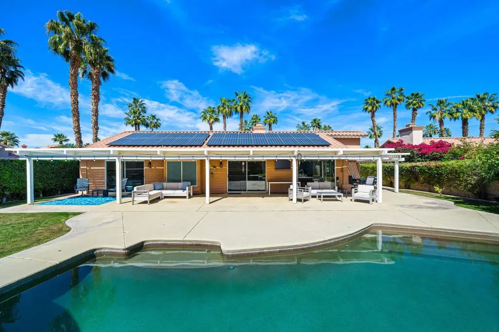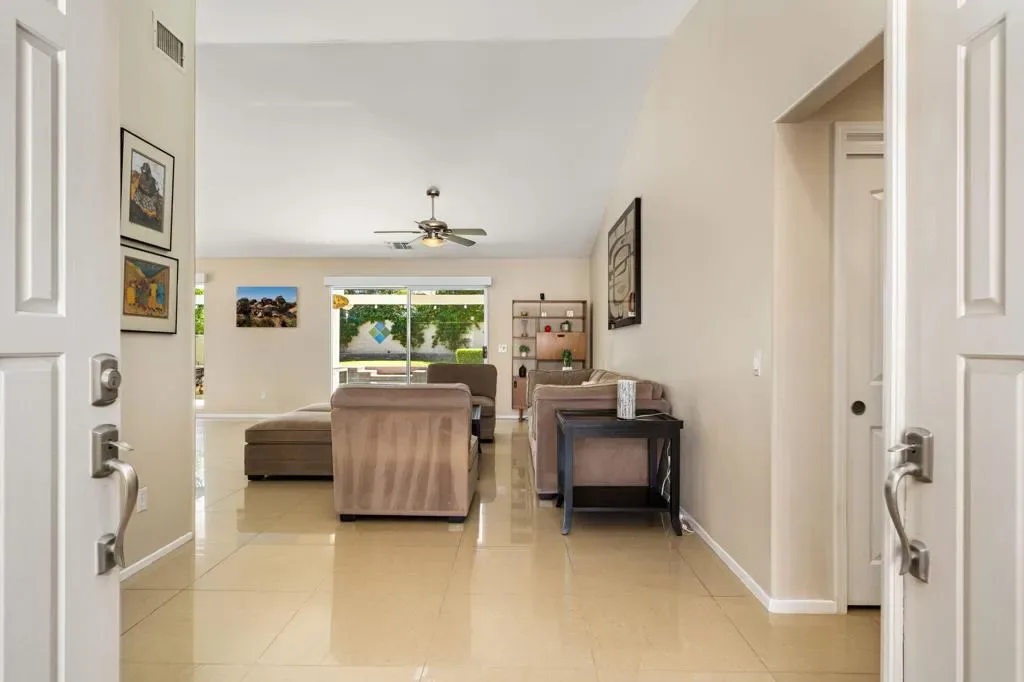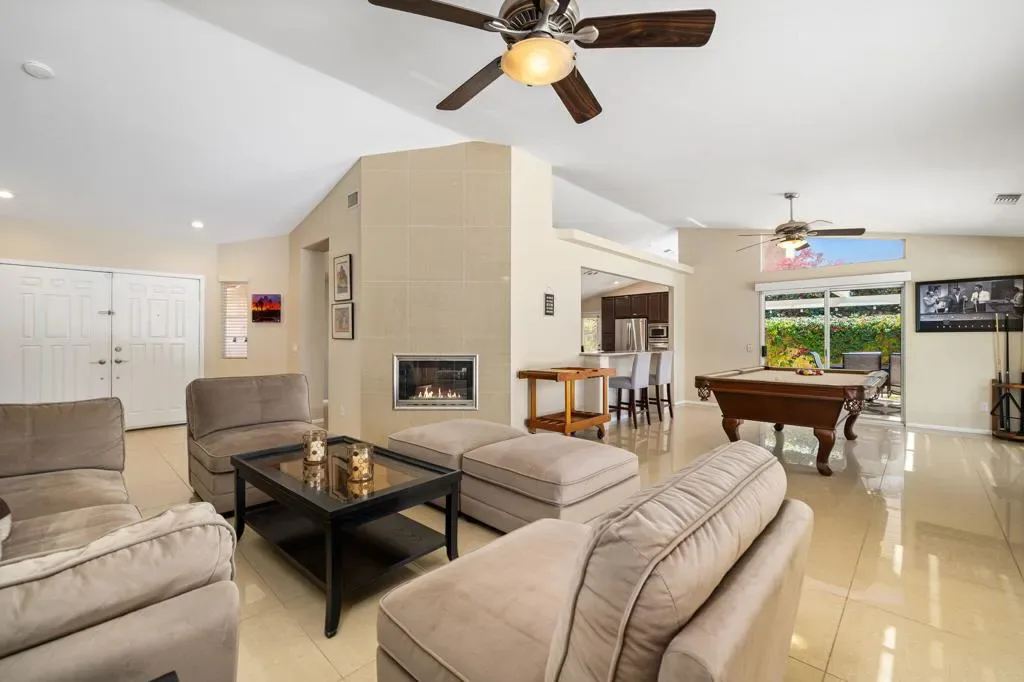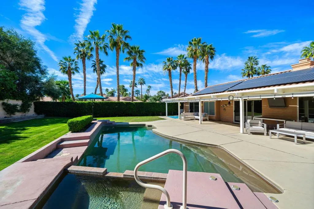 HIGHLY DESIRED & RARELY AVAILABLE! This beautifully designed single-story saltwater pool home offers 3 bedrooms, 3 bathrooms, and a 3-car garage, perfectly positioned on an expansive south-facing corner lot designed for enjoying the desert lifestyle year-round. Inside, the main living area is highlighted by a dual-sided gas fireplace that creates a warm focal point between multiple living spaces. Large, sleek tile flooring flows throughout the home, adding a clean and modern feel, while sliding glass doors are equipped with automatic Lutron shades for added convenience. The kitchen provides ample cabinetry, a pantry, stainless steel appliances, and a center island featuring an induction cooktop with counter seating, plus a separate bar counter with additional seating. The primary suite serves as a private retreat, complete with sliding glass doors that open directly to the backyard and a generous walk-in closet. The en-suite bathroom features dual vanities, a relaxing soaking tub, and a separate walk-in shower. The guest bedrooms and bathrooms offer comfortable accommodations for family and visitors. Step outside to your slice of Palm Desert paradise! Enjoy the harvest of Key Lime, Tangelo, and Grapefruit trees from your own backyard. This large south-facing yard receives excellent sunshine throughout the day and beautiful sunsets in the evening. Relax in the heated saltwater PebbleTec pool and spa with newer Pentair equipment, lush grass, and covered patios. Additional features include leased solar, a garage A/C wall unit, low HOA dues and much more. Homes in the coveted gated community of Regency Estates rarely come available, making this an opportunity buyers have been waiting for. Schedule your private showing today!
