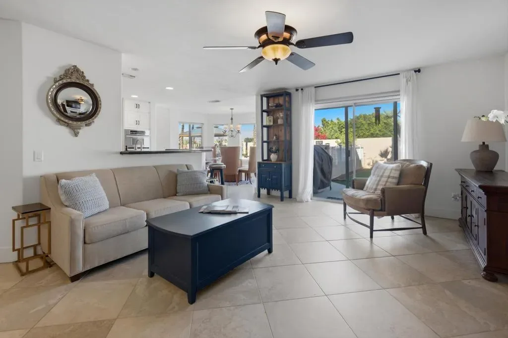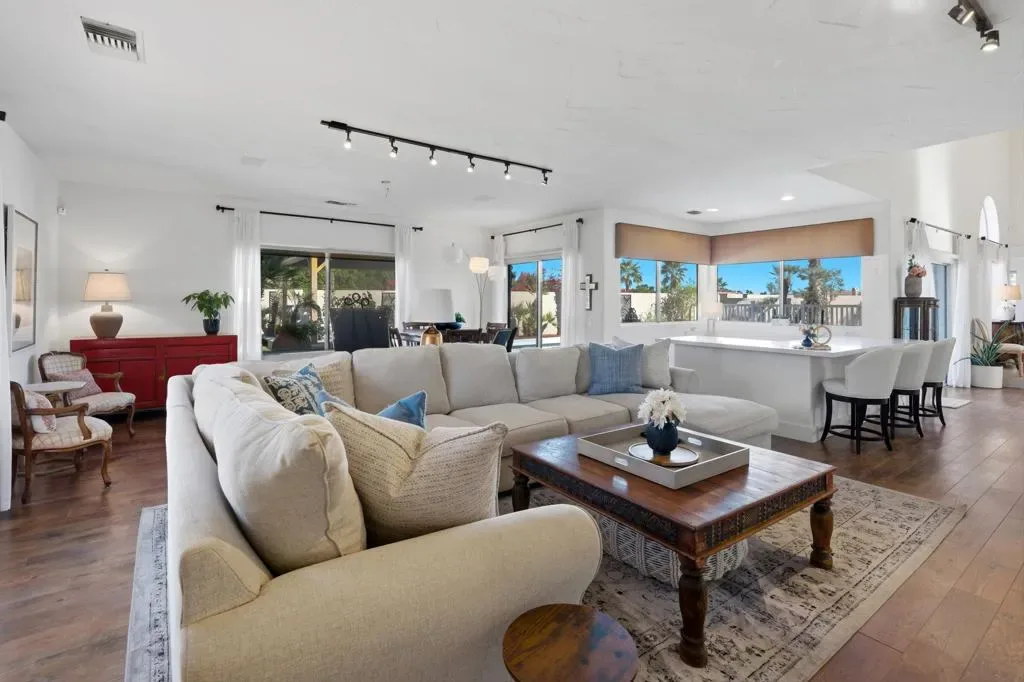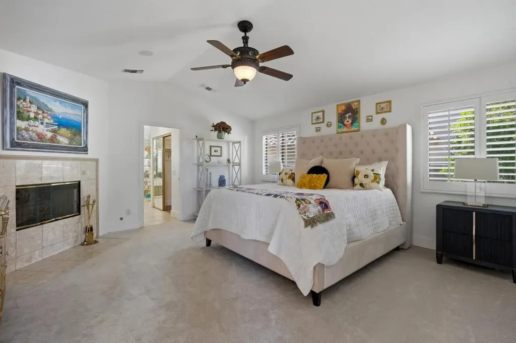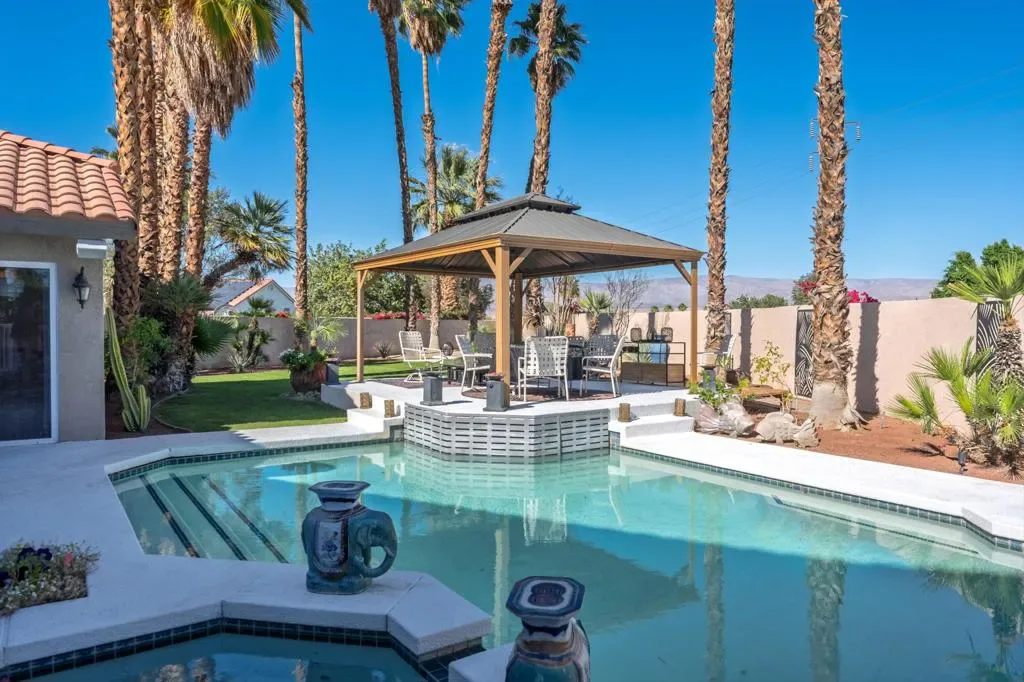 Regency Estates is a prestigious gated community in Palm Desert. This home features the highly sought-after ”Emperor” floor plan, the largest design within the development, offering exceptional space and refined living.This magnificent residence showcases soaring vaulted ceilings and an elegant tile entry, creating a welcoming atmosphere ideal for both comfortable living and entertaining. The lavish downstairs primary suite features a cozy fireplace and dual closets, providing a private and relaxing retreat.The living room has been extensively remodeled with new cabinetry, updated flooring, and a stylish bar area–perfect for hosting guests. Step outside to the expansive backyard situated on over 14,000 square feet, featuring desirable north-facing views, a pool, spa, and generous entertaining space. Solar is owned