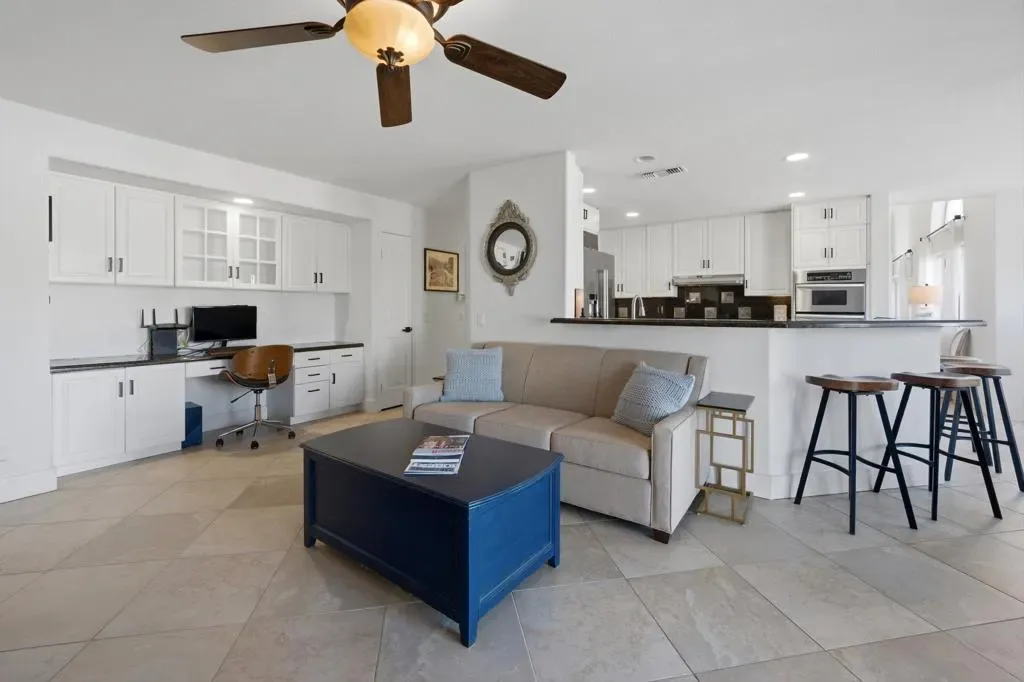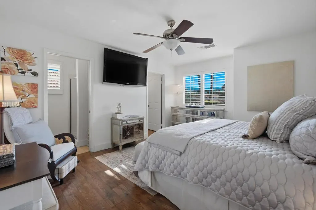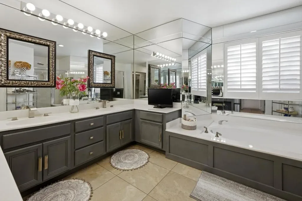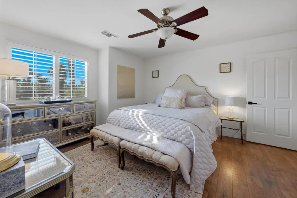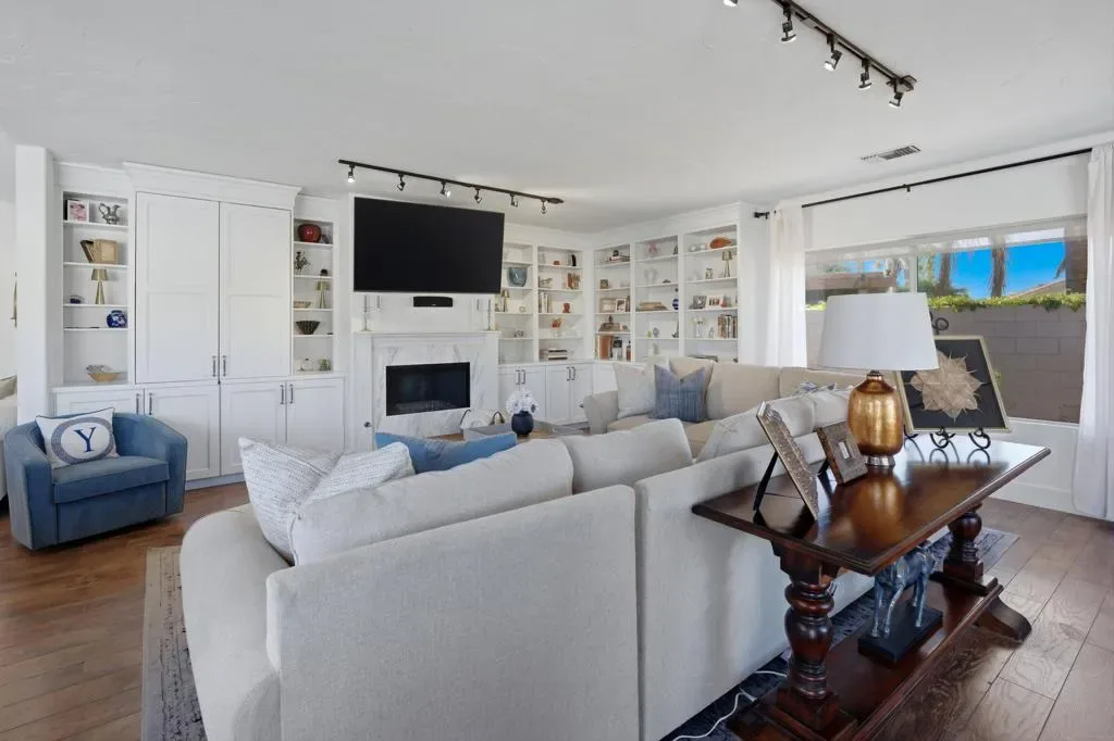 Regency Estates is a prestigious gated community in Palm Desert. This home features the highly sought-after ”Emperor” floor plan, the largest design within the development, offering exceptional space and refined living.This magnificent residence showcases soaring vaulted ceilings and an elegant tile entry, creating a welcoming atmosphere ideal for both comfortable living and entertaining. The lavish downstairs primary suite features a cozy fireplace and dual closets, providing a private and relaxing retreat.The living room has been extensively remodeled with new cabinetry, updated flooring, and a stylish bar area–perfect for hosting guests. Step outside to the expansive backyard situated on over 14,000 square feet, featuring desirable north-facing views, a pool, spa, and generous entertaining space. Solar is owned