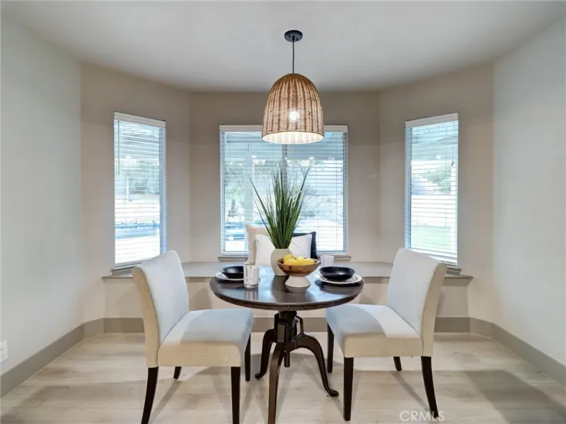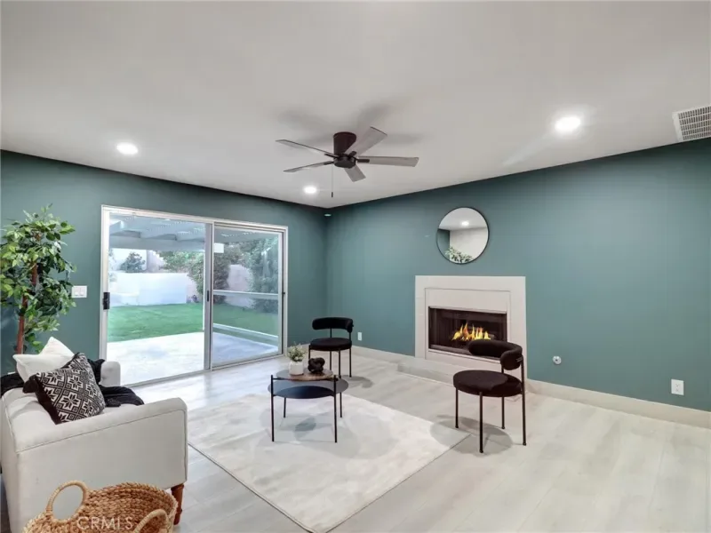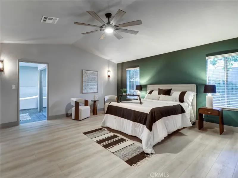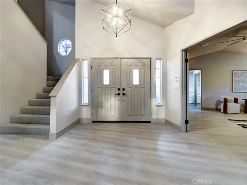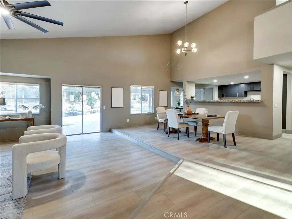 Step inside to soaring vaulted ceilings and an airy open floor plan filled with natural light. The spacious living room features warm wood-style flooring, contemporary finishes, and seamless flow into the dining and seating areas. A designer light fixture and modern ceiling fan complement the clean, modern aesthetic throughout the space.