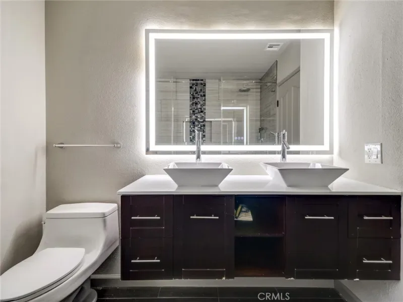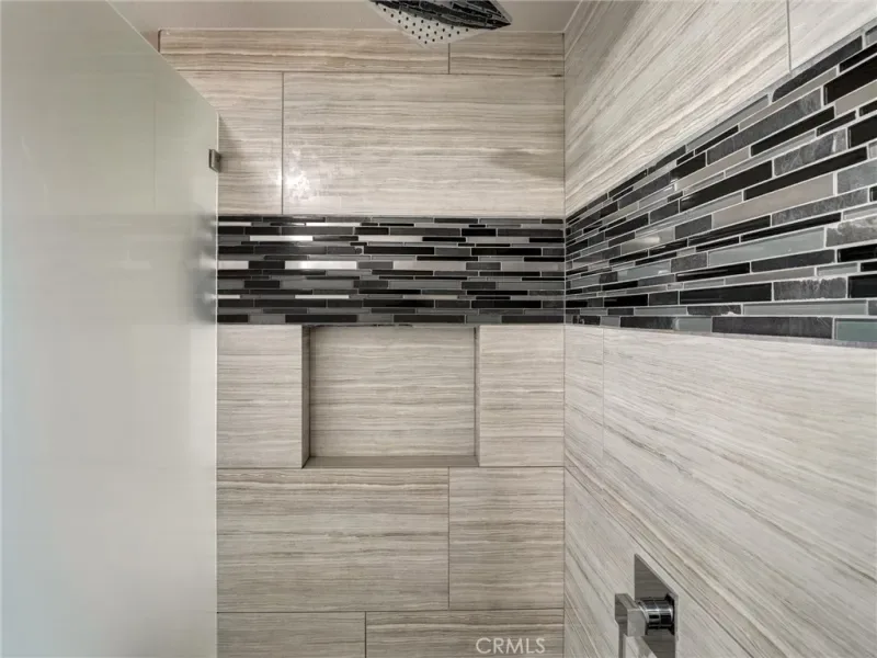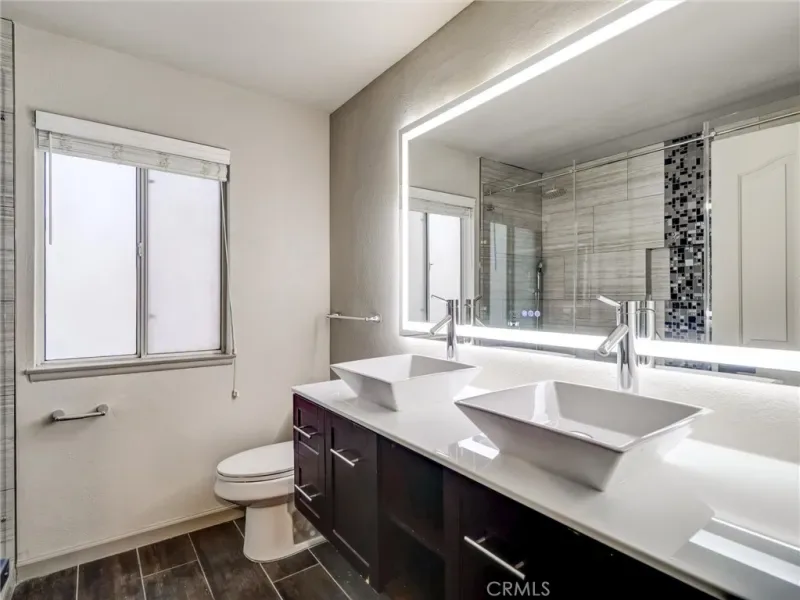 The bathrooms have been tastefully renovated with spa-inspired finishes, including a stunning freestanding soaking tub, sleek LED vanity mirrors, and custom wood vanities. The walk-in shower features stylish tile work with a modern accent band and built-in niche for a polished, high-end feel.
