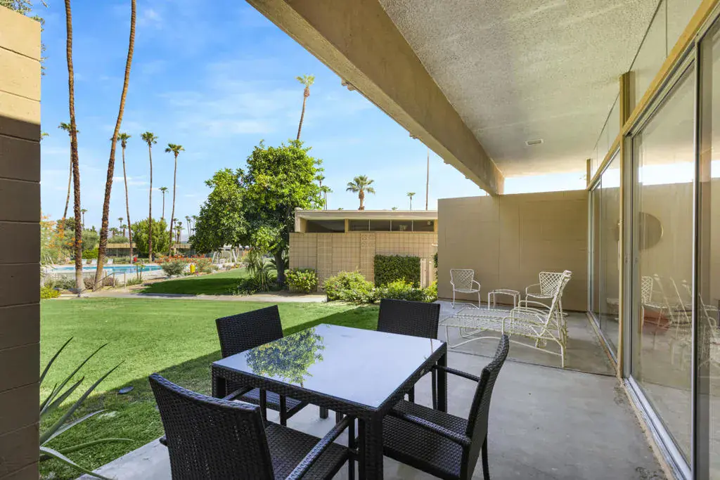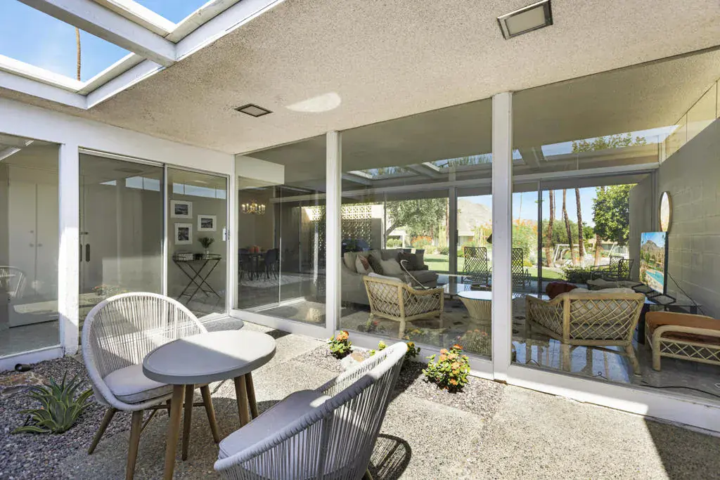Vacation in one of William Krisel’s most popular designs at Sandpiper Palm Desert! This 2 bedroom 2 bath 1,531 square foot vacation rental features the best of mid-century modern design: high ceilings and clerestory windows to let in the light, Shadowal block walls and privacy screens. The beautiful terrazzo floor tiles in the main living spaces complement the original architectural details throughout the condo. Walk through the private glass atrium entry and you’ll notice the clean lines and elegant design that lend a relaxed feeling to space. The poolside patio has the signature Sandpiper vintage block walls with a northwestern exposure that has gorgeous mountain, green space, and pool views. The master suite, featuring a king-size bed and an en-suite bathroom with an updated shower, gets plenty of light from the clerestory windows and overlooks a private patio and beautiful desert landscaping. The 2nd bedroom provides comfortable space for guests, and both bedrooms have comfortable carpeted flooring. One reserved carport parking space is just steps from the front door. Sandpiper is located within walking distance of the finest shopping and dining in Palm Desert, including the ”Rodeo Drive of the Desert”, the fabulous Shops on El Paseo. Enjoy your stay at Sandpiper for the ultimate in convenient, modern desert living. Rental Rates: Jan – Apr $6,000, May, Oct-Dec $5,500, Jun- Sep $3,500