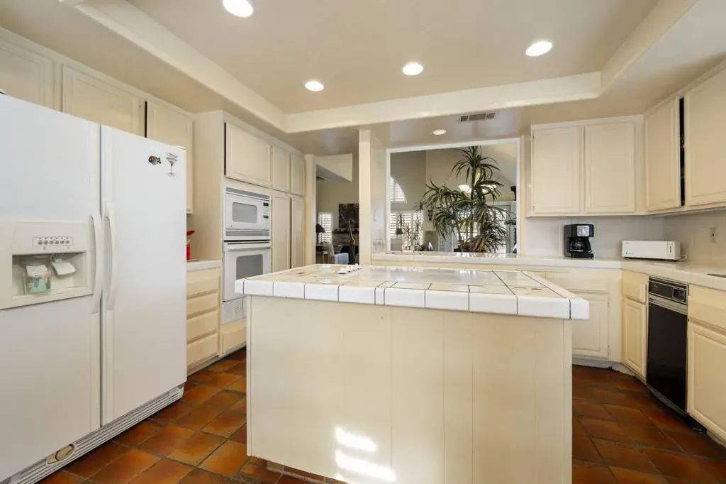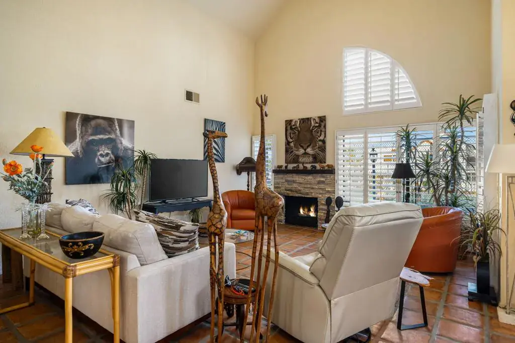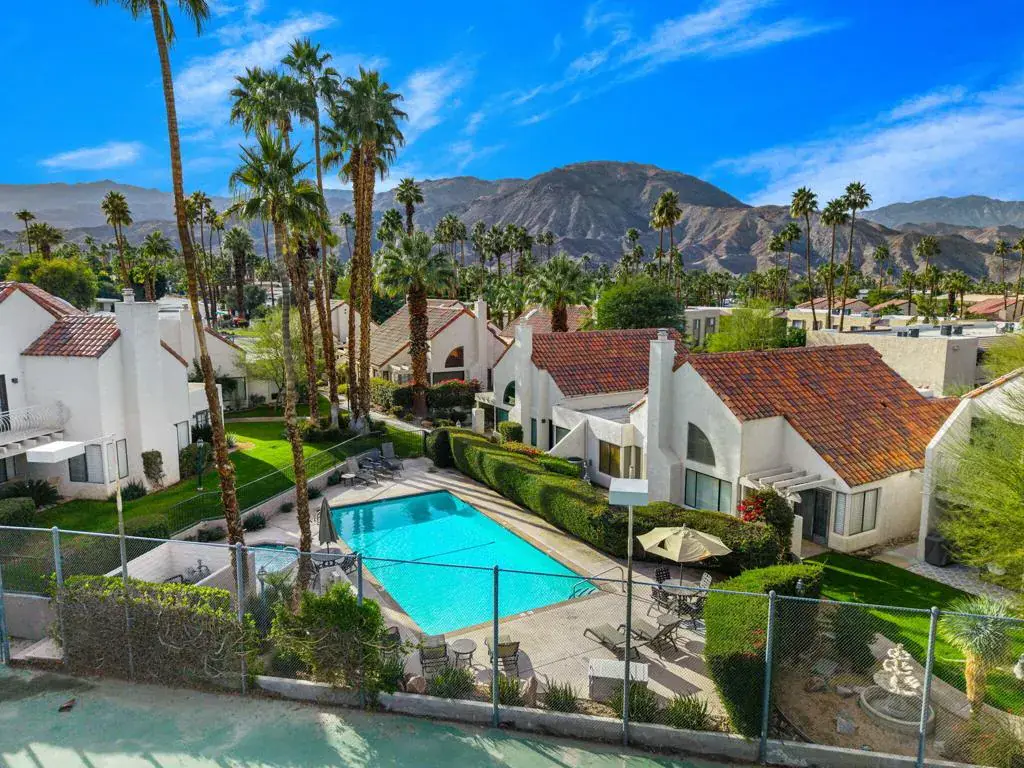 Step into your South Palm Desert escape! Just moments from popular El Paseo, this soaring, light filled Sandroc II home is ready to be your next desert address. Lock and leave convenience meets charming El Paseo living in this seldom available largest floor plan at Sandroc II, an intimate 20 home community just a half block from world class shopping and dining. Soaring cathedral ceilings, a dramatic fireplace, and walls of shutters create a sun splashed great room that feels both spacious and inviting, with French doors opening to front and rear patios for effortless indoor outdoor living. The flexible loft upstairs functions beautifully as a den, office, guest bedroom, or media room, giving you a true third room option without sacrificing openness. The generous kitchen is ideal for everyday cooking and entertaining, offering a center cooking island, breakfast nook, wet bar, tile counters and abundant cabinetry, plus direct sightlines back to the living and dining areas. Two main level bedrooms include a large primary suite with organized walk in closet and an ensuite bath with soaking tub/shower combination and skylight, along with a comfortable guest bedroom served by a second skylit bath. Thoughtful touches like neutral paint tones, classic Saltillo style tile flooring, plantation shutters throughout and a convenient laundry room make this home easy to enjoy from day one. All beds, some bedding and the contents of the kitchen cupboards remain with the property and are included in the purchase price; all other remaining furnishings may be purchased outside of escrow. Outside, two separate patios let you chase sun or shade throughout the day, with the rear patio overlooking the tennis courts and just steps to one of two community spas, while the front courtyard entry is perfect for morning coffee framed by mountain views and lush desert landscaping. Parking is a breeze with direct access single car garage plus covered carport right at the front door. Sandroc II owners appreciate low maintenance living with exterior landscape and grounds maintenance included in the HOA, along with access to two tennis courts, a sparkling pool and two spas in a resort like setting. This is an incredibly desirable South Palm Desert location close to hiking, golf and all the energy of El Paseo – equally suited for full time living, a desert getaway or a lock and leave retreat.
