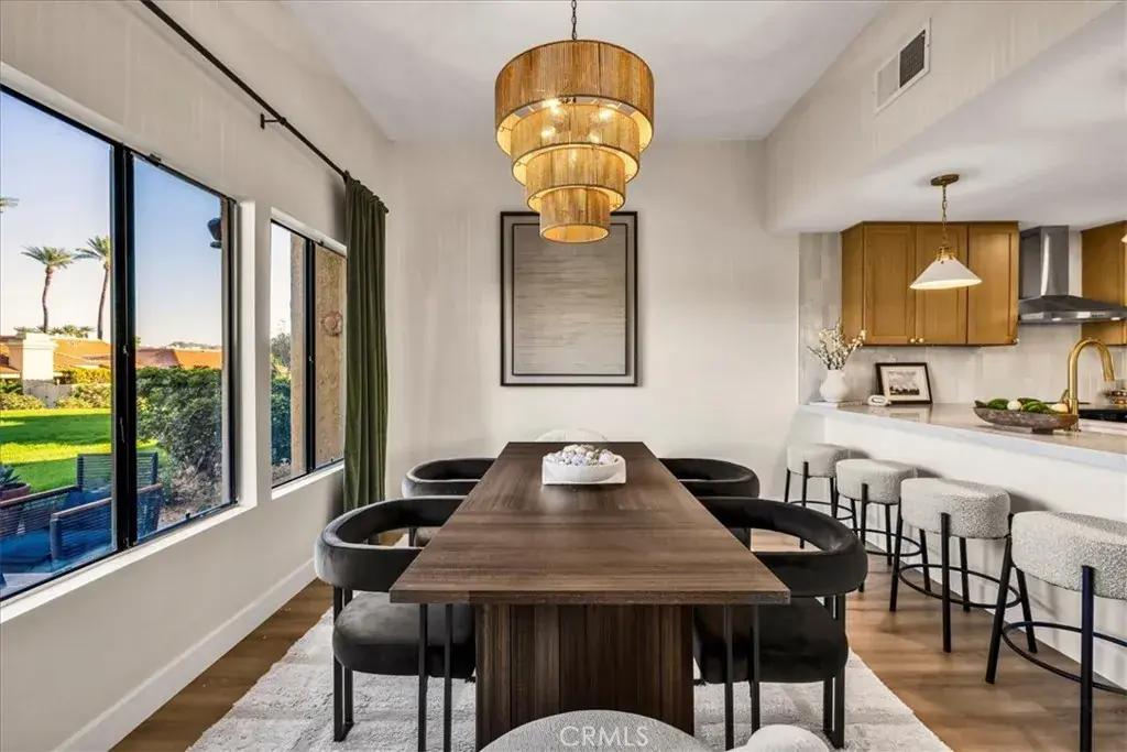 Inside, this fully renovated 2-bedroom, 2-bath home offers soaring ceilings and an inviting open layout. The living room connects effortlessly to the dining area, making the space feel open, bright, and perfect for gatherings. The kitchen is beautifully appointed with white oak cabinetry, stainless steel appliances, quartz countertops, and a peninsula with bar seating. A nearby bar area with a wine fridge elevates the entertaining experience.