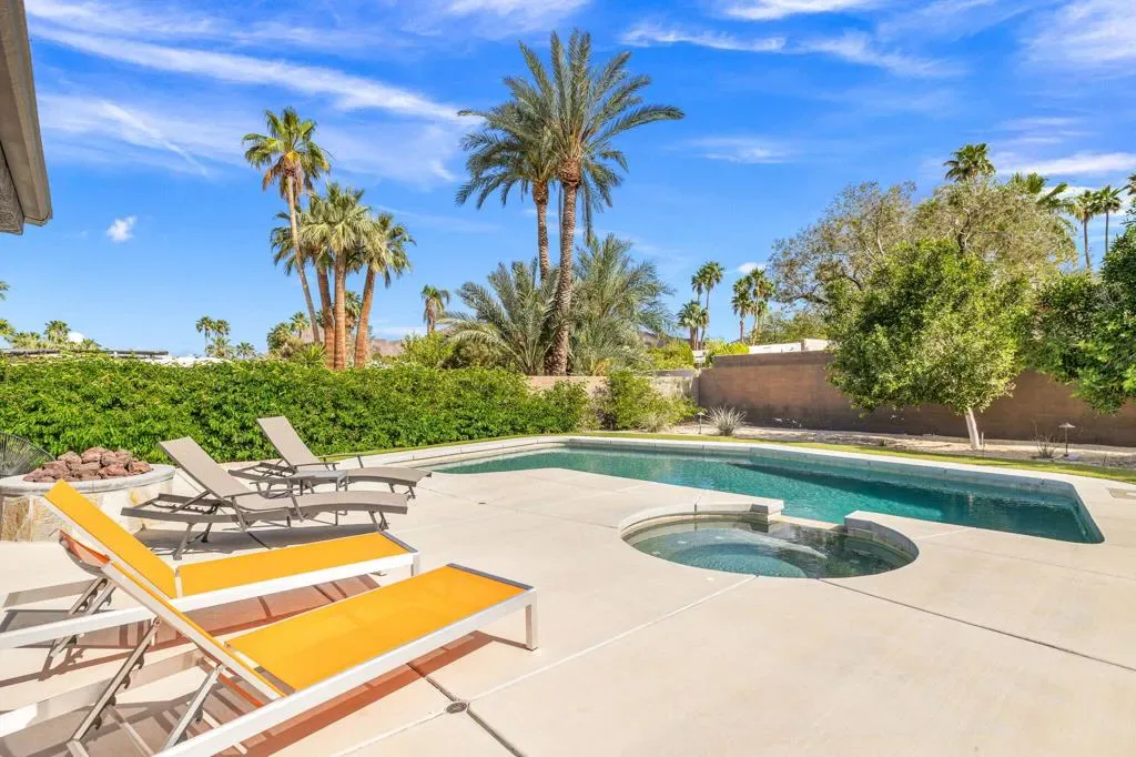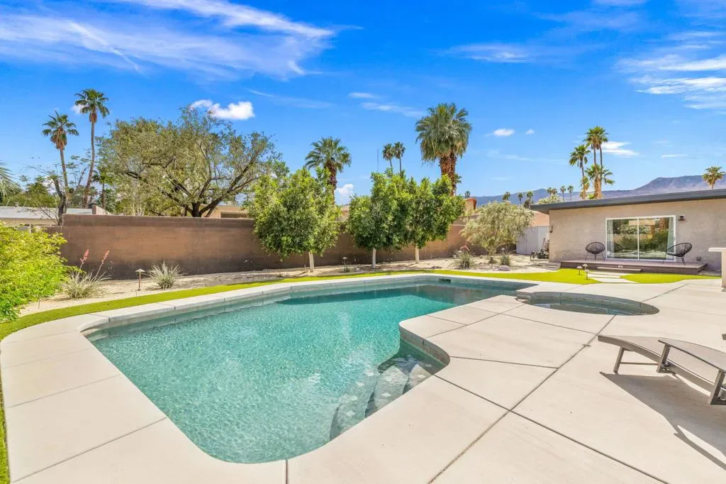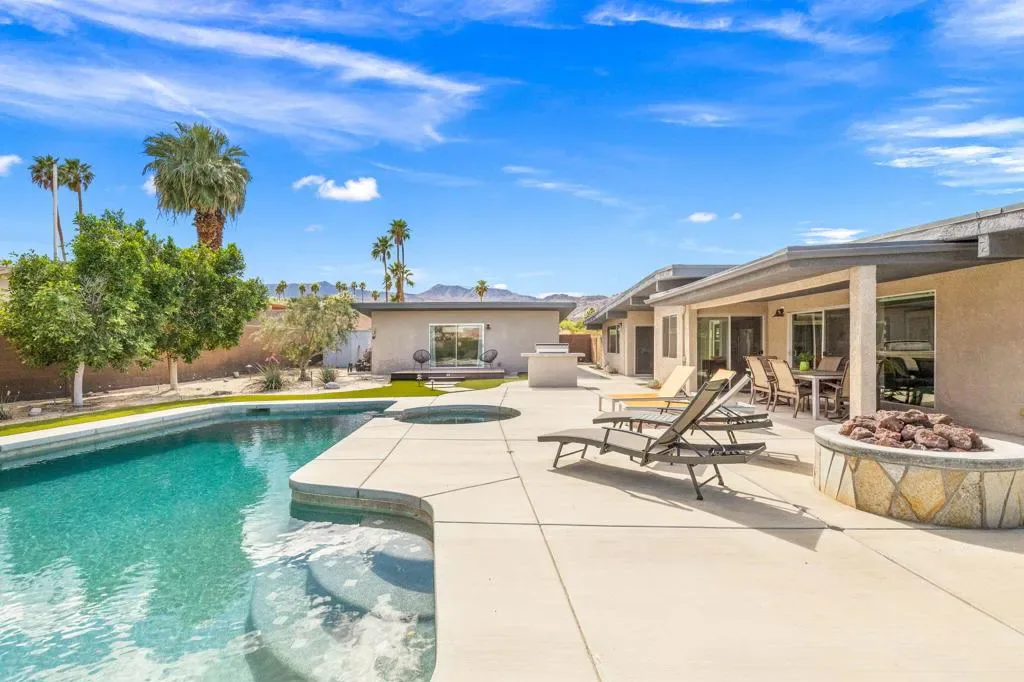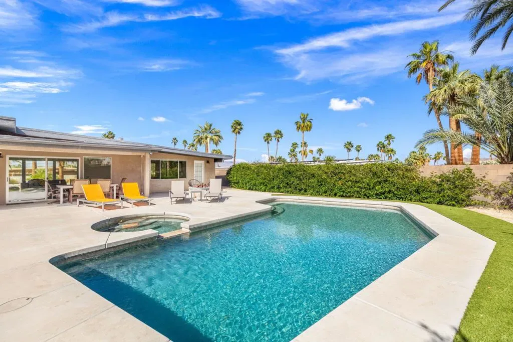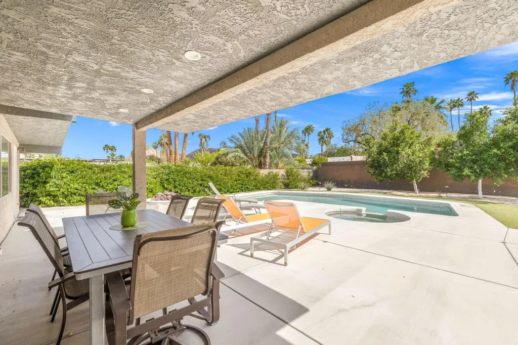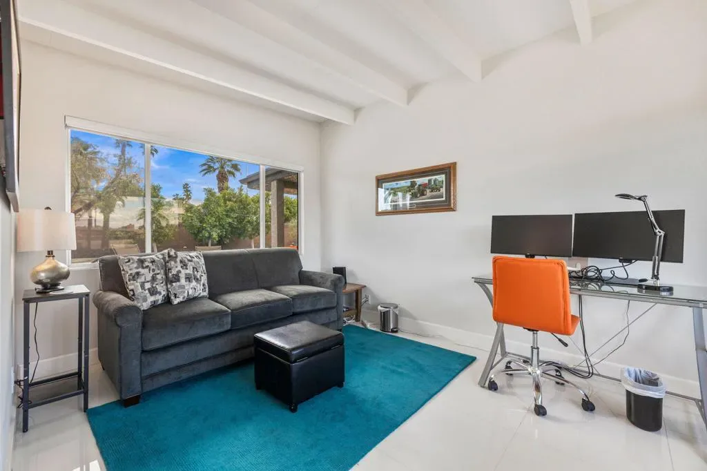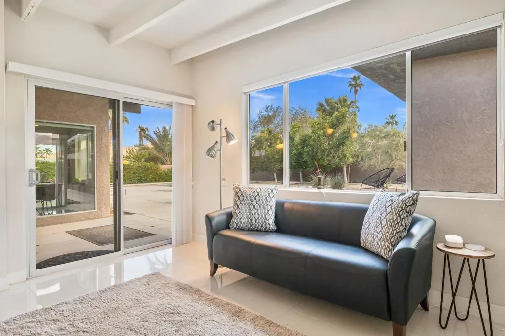 Available May-Sept 2026 at $4500/month, Oct-Nov 2026 at $6500/month, March-April 2027 at $9000/month. Now available for lease in the coveted Silver Spur Ranch neighborhood of South Palm Desert – where comfort, style, and location come together effortlessly. Tucked away at the end of a peaceful cul-de-sac and bordering Ironwood Park, this South-facing home offers a rare sense of privacy with beautiful open surroundings. The exterior sets a warm, inviting tone with natural redwood accents, a circular driveway, and updated Milgard windows and doors, all framed by mature palms and desert landscaping. Inside, the home has been thoughtfully refreshed with a clean, contemporary aesthetic that complements its Mid-Century roots. The primary suite features a king bed and the guest bedroom doubles as a flexible office space and includes a brand-new queen-size sofa bed perfect for visitors or working from home. A detached casita provides additional space with king size bed and ensuite bath ideal for visiting guests, extended family, or a quiet retreat. The backyard is designed for both relaxation and entertaining, featuring a saltwater pool and spa, built-in BBQ, and fire pit all set against a serene, private backdrop. The kitchen blends functionality and style with an island bar, breakfast nook, Thermador range, and Maytag refrigerator, while a solar system helps keep energy use efficient. Silver Spur Ranch is known for its character and charm, with a rich architectural history and stunning mountain views. This prime South Palm Desert location places you just minutes from El Paseo’s shops and restaurants, The Living Desert, top golf courses, and nearby hiking trails. Available for lease enjoy a beautifully furnished home in one of the desert’s most desirable neighborhoods.