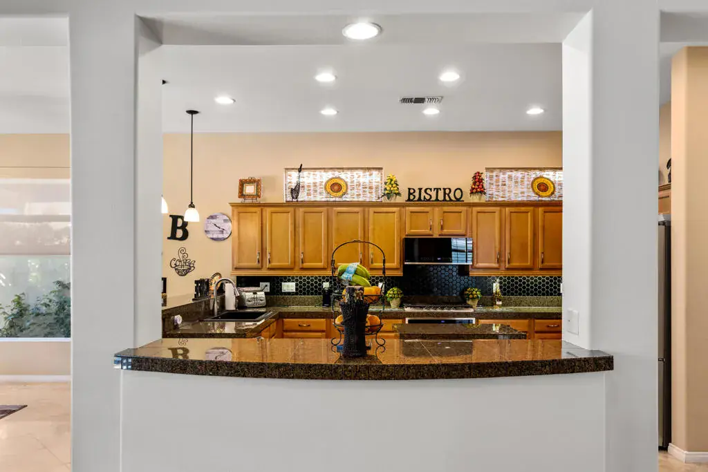 Wonderful 2,318 sq ft open floor plan Monterrey model. There have been many recent upgrades to this south-facing home including the house being painted in June 2025, as well as new appliances in June 2025, and NEW water heater! Great Room with fireplace and built-ins. 2 bedrooms + den/office, 2.5 bathrooms with the primary bright and spacious, with updated closet. Travertine tiles throughout the house with plantation shutters. Large eat-in kitchen with plenty of counter space, center island, granite counters, pantry, and lots of natural light. The backyard is very private and beautiful flagstone waterfall, terrific for entertaining. Includes BBQ, misting system, and has an Alumawood patio cover. Primary bedroom has French doors leading out to the back patio. The garage has epoxy floors, a ”mini split” AC, and a workstation. This house is located in the newer section of Sun City, built in 2003, and has been lovingly maintained. A great home in a great community with so many clubs and activities for you to enjoy!
