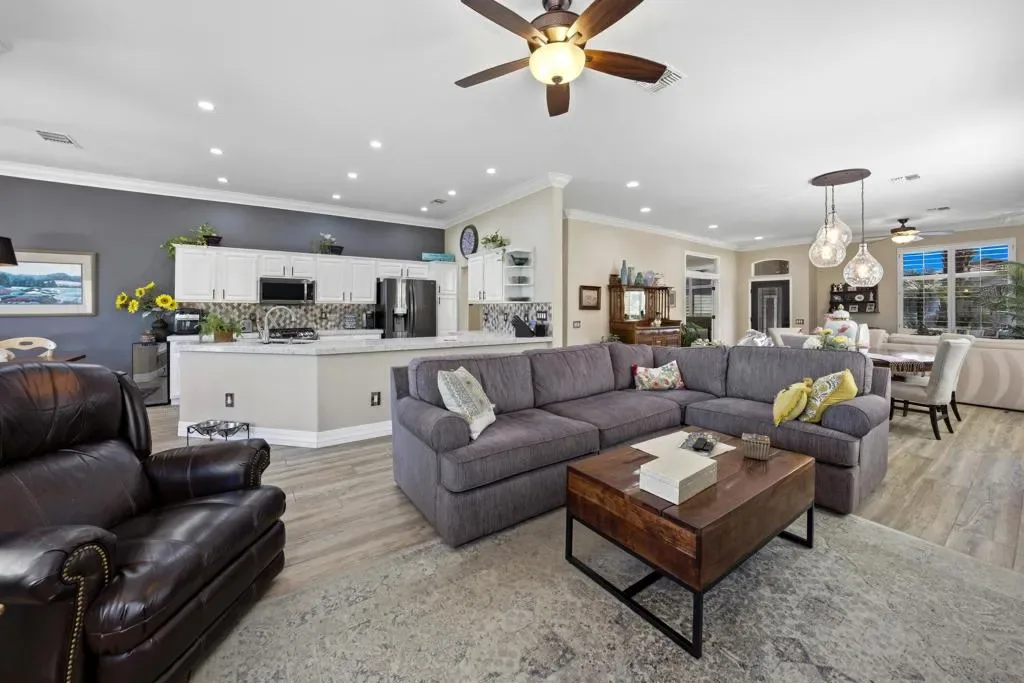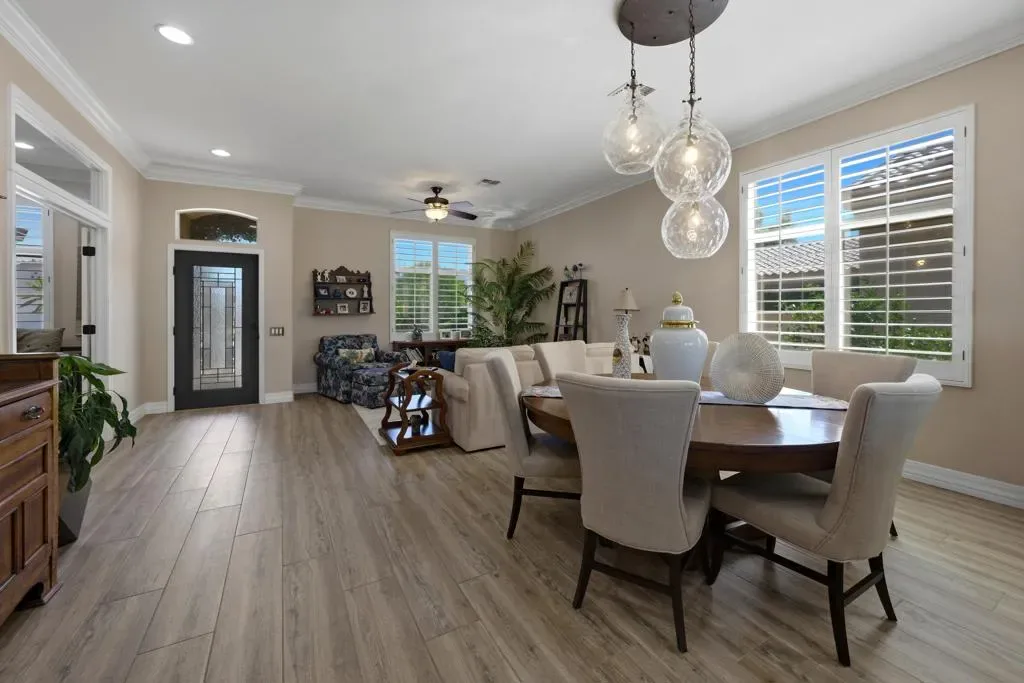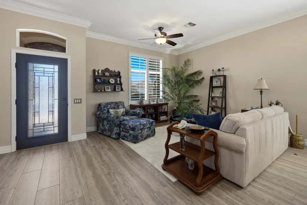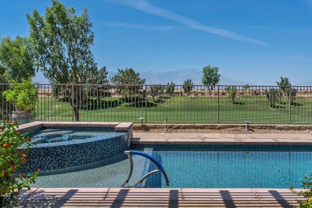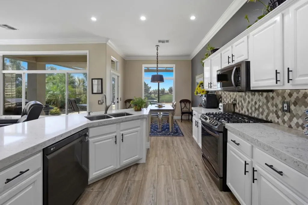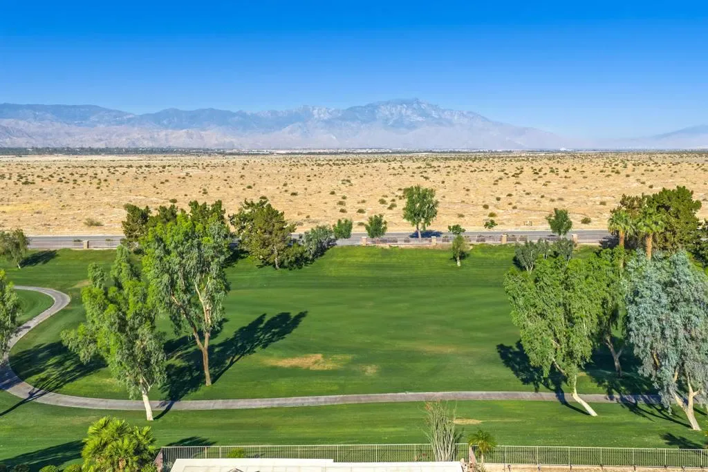 Sun City Palm Desert – Reimagined Casablanca. Perched above the golf course, this extensively upgraded Casablanca offers breathtaking panoramic views of the fairway and surrounding mountains, including the iconic peaks of Mt. San Jacinto, Mt. San Gorgonio, and Mt. Santa Rosa. The spectacular rear yard is designed for resort-style living, featuring a saltwater PebbleTec pool & spa with elegant glass tile accents, an expansive paver patio, alumawood patio cover, and electric solar shades–perfect for relaxing or entertaining while taking in the views. Exceptional curb appeal is highlighted by a leaded glass front door, decorative concrete, updated paint scheme, and lush desert landscaping with artificial turf. Inside, the home has been thoughtfully reimagined to create a bright, open environment. Wood-look tile flooring, 6-inch baseboards, and crown molding run throughout, while 10-foot ceilings, transom windows, and the removal of the wall between the living and family rooms enhance the sense of space and light. Shutters are featured on all but the view windows. The kitchen is both stylish and functional with quartz countertops, soft-close cabinetry with pullout shelves, mosaic tile backsplash, under-cabinet lighting, and stainless steel appliances. Double doors lead to the spacious primary suite, complete with French doors to the patio. The ensuite bath is beautifully upgraded with a custom floor-to-ceiling tiled shower, rimless glass enclosure, upgraded dual-sink vanity with granite counters, and decorative tile flooring. The guest bathroom continues the home’s quality finishes, offering an upgraded vanity, granite countertops, custom tiled shower with rimless glass, and updated fixtures. The guest bedroom features a Murphy bed that also functions as a desk, maximizing versatility. A dedicated office with French doors provides additional flexible space. The laundry room offers ample storage, and the two-car garage includes an epoxy floor and a golf cart parking nook. This is a rare opportunity to own a truly reimagined home with exceptional indoor-outdoor living and some of the best views Sun City Palm Desert has to offer.